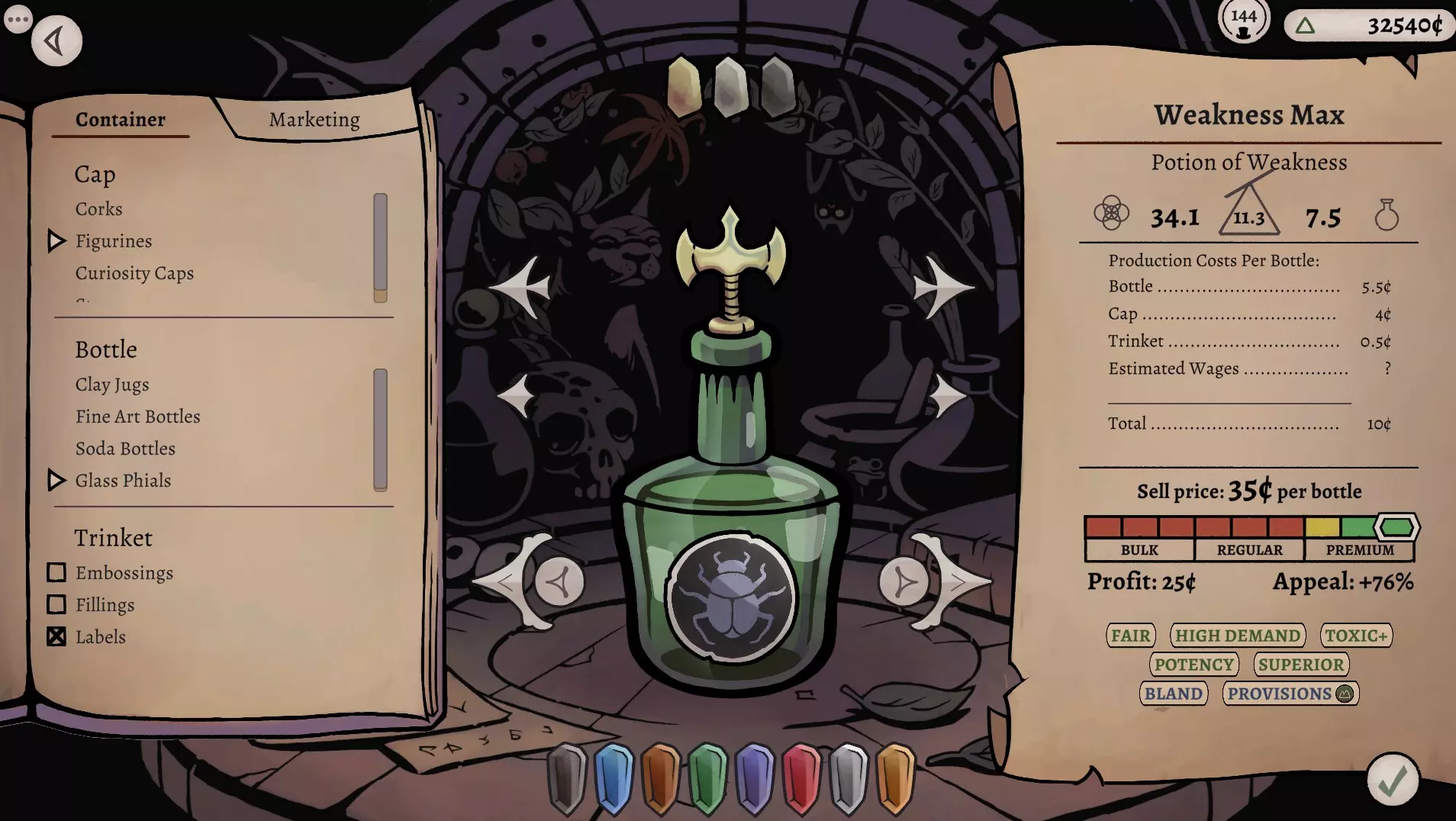 下图展示了炼金界面的第二页。我只会添加一次,因为我为16种药剂都使用了相同的瓶盖、瓶子和小饰品,以优化利润。