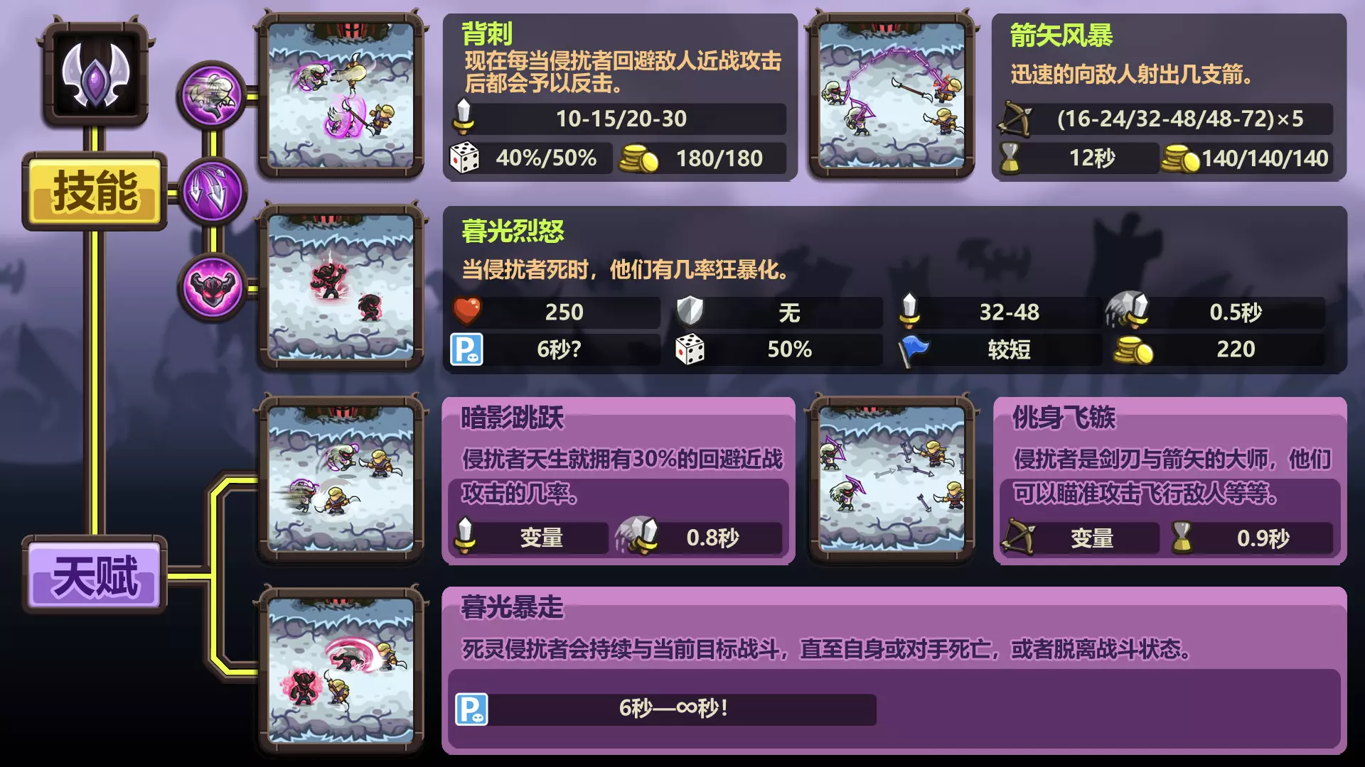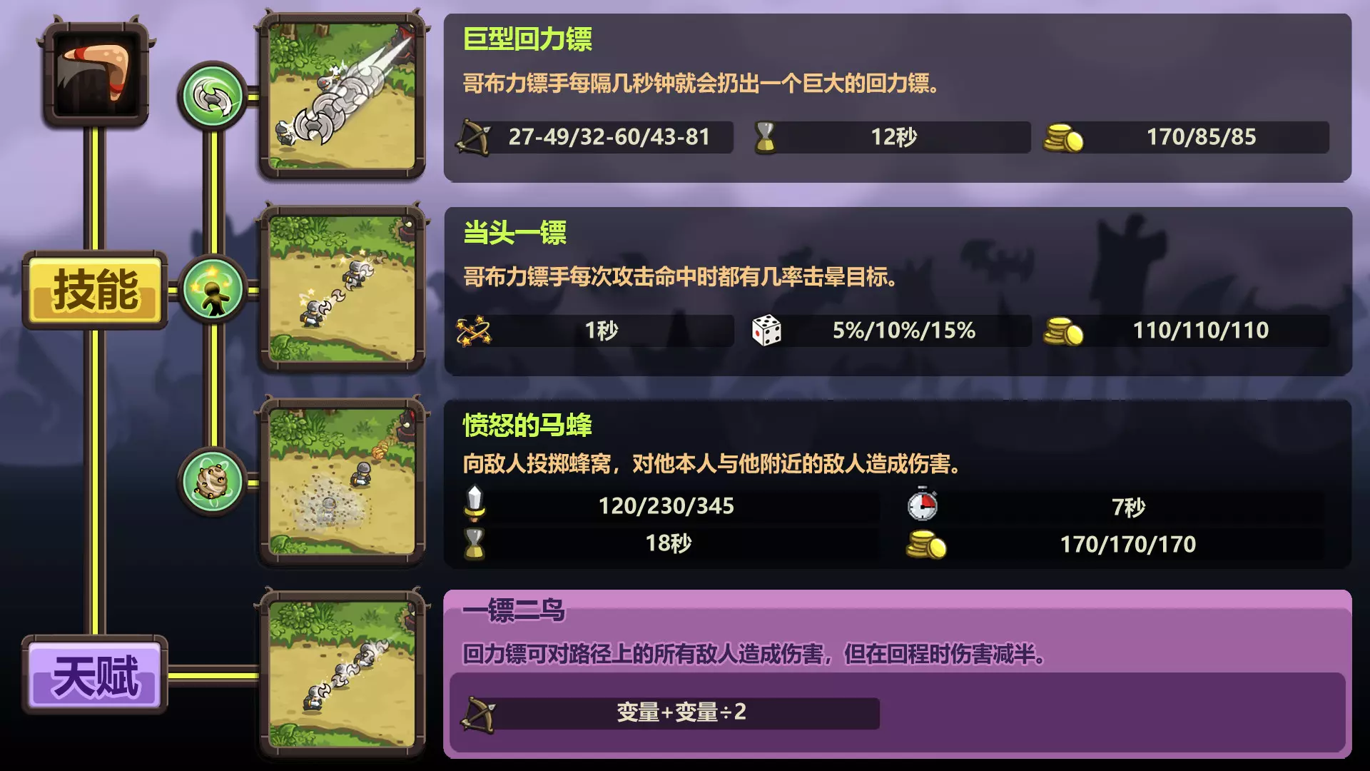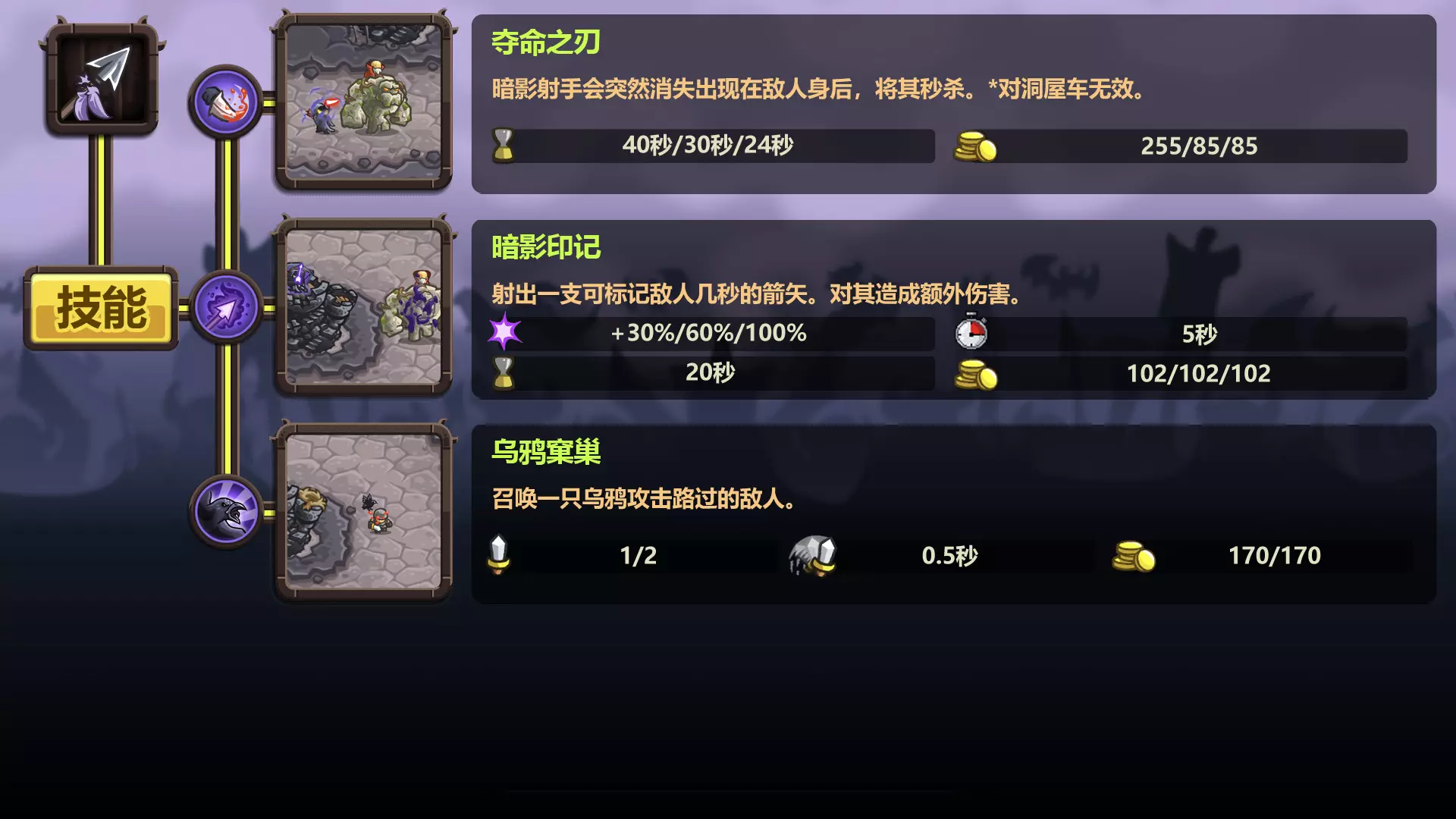 这是玩家自制的《王国保卫战:复仇》防御塔图鉴,数据来自wiki,展示了暗影射手塔、兽人勇士巢穴等多款防御塔的等级属性、技能、射程等详细信息,为玩家了解和使用这些防御塔提供参考。