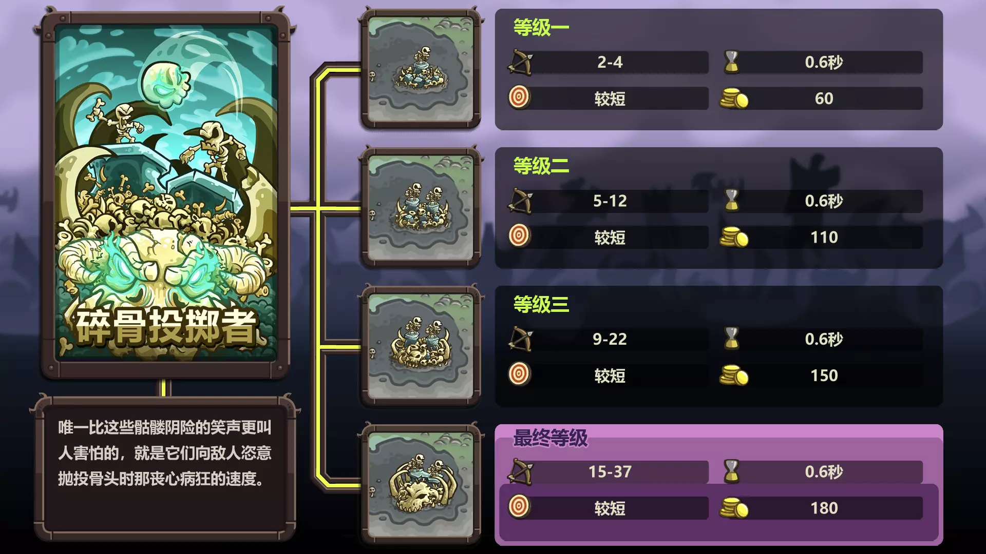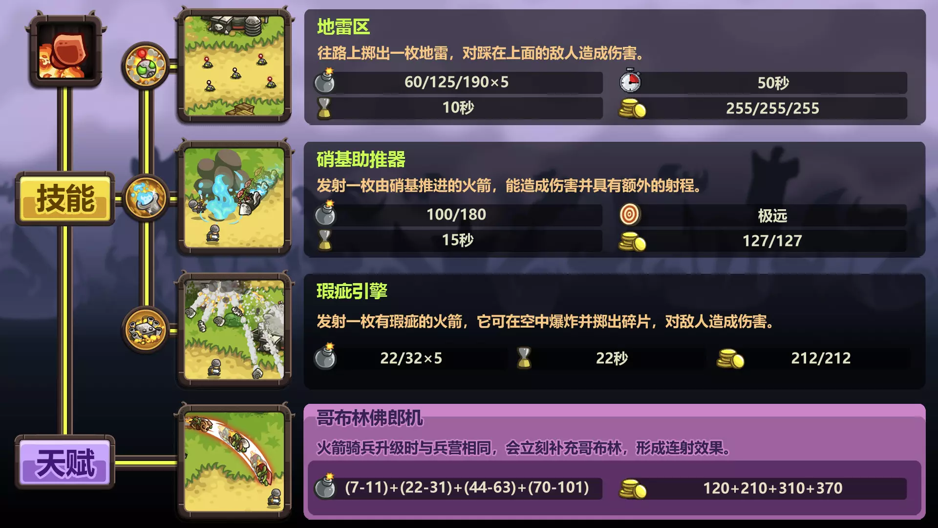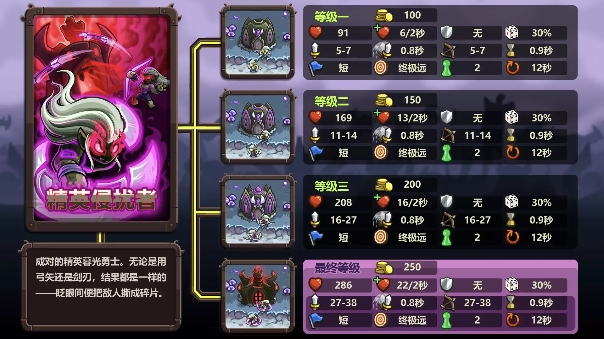 这是玩家自制的《王国保卫战:复仇》防御塔图鉴,数据来自wiki,展示了暗影射手塔、兽人勇士巢穴等多款防御塔的等级属性、技能、射程等详细信息,为玩家了解和使用这些防御塔提供参考。