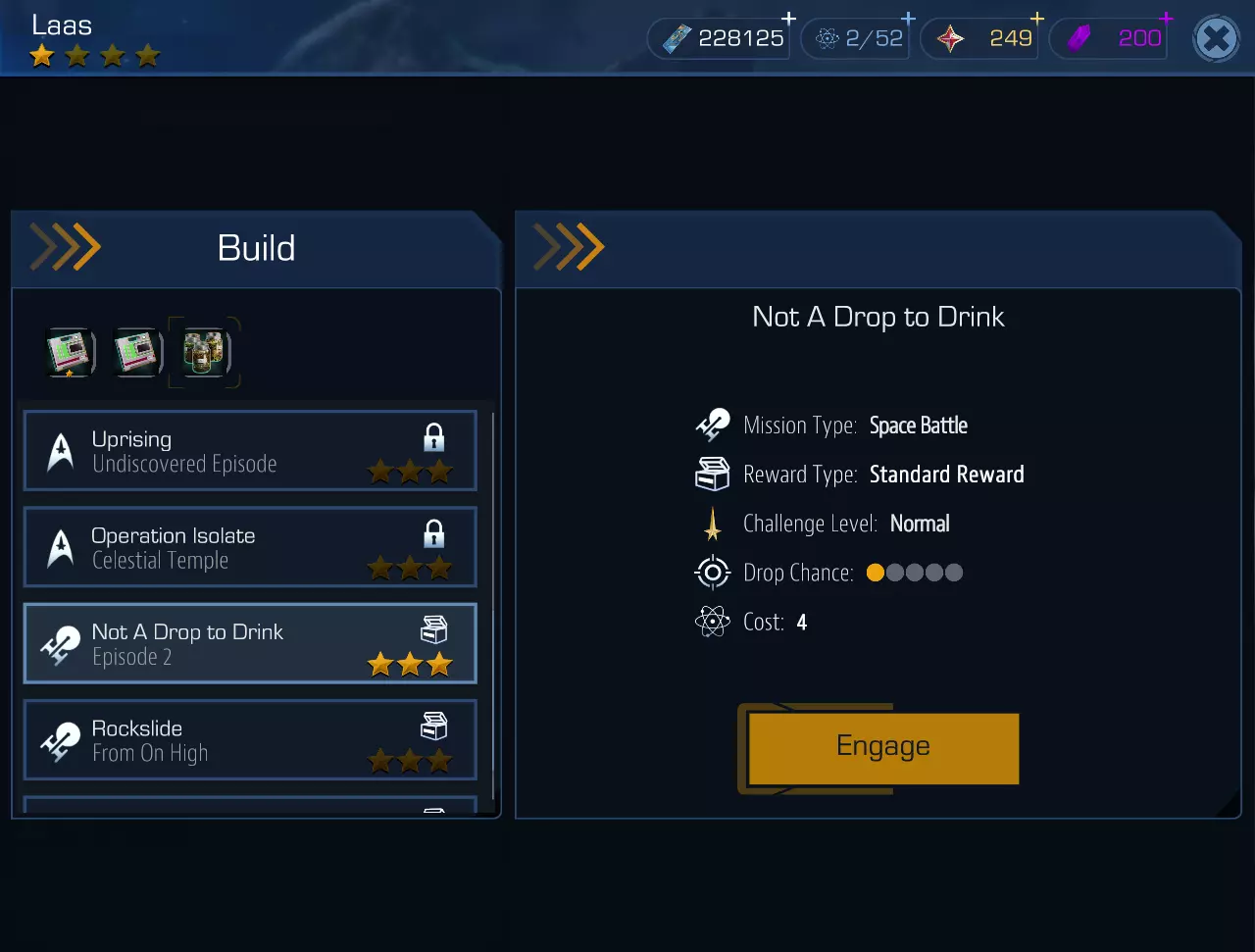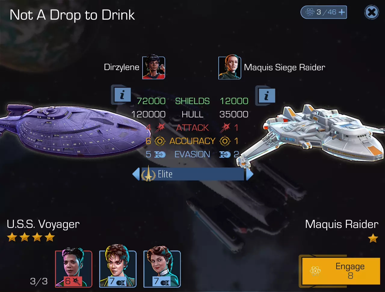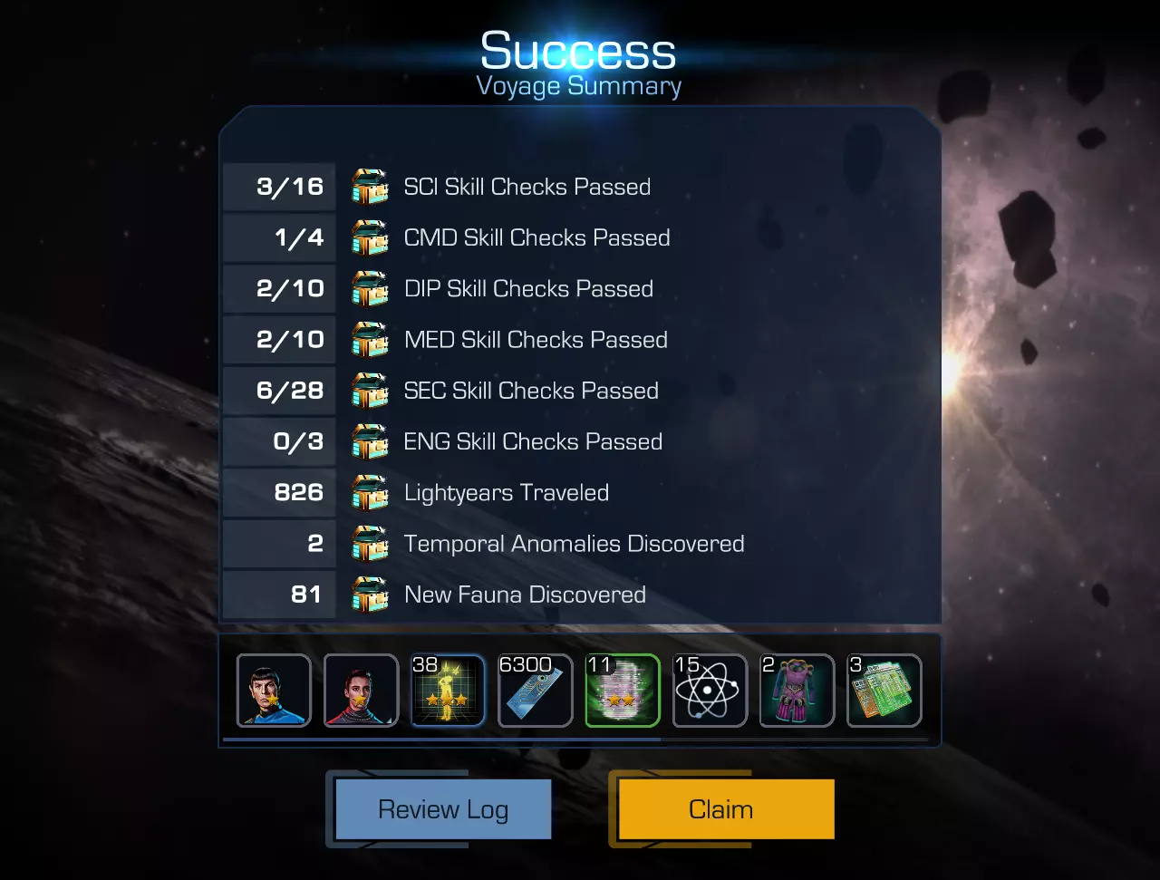 它们也就是【航行任务】。这并非强制内容,但却极其有趣……好吧,至少前二十三次是这样的 :)。其核心玩法是:你选择自己的飞船,分配船员岗位——在这里你可以自由发挥,甚至可以让马托克担任首席医疗官——然后你需要为自己的飞船命名(例如“安克·莫尔波克的骄傲”“以克洛诺斯为荣!”或者其他名字),接着……出发!(不需要输入“撞击者”的坐标。)在飞行过程中(实时进行,无暂停——除极少数情况外),你和你的船员会遇到各种记录在航行日志中的事件,既有家庭日常类的(例如,马尔科姆·里德中尉和塔莎·亚尔发生了一场毫无意义的幼稚争吵,争论“谁能抓住谁”),也有外部的科学冒险类事件(例如,在小行星上发现了类真菌生命形态,帕兹拉中尉开始对其进行)研究)。每个外部事件都有可能(也可能不会)为你的机库带来: - 新的船员(很可能只有“一星”船员); - 信用点; - 各种物品和资源; - 训练全息程序; - 以及……【鼓点声】……时间晶体(没错!); 所有这些都很棒、很好也很有趣,但和往常一样,有一个问题…… 反物质。你进行长途星际旅行所需的燃料(在剧情范围内的常规移动,例如阿尔法象限内的移动是免费的)。上述每个事件都将消耗一个单位的燃料。而你的燃料储备并非无限——它取决于飞船类型、飞船等级以及其他一些因素。初始的星座级(1星)飞船的反物质储备仅为1100(这非常少)。我的无畏号(4星)有1850,但考虑到船员经验不足(我目前没有任何高于30级的船员,而且几乎一半是20级和10级的),这也不够……顺便问一下,这和船员有什么关系?关系可大了。 除了上述事件(总体来说是和平甚至有趣的性质)之外,还存在所谓的“危险”(hazards)。情况变得更严重了——曲速核心冷却系统出现破裂、货舱遭遇袭击、太空怪物发动攻击、不知被谁丢到仓库的禽流感病毒容器,以及诸如此类的麻烦事。如果你的船员成功应对了威胁,你将获得额外5单位反物质(别问我“为什么”,关键是“从哪来”和“谁给的”)。如果失败,你将损失30单位反物质。众所周知,没有燃料储备,飞船就无法飞行;即便是在《星际迷航》中,即便是柯克的飞船也不例外,更不用说我们了。 空间跃迁的来源和组成部分