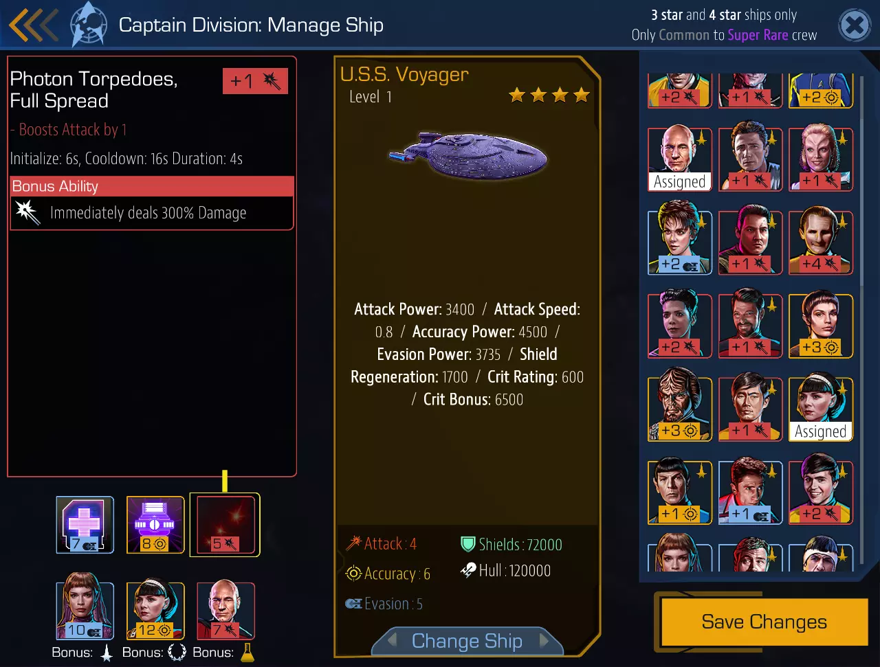 如您所知,您的角色同样拥有太空战斗技能,现在我们将对其进行详细介绍。 1. 主动技能:可提升飞船三项基础属性中的一项——攻击(伤害)、精准(命中率)和闪避(躲避率)。 2. 被动技能:其中两项可额外强化精准和闪避,另外两项则与暴击伤害相关——暴击加成(暴击伤害强度)和暴击等级(暴击几率)。不过有一点需要注意——要让被动加成生效,必须将角色严格分配到与其专长相符的岗位上。或者简单来说,要严格对应相应的模块,就像图片中所示的那样。 注意:部分角色的加成会伴随着降低舰船其他属性的数值。例如,闪避可能会+5,但在激活攻击时会-2。所以请谨慎选择。每艘舰船也拥有其独特的属性——护盾容量及其恢复速度、装甲强度、攻击力、暴击强度和暴击几率。此外,舰船还具备某种特殊能力。例如,正如你在截图中所见,我的“无畏”级“阿斯特拉”号在发动攻击时,除常规伤害外,还会造成一次300%的额外伤害。顺便说一下,部分角色也拥有类似的额外能力——比如斯波克(来自那段众人长时间寻找他的时期)在战斗中可以两次提升600点护盾恢复速度。 每次战斗前,你都有机会思考,对比己方与敌方舰船的可见属性,将军官指派到战斗岗位,或是将他们从一个战斗位置重新分配到另一个。好吧,或者干脆决定稍后再捕捉这只“老鼠”。 第三部分:任务。