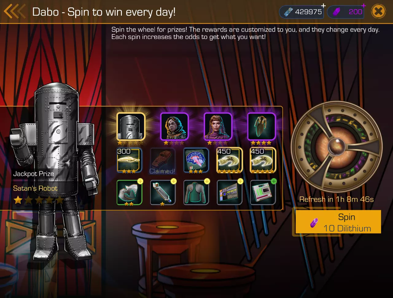 学员训练 每天您有六次机会参加训练——莱克上将将为您提供任务背景,您需要带领自己的船员完成训练。乍一看这似乎是普通的任务流程,但别忘了这可是莱克,他可不会轻易让您过关……每天都会有特殊的额外条件。例如,周日您只能使用【稀有】品质的角色,且这些角色必须是非人类。周一招募的是“灰色”和“绿色”品质角色,但他们的履历中必须有宇宙舰队服役记录。周四的招募条件和周一相同,但“只招女性角色”。不,我都说过了——一个瑞克已经太多了…… 游戏内活动 游戏中会定期举办全银河系范围的在线活动(或者说是任务)。例如,我们遇到过这样的情况:需要在特定的剧情条件下帮助三个派系(罗慕伦、克林贡、巴乔尔)中的一个获得优势。而帮助他们的方式是制造各种仪器、设备和文化遗产——就像你为角色收集物品时所做的那样。完成特定的收集任务可获得奖励;简单来说,奖励有时是稀有角色,有时是游戏货币,越往后奖励越丰厚。但总会或时不时出现大家喜爱的【时间晶体】!不过,收集制作所需资源本身也需要花费不少时间晶体。 活动结束后也会有奖励……当然,至少是给那些支持获胜方的玩家的——我在这方面经验还不多。舰队与基地建设。无论你是组队游玩还是单人游戏,都可以创建舰队公会并开始建造属于自己的宇宙基地堡垒。基地的不同区域能提供各种加成。从开始建造起,你会通过任务获得特殊资源,这些资源可用于升级单个区域或同时升级多个区域,但所需材料数量较多。如果不是人多拥挤,请耐心等待。 “大宝!”每天花费五千信用点,你就有机会试试运气,转动大宝轮盘。奖品丰富多样,每天都有新惊喜,其中还包括头奖。今天,如你所见,头奖是混沌博士的恶魔机器人,这可是佩雷斯中尉和我的另一半都非常喜爱的物品。 第九部分:付费方式