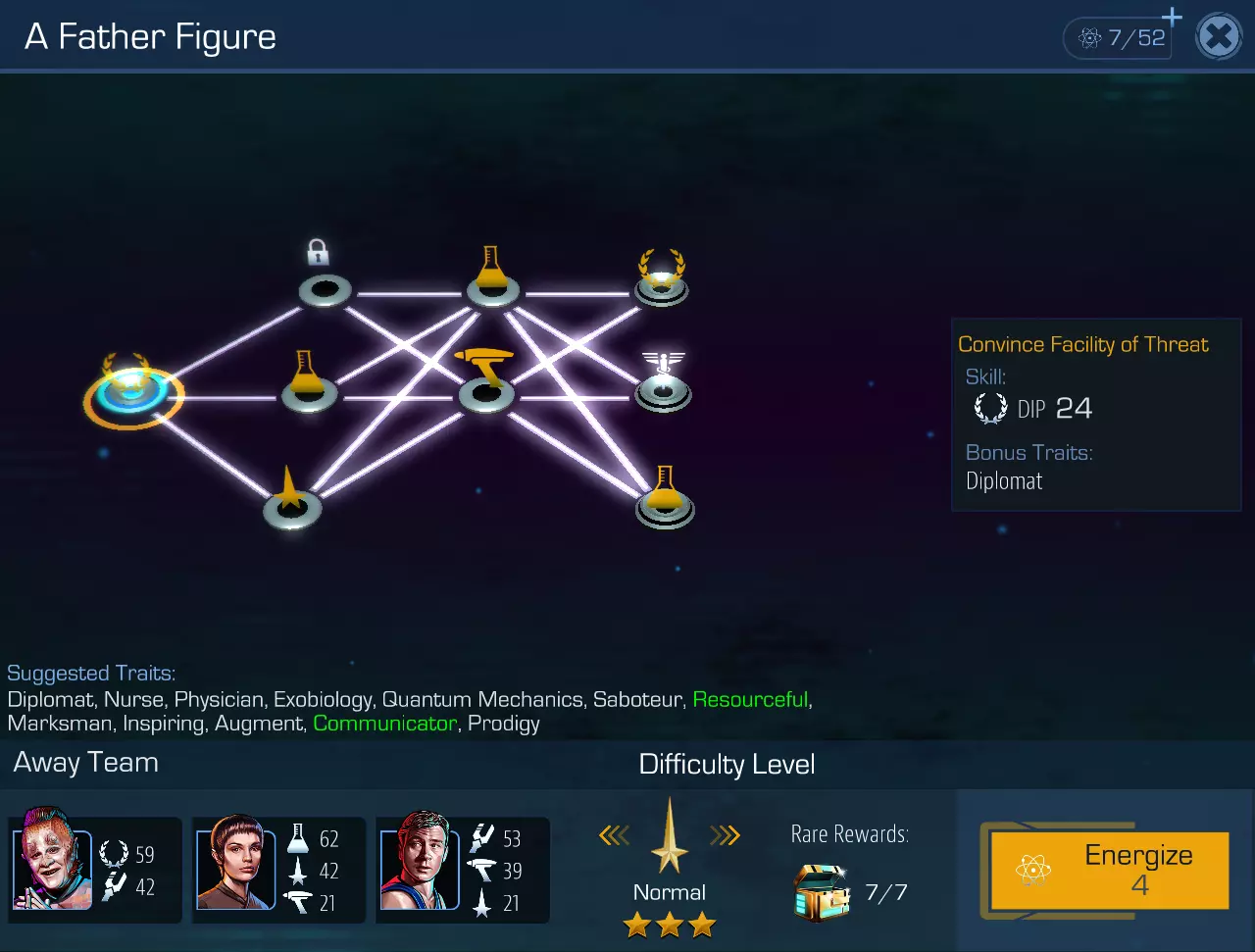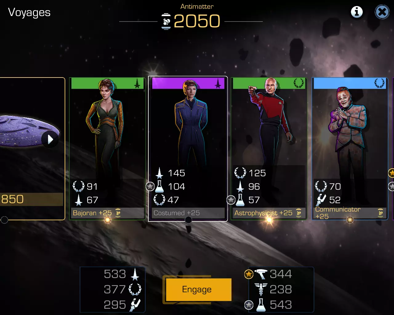 那么,成功克服困难、战胜挑战并完成关于联邦原则的演讲,取决于哪些因素呢? 在组建远征队时,请仔细查看飞船船员的综合(总计)专业属性——这些属性越高,通过考验的几率就越大。但要注意——离母港越远(即航行时间越长),危险就越严重。大约10分钟就能达到150-160级;在探险的第二个小时,即使是500级也无济于事。这说明在初始阶段,你在空中停留的时间很难超过一个小时。 除了飞船的星级和船员等级,还有什么方法可以提高成功率呢?这时太空舰队指南来帮忙了……更准确地说,是坐在办公室里的 admiral 们的第三只左后腿上的第五片鳞片,以及由此产生的即兴幻想。组建船员队伍时,请注意职位栏底部的说明——看到了吗,那里写着“瓦肯人 +25”“天体物理学家 +25”等等?这意味着,例如,如果您在战术官职位上安排的不只是某个具备一定安全技能的船员,而是同时拥有“卧底特工”这一背景标记的船员,那么您的燃料储备将额外增加25单位反物质。这里二十五,那里二十五,又是二十五——可以找到三百多个多余的单位,甚至更多。 请注意,所有这些针对特定职位的额外要求都不是固定的——今天办公室里的闲人希望你在通讯官岗位上安排一名卡达西人,明天可能就换成走私者了。所以,童子军和少先队员的座右铭能帮到你。回到之前的话题——关于选择谁、留下谁、培养谁,我再说一遍:凭心选择就好。因为根本无法预测,究竟哪种技能组合会在何时(尤其是在一周中的哪一天)对谁有利。当然,很明显——如果你缺乏医疗人员,那么无论你多么幻想在自己的舱室里与七号舰员和反凯洛进行三人行,无论你多么痛苦,你都必须做出选择,不是选择令人兴奋又危险的七号舰员或“恶魔般的”凯洛,而是只能选择谦逊而羞怯的贝弗莉·克拉希尔。游戏归游戏,但船员需要治疗。 不过,关于探险任务,一如既往,有优点也有缺点。即使是在训练均衡且水平相当的船员中,你通常也需要在专业技能等级较高的专家和那些在技能上稍逊一筹但能提供额外燃料加成的船员之间做出选择。所以,请自行决策和选择,每个人都有自己的战术。不过,由于麻烦往往出现在标有金色和银色星星的部门,因此请务必优先关注这些部门。最重要的是
