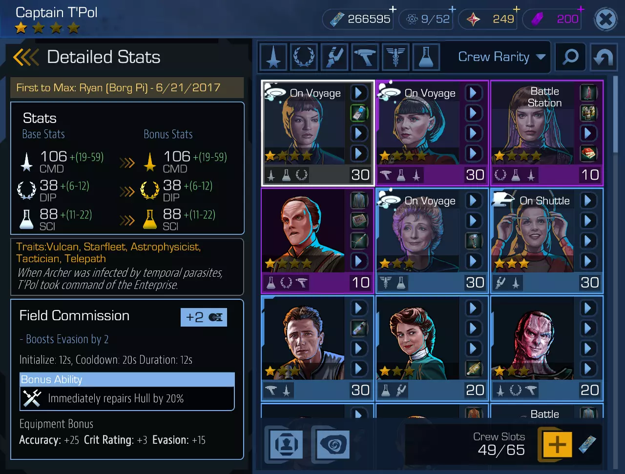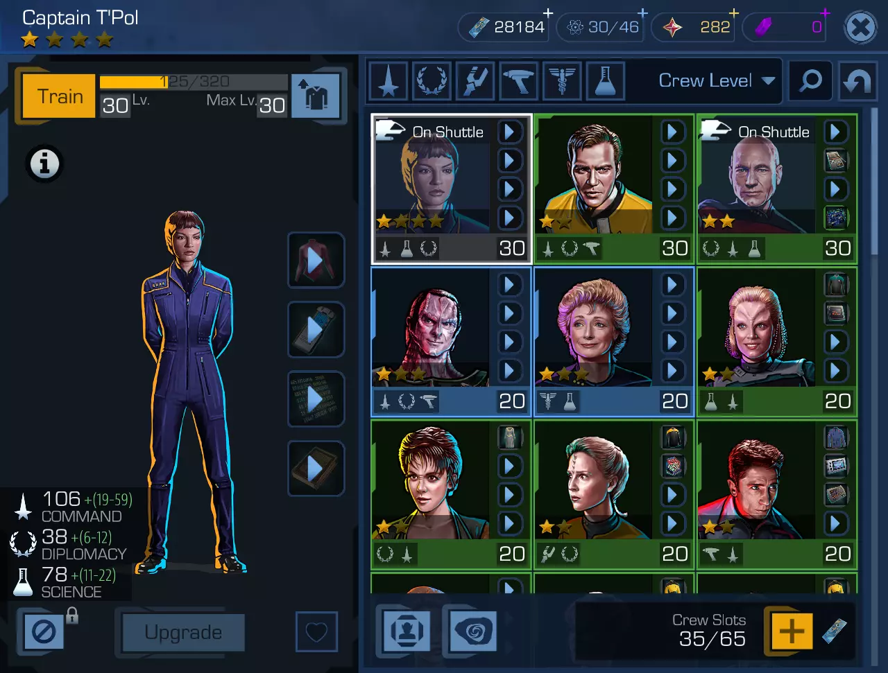 与大多数在线游戏中的道具类似,角色也有稀有度分级,其特征是肖像背景颜色不同——从白灰色(普通)到紫色(超稀有);并用星星标记——从一颗到四颗。 是的,还有传奇级别的“五颗星”金色角色!不过,你主要不会在自己的队伍中看到它,而是会在阵营游戏商店里,标价后面跟着一长串零,或者在轮盘赌的“累积奖金”区域。不过,可以说概率论是站在你这边的。 最初的几名船员几乎会立刻送给你(毕竟,总得想办法教你玩游戏)。在这种情况下,你可以: - 解雇他(奇怪的是,执行此操作会获得一定数量的荣誉点); - 或者将其留下,例如留下《星际迷航:原初系列》时期的第二个史波克(如果不忍心解雇的话)。 角色物品,也就是装备,不仅关乎美观和对系列中特定剧集的怀旧回忆(所有适合特定角色的物品都与其有剧情关联,并且在叙事中至少被提及过一次)。真正的星际迷航游戏就是这样制作的!增强船员能力的手段,以及最重要的——突破等级上限。最初角色只能升到10级。要让他能够达到例如20级,需要填满他所有的四个物品栏。此时右上角的按钮(带有箭头的服装图标)将被激活,点击该按钮后,你可以消耗辛苦收集的剧情记忆,将等级上限提升至20级。依此类推。从长远来看,这个过程耗时较长,但充满了对已观看剧集、剧情转折的回忆以及不小的刺激感。物品可以通过任务获取、作为奖励获得、从资源和零件(即其他较低级别的物品)中收集。当然,你说得对,还可以在复制器中从头合成。这里有几点需要说明。 第一,复制器每天只能使用一次(当然,如果你没有购买VIP的话)。第二点——说来也奇怪,他了解【罗蒙诺索夫-拉瓦锡定律】(或者至少了解恩培多克勒的著作),不会凭空变出东西。你可以用仓库里的任何物品作为燃料。我强调一下——任何物品,哪怕是“教学材料”也可以。这合乎逻辑——毕竟它们不只是普通的游戏内卡牌,也不是货币,而是实实在在的教学录音(不过,不清楚为什么是一次性的——它们又不是克林贡咒语?)。顺便说一句,在某个时候(但不是一开始!)不妨把它们当作复制器的能量补充来使用——将来你拥有的录音会比需要培训的人员多得多。第三点——复制器,说来也奇怪,它的运行需要付费,费用从300信用点到……嗯,具体金额不等。如果联邦早就实现了共产主义社会,人人都过着幸福的未来生活,那为何还会有这种价格波动呢?这实在让人费解,但我们姑且将其归咎于游戏设定吧。 注意:有时会出现快速建造选项,也就是把中间组件的建造工作交给人工智能处理。所需金额可能看起来偏高,但这只是错觉:如果逐步操作并仔细计算,会发现并没有多收您任何费用。所以请放心使用。但要记住——在花费预算时,始终要为复制器预留几千单位的资源。 船员的空缺位置与物资仓库的空间不同,并非无限——初始阶段您只有65个(没错,我没说错,就是65个)。可以使用游戏货币(250000游戏币增加5个船员位置)或迪利钛水晶来扩展人事部门的容量。迪利钛水晶也是一种游戏货币,但需要用美元或卢布购买。根据星际迷航时间线维基的信息,截至今年2月,最多可开启370个船员位置。 第二部分:舰船在某些情况下,你甚至需要学会做出艰难的决定,因为你必须从几个选项中选择一个。这时候该怎么建议呢?由于你的船员目前勉强能组成一个小型穿梭机的团队,候选人的知识和参数完全不重要——我的建议是,凭心选择。这在当前船员名额即将用尽,需要考虑解雇谁、留下谁的时候,确实值得做。 角色属性:每个角色都拥有一项或多项专业技能。通常情况下,即使技能很多(我没见过超过三个的),也往往有一个是主要技能。每个技能都由基础值(该角色等级下的固定值)和附加值(奖励值)组成,附加值会在特定时刻随机赋予,但处于明确范围内。 还有个人特质,可简称为“角色的背景信息”。包括其种族、服役经历、专业科学倾向、性格特点或先天属性。这些在任务中都会发挥作用。此外,还有一些在太空战斗中具有重要意义的技能——我们将在相应章节中对此进行讨论。船员的具体能力由以下因素构成: - 等级(1至100级); - 稀有度(从普通到传说); - 当前星级评分(即潜在可能中已激活的星星数量); - 角色装备(装备带来的加成); - 舰队太空基地的当前等级(这一点后续会详细说明)。关于等级,一切都和往常一样,角色通过任务(登陆任务、太空战斗、派系任务或使用训练全息程序)获得经验值,等级随之提升。而星级的提升则更为复杂。有两种方式可以“填充”星级。第一种是使用游戏货币【荣誉值】(honor)购买特殊代币【荣誉奖状】(honorable citation)。第二种……没错,第二种方式很有趣。正如你所知,我们这里正经历着时间末日;而且很有可能,当你的队伍中已经有一名早期皮卡德时代的瑞克(两颗星,一颗激活)时,你会遇到(获得、赢得)另一个瑞克,但却是完全相同的。那么你要两个完全一样的瑞克有什么用呢?在我看来,一个都嫌多。你点击【升级】按钮(左下角),然后……就能将两个瑞克合成一个,但可以说,这个合成后的瑞克拥有更高的潜力。当一个一星角色加入你的队伍,而你已经拥有该角色时,自然无法将他们合并为一个。