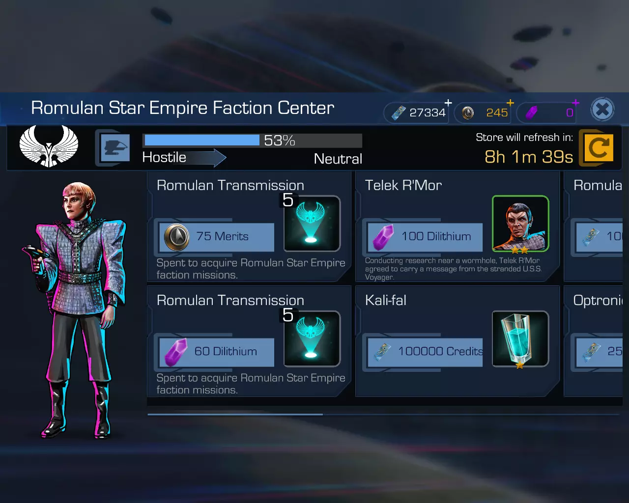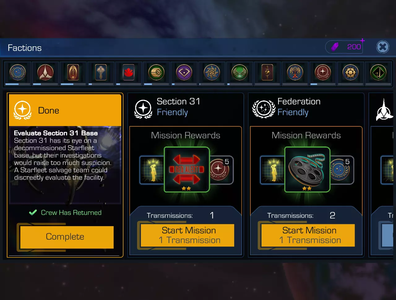 在游戏中,除联邦外,还有众多势力参与其中,既有大家非常熟悉的克林贡帝国、贝久等,也有来自“邪恶”的镜像宇宙的势力—— Terran帝国和卡达西-克林贡联盟。甚至还有 Ferengi传统派(其领袖自然是清算者布兰特)。第31区和强化人也拥有自己的势力(以及作为核心的星球),这一点或许会让人感到意外。你会和某些角色一开始就建立友好关系(猜猜是哪些角色),而另一些角色从一开始就对您怀有敌意。不过,也有一些角色保持中立态度。然而,就像这类游戏中常见的情况一样,与所有角色建立友好关系是明智之举。即便您是卡达西优越……嗯……理念的坚定支持者,不喜欢巴乔人,并且(与盖拉·杜卡特不同)甚至不喜欢巴乔女性,那我也要告诉您一个坏消息。如果你的船员中仍然有……好吧,就算没有贝久人,至少有康斯坦布尔·奥多这样的角色,那么你就不可避免地需要提升与先知族民众的声望。说真的——即使你看到他们现在的领袖温·阿达米就感到反感。因为除了在贝久星,奇怪的是,你无法获取或购买贝久物品。其他派系也是如此。无法随意接取某个势力的任务,需要带有订单的空间传输信号。这些信号可以通过扫描获取(每三小时可扫描一次),也可以在势力商店用特殊游戏货币功勋值购买(不用担心,每日完成日常成就就能获得)。此外,还可以通过穿梭机从势力任务中带回作为战利品。每个任务的机制与《魔兽世界》中德拉诺版本的任务机制类似,完成任务需要具备特定专业技能的船员(1至4名)。与《魔兽世界》不同的是,还需要空闲的穿梭机。通常你会有两架穿梭机,而且它们似乎不会自然增加,只能用【迪利缇姆】购买。每个被指派到穿梭机的角色都会提高任务成功的概率,最高可达99%(最低概率,如您所知,完全取决于您)。任务持续时间从几分钟到三小时不等。成功完成任务后,您将获得游戏货币、有用的物品(包括碎片)、提升角色全息程序经验值等各种奖励。
