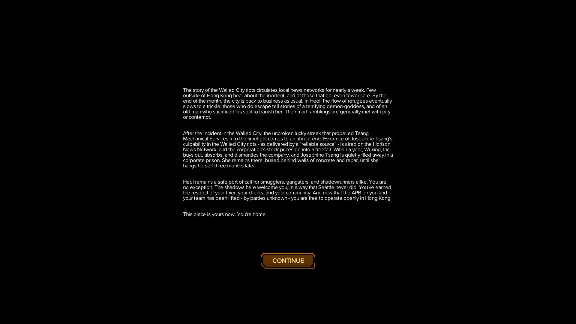 弥补结局 达成此结局无需在剧情中进行特殊操作,它是与“坏结局”类似的基础结局。 在第二次战斗后,你选择攻击女王。无论你做什么,只要在对话开始时与她意见不合或直接开战即可。你可以尝试提出反向交易,但不会成功。除非你在剧情中完成了某些特定事件(这将在下一个结局中说明),否则她会对你发起反击。你的整个团队将与你一同对抗女王。击败她后,她会消散。接下来你需要按下按钮,经过一番交谈后,雷蒙德会牺牲自己来关闭命运引擎。当你返回城市后,团队会在船上举行庆祝。你将继续在香港生活,并且不再被通缉。这将解锁Making Amends成就。