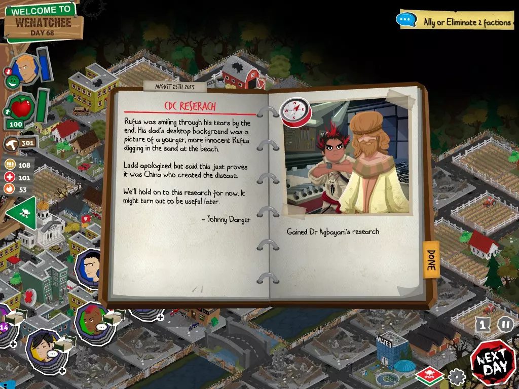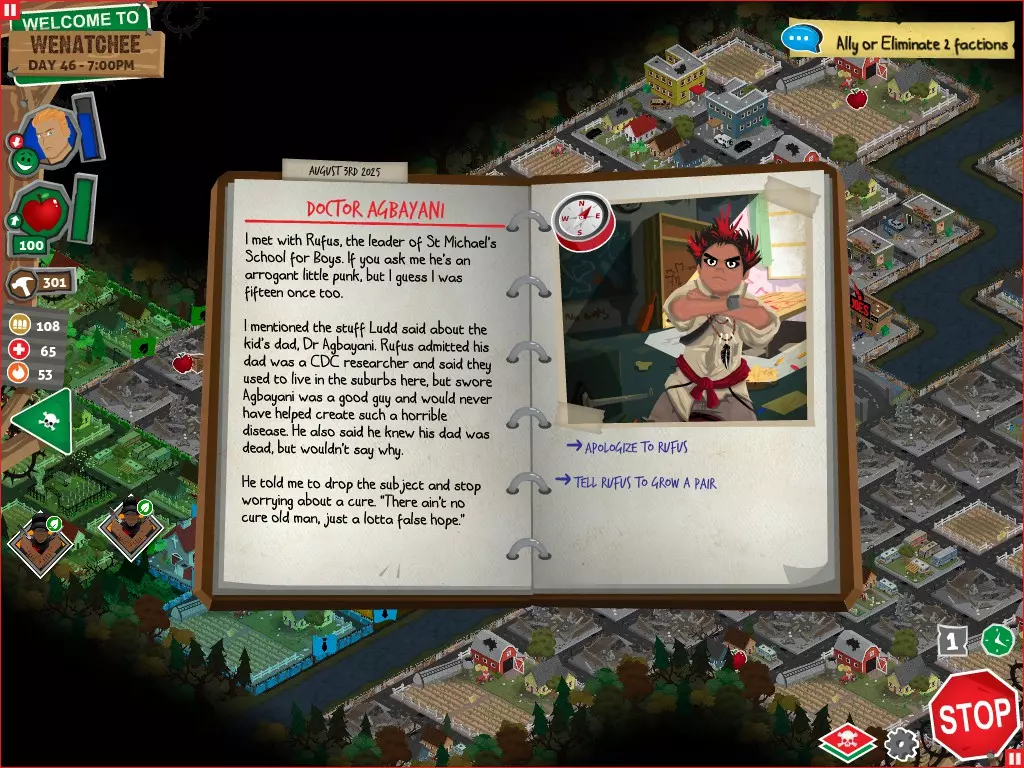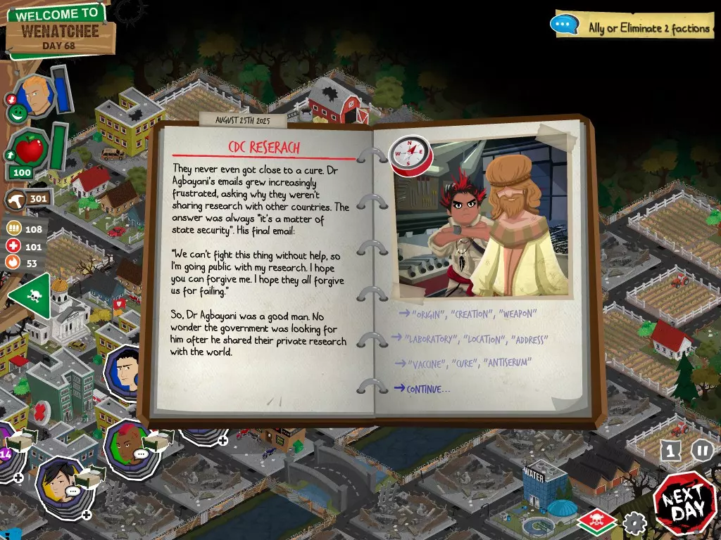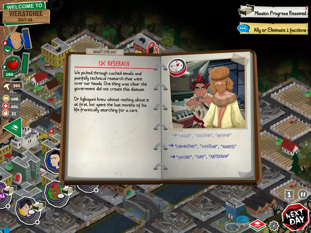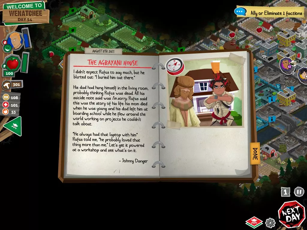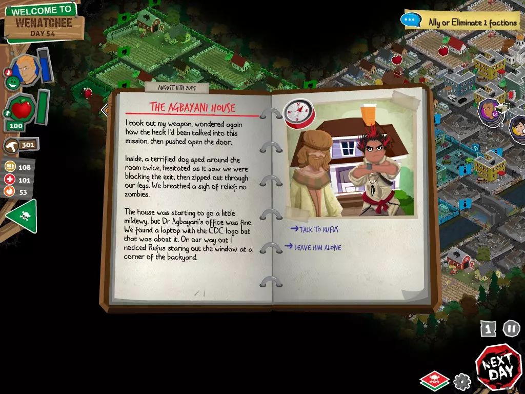 在任何情况下,都不要选择【向[势力]宣战】选项。否则你将无法获得达成圆满结局所需的必要物品。你可以拒绝,可以拖延,甚至可以表示需要和平。阿格巴亚尼的研究分步指南 对两个派系都保持友好 步骤 行动 事件名称 对话选项 1 和拉德交谈 阴谋论 【鼓励拉德继续说】 2 和鲁弗斯交谈 阿格巴亚尼医生 【向鲁弗斯道歉】 3 和拉德交谈 它会腐蚀你的大脑 【是的,带拉德去鲁弗斯的旧房子】 4 和鲁弗斯交谈 说服鲁弗斯 任意选项 5 前往公寓 阿格巴亚尼的房子 任意选项都会进入下一个事件,但根据你的选择,你会失去或获得尊重 6 使用工坊为笔记本电脑供电 疾控中心研究 任意选项 截图