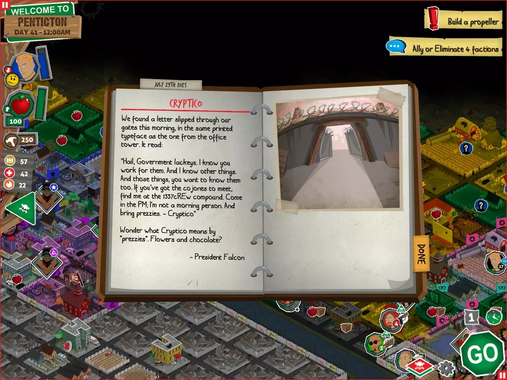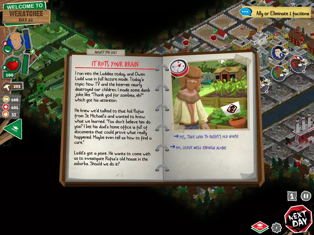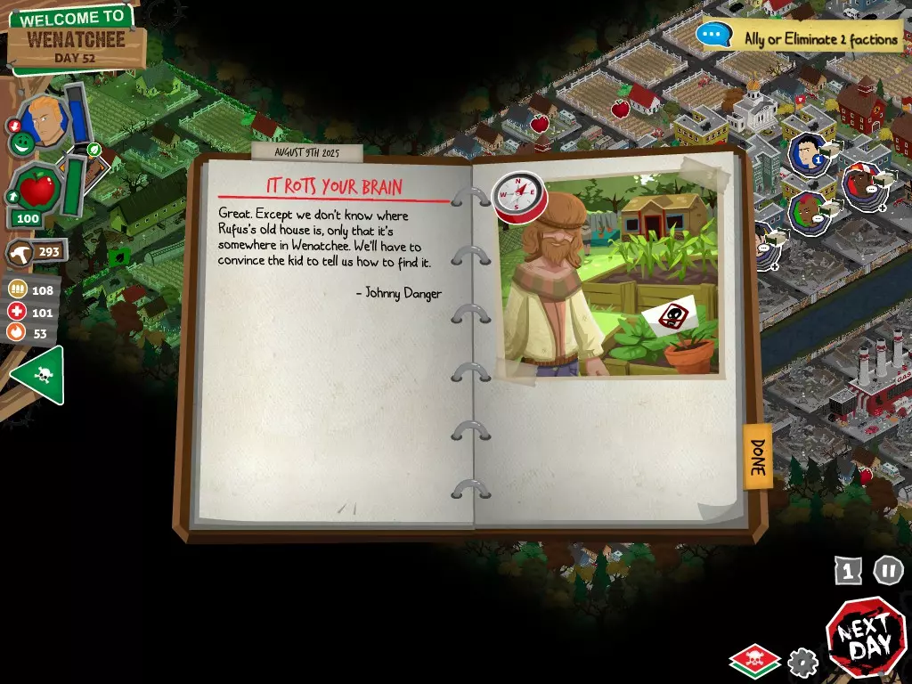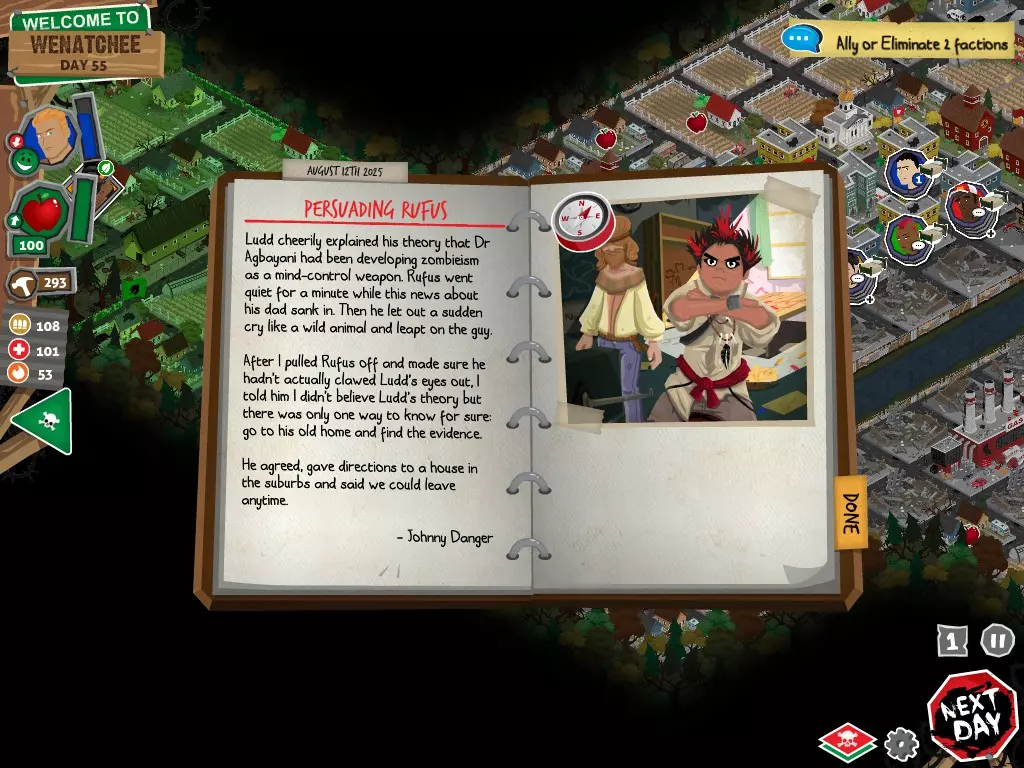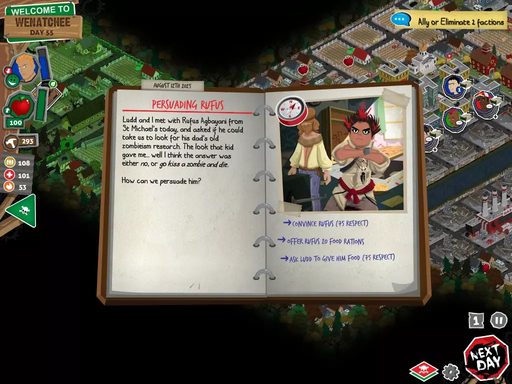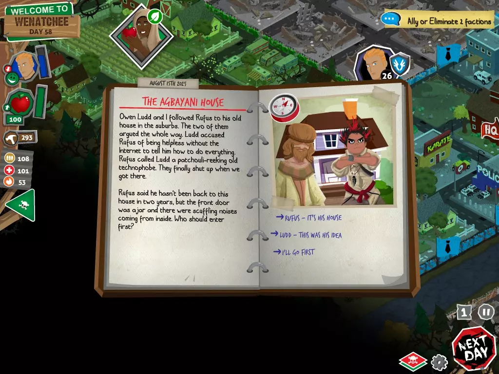 在任何情况下,都不要选择【向[势力]宣战】选项。否则你将无法获得达成圆满结局所需的必要物品。你可以拒绝,可以拖延,甚至可以表示需要和平。阿格巴亚尼的研究分步指南 对两个派系都保持友好 步骤 行动 事件名称 对话选项 1 和拉德交谈 阴谋论 【鼓励拉德继续说】 2 和鲁弗斯交谈 阿格巴亚尼医生 【向鲁弗斯道歉】 3 和拉德交谈 它会腐蚀你的大脑 【是的,带拉德去鲁弗斯的旧房子】 4 和鲁弗斯交谈 说服鲁弗斯 任意选项 5 前往公寓 阿格巴亚尼的房子 任意选项都会进入下一个事件,但根据你的选择,你会失去或获得尊重 6 使用工坊为笔记本电脑供电 疾控中心研究 任意选项 截图