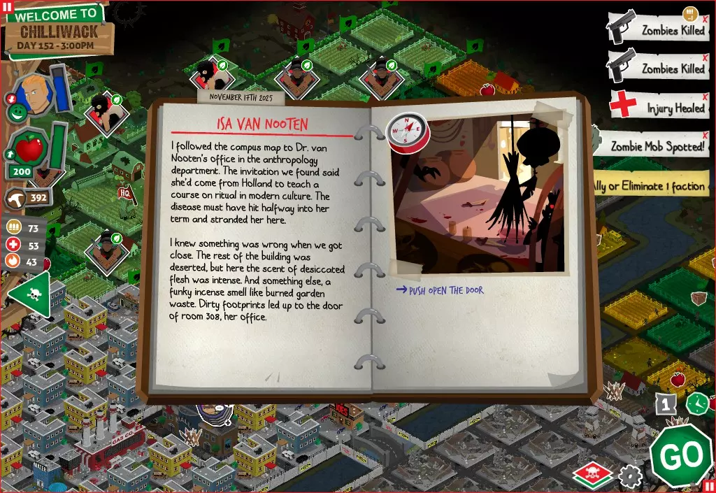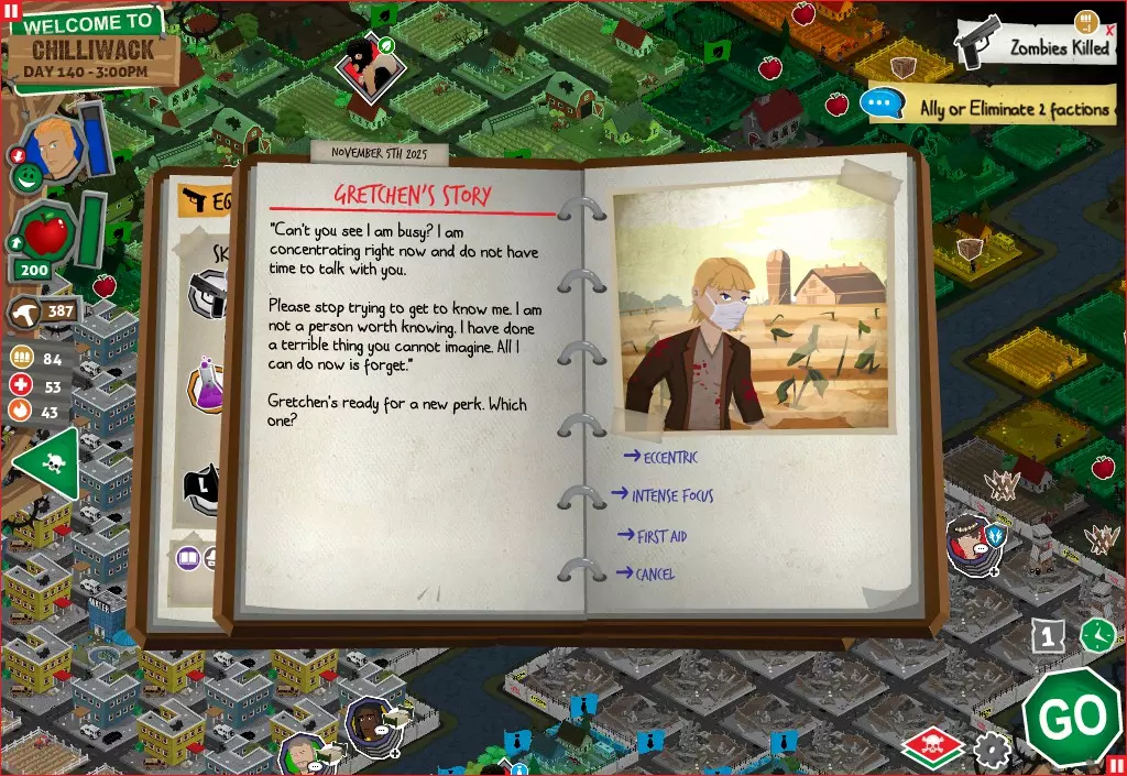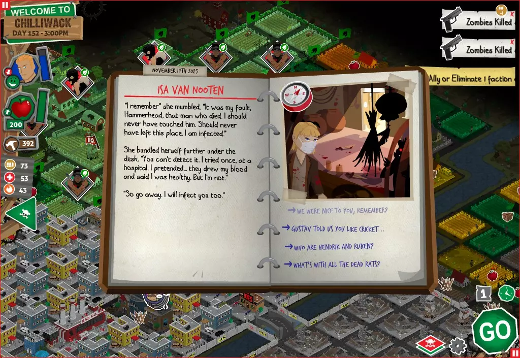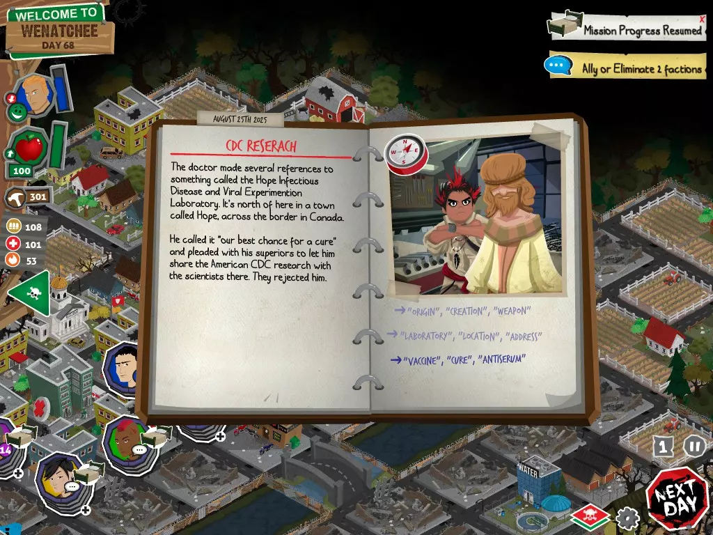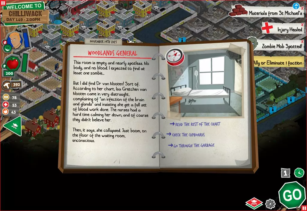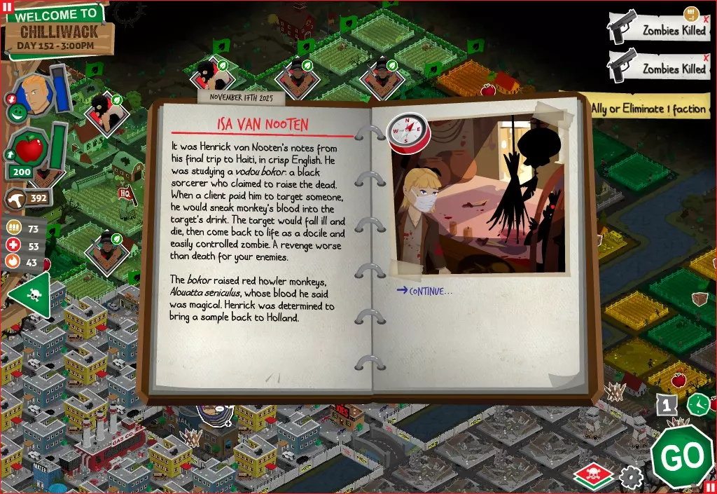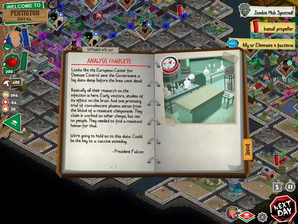 前置事件 你应按以下顺序完成前置事件(从最难按需完成到最容易):首先,完成【Schmooze got Book】,然后(如果你已准备好完成【Cricket Trade】和【Mall Pet Store】)完成【Mob Newspaper】,之后再完成另外两个。 【Schmooze got Book】 - 你的堡垒中拥有5所及以上学校 - 与其他非结盟派系会面,直到他们愿意给你书籍 - 选择小说类书籍 【Mob Newspaper】 - 你需要一个距离你的堡垒至少2格远的僵尸群 - 你必须猜测僵尸群将要行走的路径 - 派遣一组幸存者前往你的堡垒和僵尸群之间(位于僵尸群行走的路径上)保存游戏后让他们自行行动以观察其路线,然后重新加载并部署你的队伍),其中必须有一名工程师。仅派遣具备工程技能的士兵或你自己是无效的。该工程师必须将工程学设为主动技能。板球交易:与古斯塔夫进行交易,交易内容需包含你的板球棒。商场宠物店:派遣一名10级以上的拾荒者去搜寻商场。拾荒者会提前完成任务,此时选择前往宠物店。事件 事件1:起源加入 条件:触发4个前置事件中的2个、已研究【征兆】、有1个幸存者空位、4天 格雷琴·范·努滕将加入你的队伍 事件2:起源感染 条件:触发4个前置事件、有受伤的幸存者、14天 格雷琴·范·努滕检查受伤的幸存者,无意中使其感染 受伤的幸存者将会死亡 事件3:起源离开 条件:格雷琴·范·努滕存活且健康 格雷琴·范·努滕会攻击一名随机幸存者 她会离开你的堡垒(你可以通过7级领袖技能检定让她多留一段时间,但她最终还是会离开) 在那之后,你可以依次搜索汽车旅馆、医院、学校,然后会获得【猴子血液】 【猴子血液】(截图) 【交际】技能获得书籍