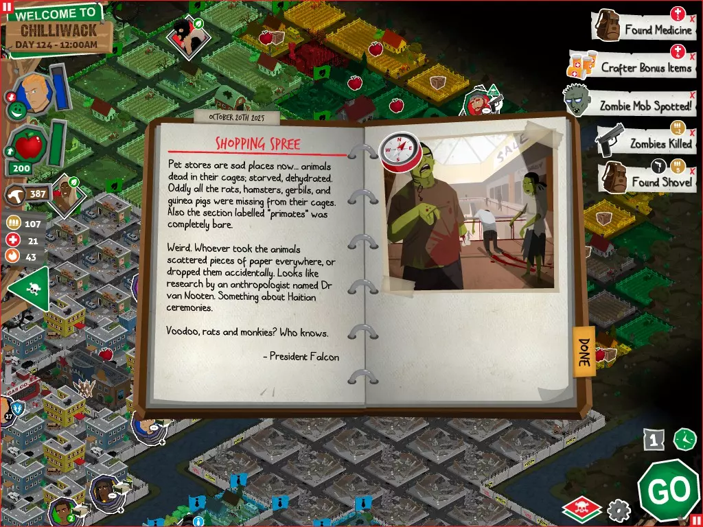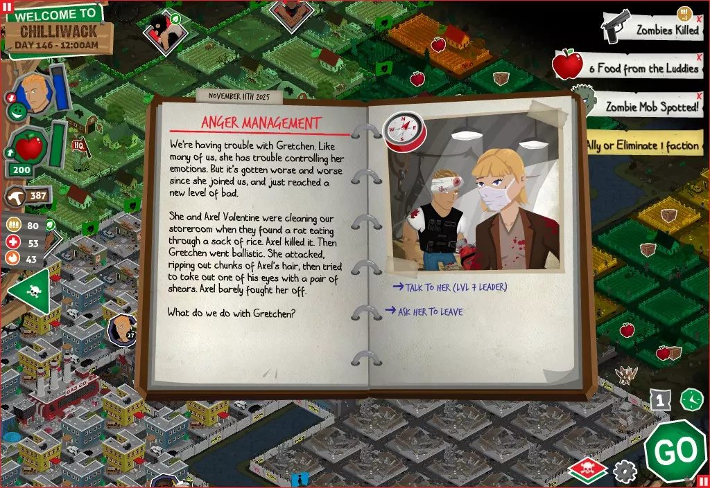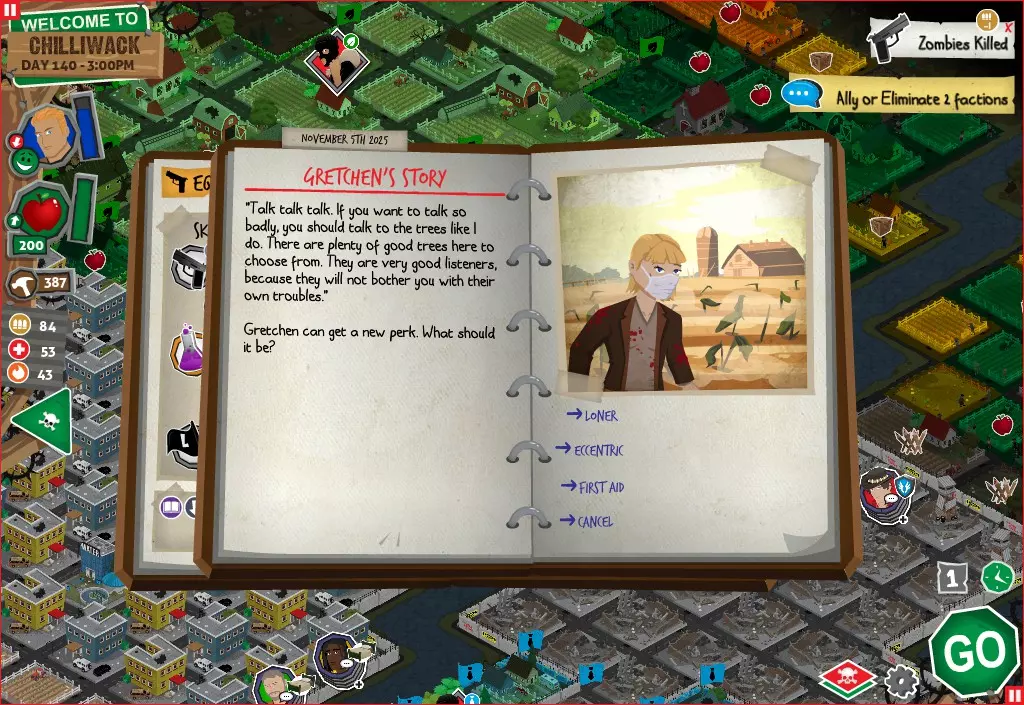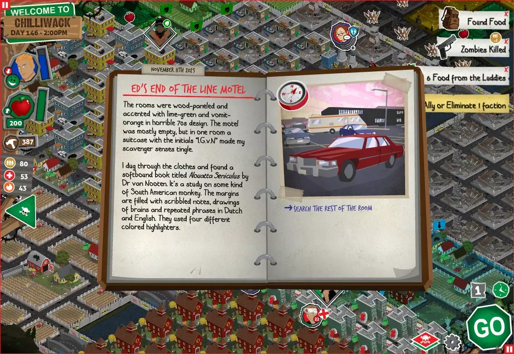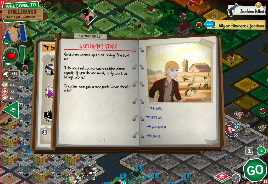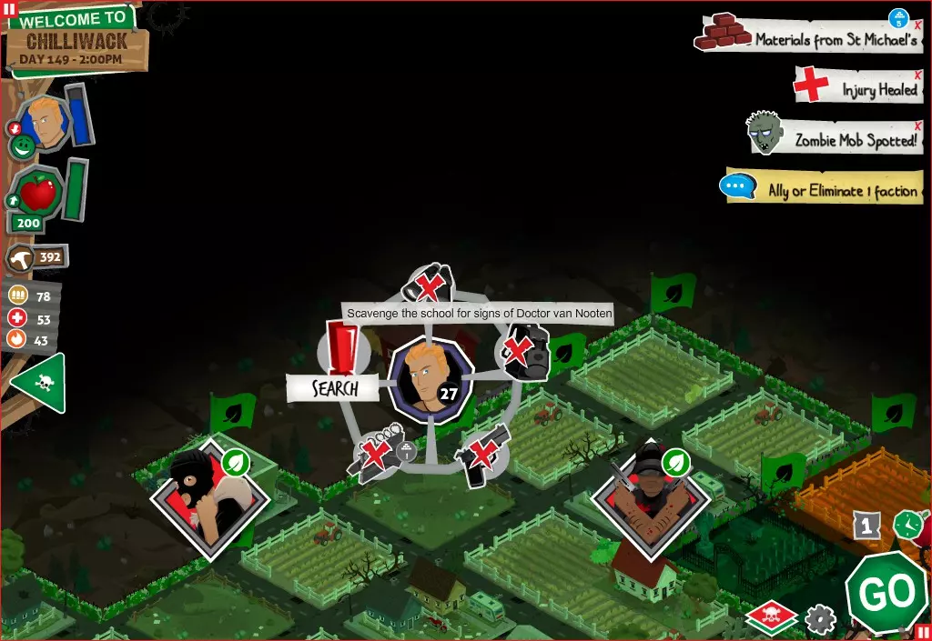 前置事件 你应按以下顺序完成前置事件(从最难按需完成到最容易):首先,完成【Schmooze got Book】,然后(如果你已准备好完成【Cricket Trade】和【Mall Pet Store】)完成【Mob Newspaper】,之后再完成另外两个。 【Schmooze got Book】 - 你的堡垒中拥有5所及以上学校 - 与其他非结盟派系会面,直到他们愿意给你书籍 - 选择小说类书籍 【Mob Newspaper】 - 你需要一个距离你的堡垒至少2格远的僵尸群 - 你必须猜测僵尸群将要行走的路径 - 派遣一组幸存者前往你的堡垒和僵尸群之间(位于僵尸群行走的路径上)保存游戏后让他们自行行动以观察其路线,然后重新加载并部署你的队伍),其中必须有一名工程师。仅派遣具备工程技能的士兵或你自己是无效的。该工程师必须将工程学设为主动技能。板球交易:与古斯塔夫进行交易,交易内容需包含你的板球棒。商场宠物店:派遣一名10级以上的拾荒者去搜寻商场。拾荒者会提前完成任务,此时选择前往宠物店。事件 事件1:起源加入 条件:触发4个前置事件中的2个、已研究【征兆】、有1个幸存者空位、4天 格雷琴·范·努滕将加入你的队伍 事件2:起源感染 条件:触发4个前置事件、有受伤的幸存者、14天 格雷琴·范·努滕检查受伤的幸存者,无意中使其感染 受伤的幸存者将会死亡 事件3:起源离开 条件:格雷琴·范·努滕存活且健康 格雷琴·范·努滕会攻击一名随机幸存者 她会离开你的堡垒(你可以通过7级领袖技能检定让她多留一段时间,但她最终还是会离开) 在那之后,你可以依次搜索汽车旅馆、医院、学校,然后会获得【猴子血液】 【猴子血液】(截图) 【交际】技能获得书籍