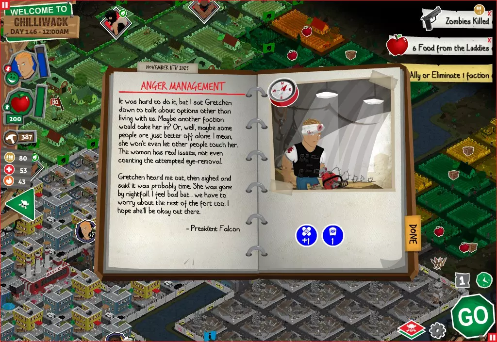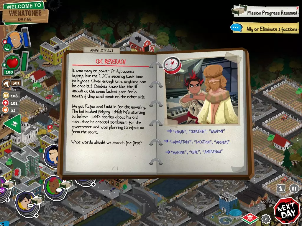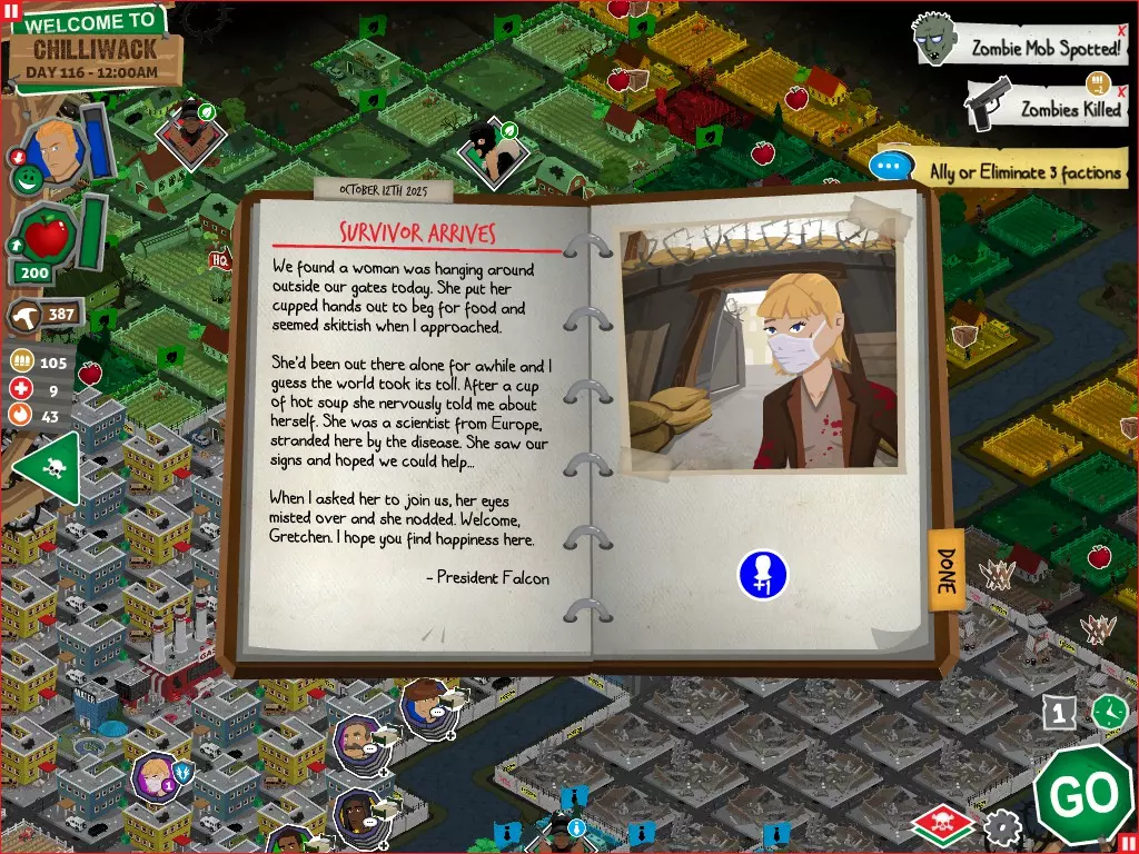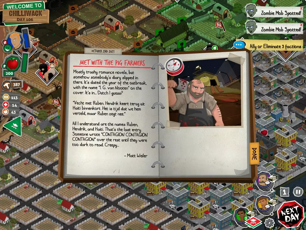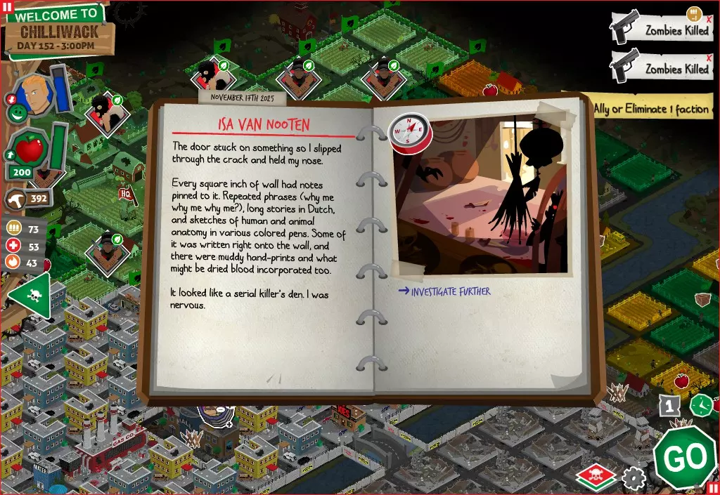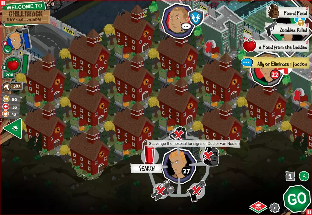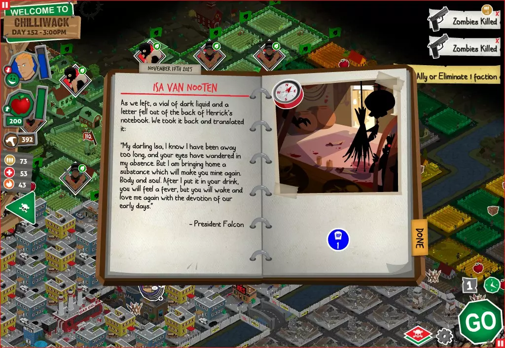 前置事件 你应按以下顺序完成前置事件(从最难按需完成到最容易):首先,完成【Schmooze got Book】,然后(如果你已准备好完成【Cricket Trade】和【Mall Pet Store】)完成【Mob Newspaper】,之后再完成另外两个。 【Schmooze got Book】 - 你的堡垒中拥有5所及以上学校 - 与其他非结盟派系会面,直到他们愿意给你书籍 - 选择小说类书籍 【Mob Newspaper】 - 你需要一个距离你的堡垒至少2格远的僵尸群 - 你必须猜测僵尸群将要行走的路径 - 派遣一组幸存者前往你的堡垒和僵尸群之间(位于僵尸群行走的路径上)保存游戏后让他们自行行动以观察其路线,然后重新加载并部署你的队伍),其中必须有一名工程师。仅派遣具备工程技能的士兵或你自己是无效的。该工程师必须将工程学设为主动技能。板球交易:与古斯塔夫进行交易,交易内容需包含你的板球棒。商场宠物店:派遣一名10级以上的拾荒者去搜寻商场。拾荒者会提前完成任务,此时选择前往宠物店。事件 事件1:起源加入 条件:触发4个前置事件中的2个、已研究【征兆】、有1个幸存者空位、4天 格雷琴·范·努滕将加入你的队伍 事件2:起源感染 条件:触发4个前置事件、有受伤的幸存者、14天 格雷琴·范·努滕检查受伤的幸存者,无意中使其感染 受伤的幸存者将会死亡 事件3:起源离开 条件:格雷琴·范·努滕存活且健康 格雷琴·范·努滕会攻击一名随机幸存者 她会离开你的堡垒(你可以通过7级领袖技能检定让她多留一段时间,但她最终还是会离开) 在那之后,你可以依次搜索汽车旅馆、医院、学校,然后会获得【猴子血液】 【猴子血液】(截图) 【交际】技能获得书籍