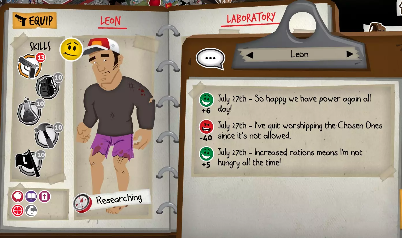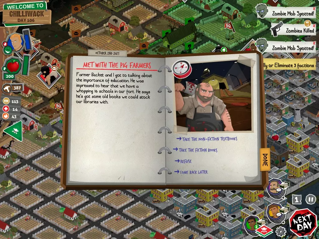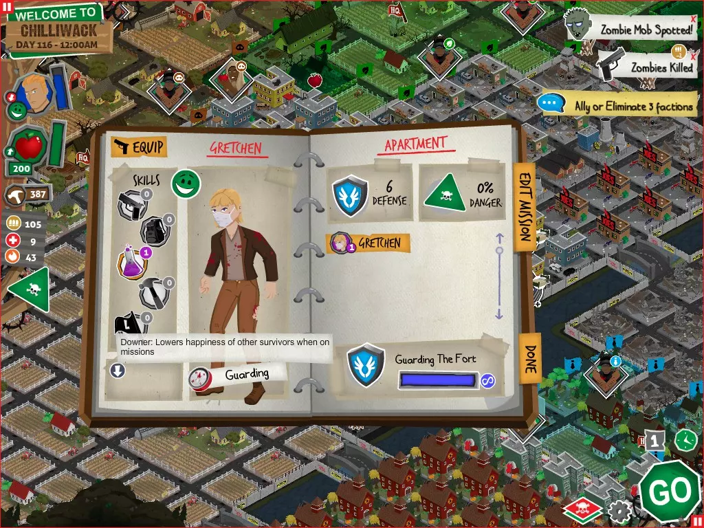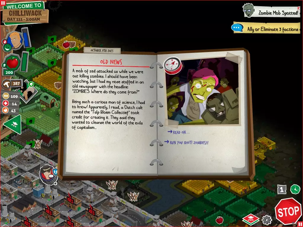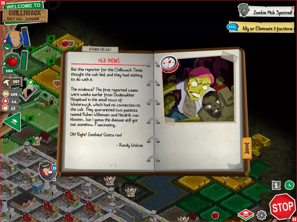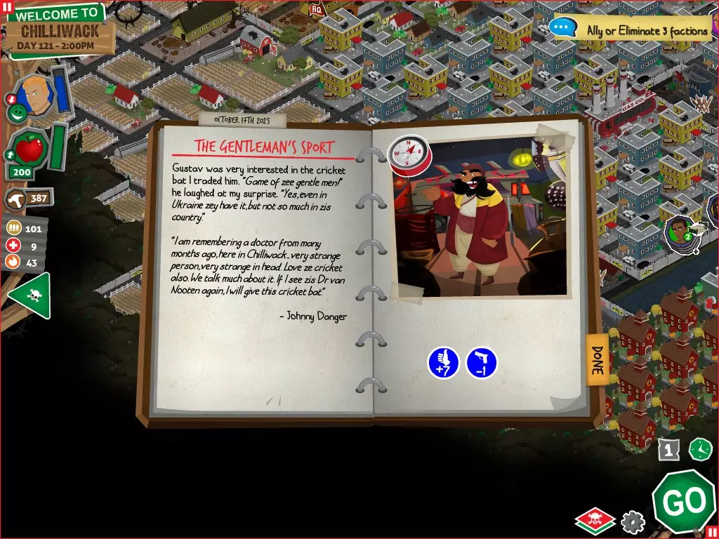 前置事件 你应按以下顺序完成前置事件(从最难按需完成到最容易):首先,完成【Schmooze got Book】,然后(如果你已准备好完成【Cricket Trade】和【Mall Pet Store】)完成【Mob Newspaper】,之后再完成另外两个。 【Schmooze got Book】 - 你的堡垒中拥有5所及以上学校 - 与其他非结盟派系会面,直到他们愿意给你书籍 - 选择小说类书籍 【Mob Newspaper】 - 你需要一个距离你的堡垒至少2格远的僵尸群 - 你必须猜测僵尸群将要行走的路径 - 派遣一组幸存者前往你的堡垒和僵尸群之间(位于僵尸群行走的路径上)保存游戏后让他们自行行动以观察其路线,然后重新加载并部署你的队伍),其中必须有一名工程师。仅派遣具备工程技能的士兵或你自己是无效的。该工程师必须将工程学设为主动技能。板球交易:与古斯塔夫进行交易,交易内容需包含你的板球棒。商场宠物店:派遣一名10级以上的拾荒者去搜寻商场。拾荒者会提前完成任务,此时选择前往宠物店。事件 事件1:起源加入 条件:触发4个前置事件中的2个、已研究【征兆】、有1个幸存者空位、4天 格雷琴·范·努滕将加入你的队伍 事件2:起源感染 条件:触发4个前置事件、有受伤的幸存者、14天 格雷琴·范·努滕检查受伤的幸存者,无意中使其感染 受伤的幸存者将会死亡 事件3:起源离开 条件:格雷琴·范·努滕存活且健康 格雷琴·范·努滕会攻击一名随机幸存者 她会离开你的堡垒(你可以通过7级领袖技能检定让她多留一段时间,但她最终还是会离开) 在那之后,你可以依次搜索汽车旅馆、医院、学校,然后会获得【猴子血液】 【猴子血液】(截图) 【交际】技能获得书籍