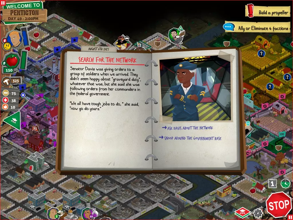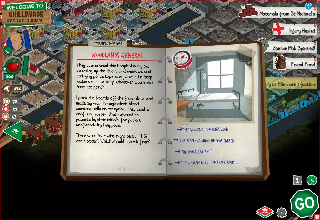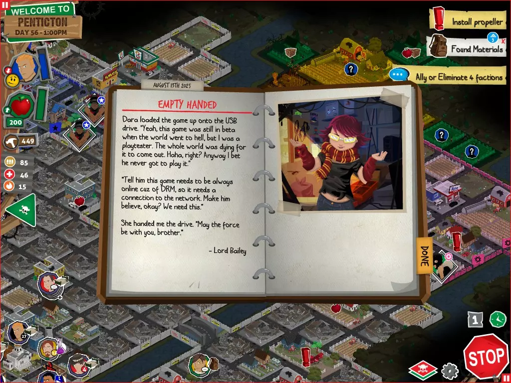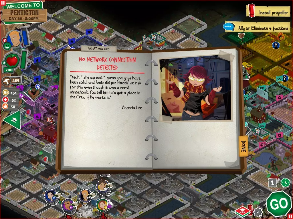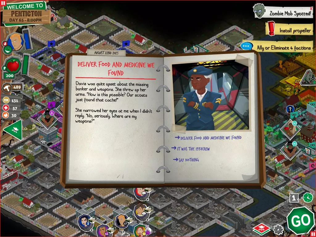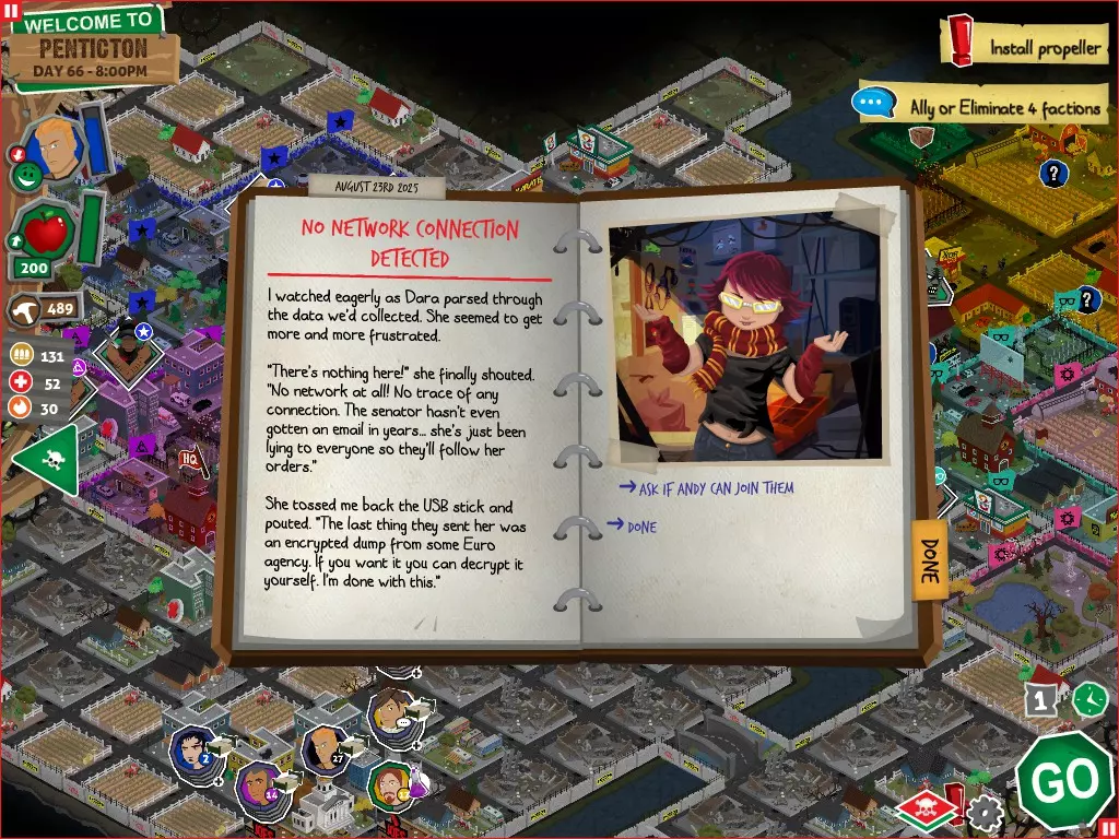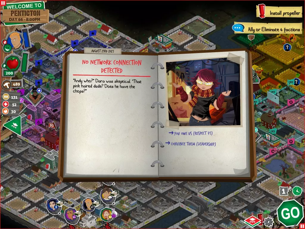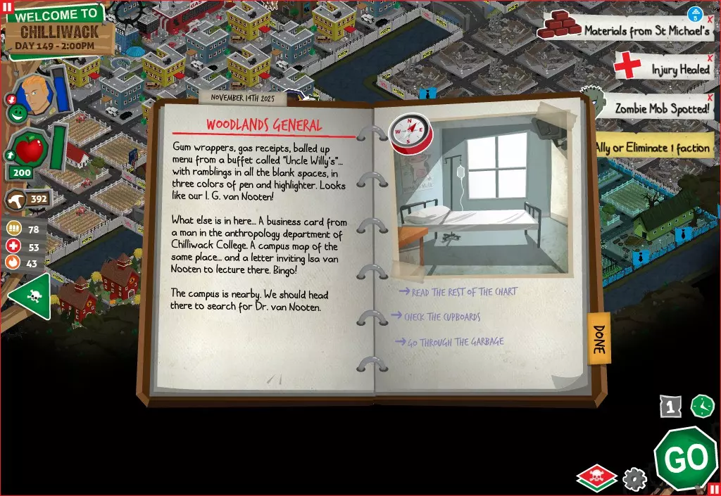 行动 事件名称 对话选项 与戴维斯交谈 网络(需完成“未检测到网络连接”事件) 【为她保守秘密】 【询问能否让安迪加入我们】 猴血 现在事情开始变得有点棘手了 要求 城镇不是阿博茨堡或温哥华 未搜寻且未回收的汽车旅馆 未搜寻且未回收的购物中心 已回收8/12超市与幸运商店或板球棒 可牺牲的幸存者 已研究“路标” 有一名幸存者的空间