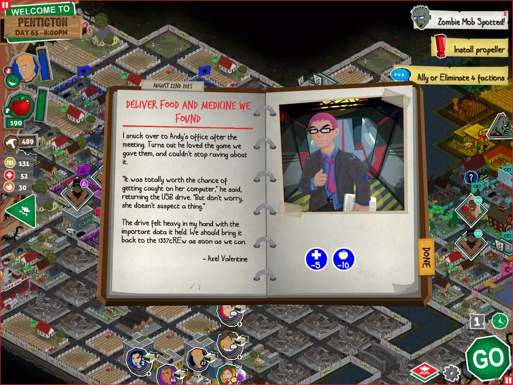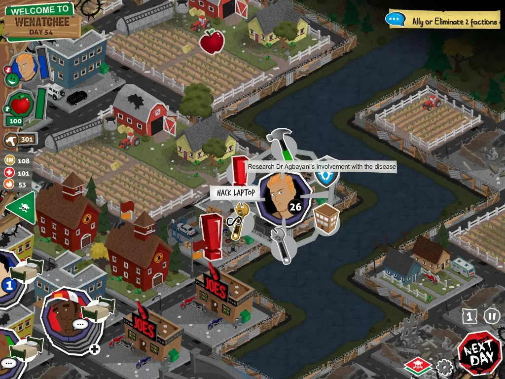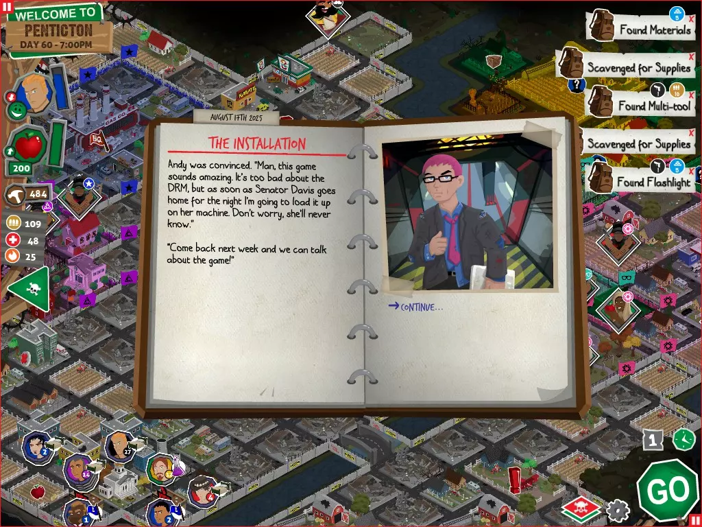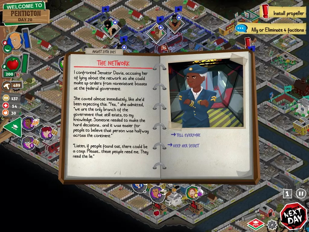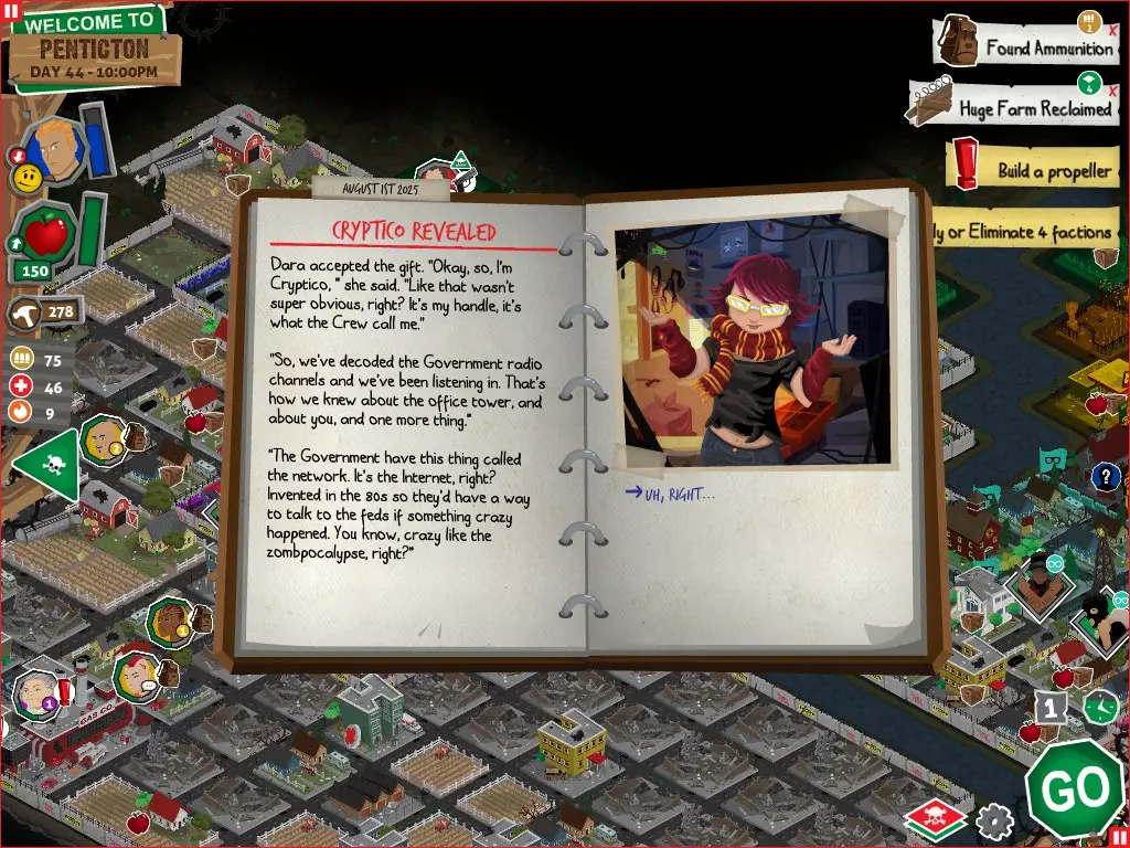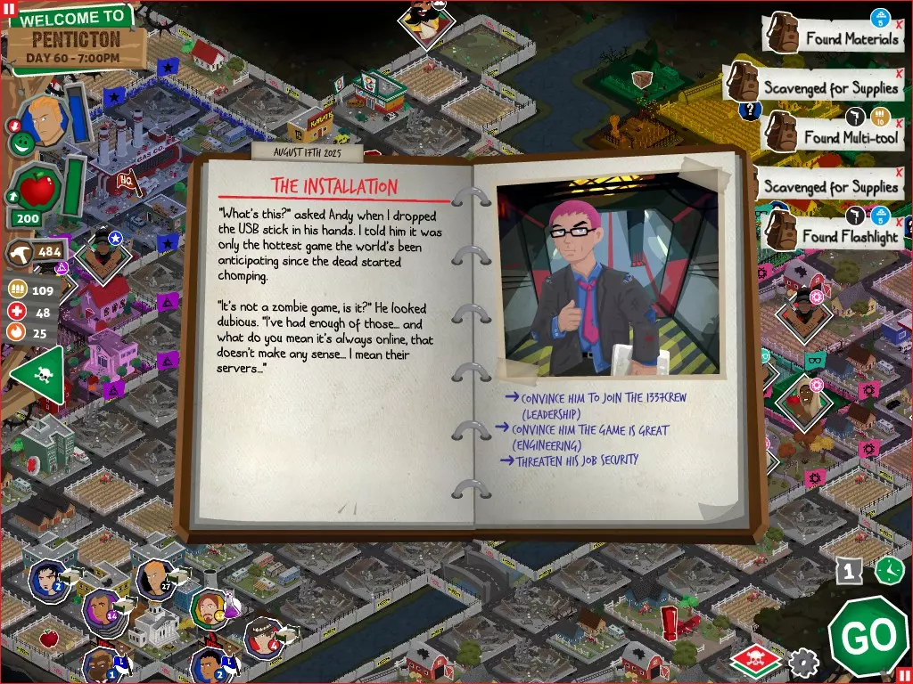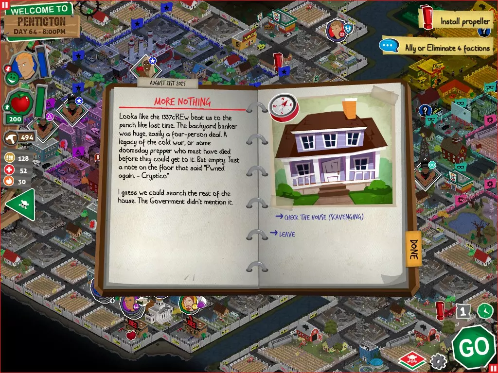 行动 事件名称 对话选项 与戴维斯交谈 网络(需完成“未检测到网络连接”事件) 【为她保守秘密】 【询问能否让安迪加入我们】 猴血 现在事情开始变得有点棘手了 要求 城镇不是阿博茨堡或温哥华 未搜寻且未回收的汽车旅馆 未搜寻且未回收的购物中心 已回收8/12超市与幸运商店或板球棒 可牺牲的幸存者 已研究“路标” 有一名幸存者的空间