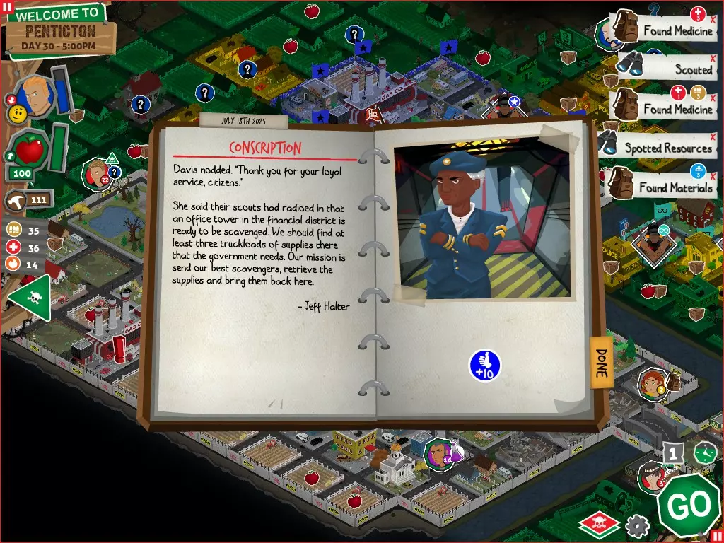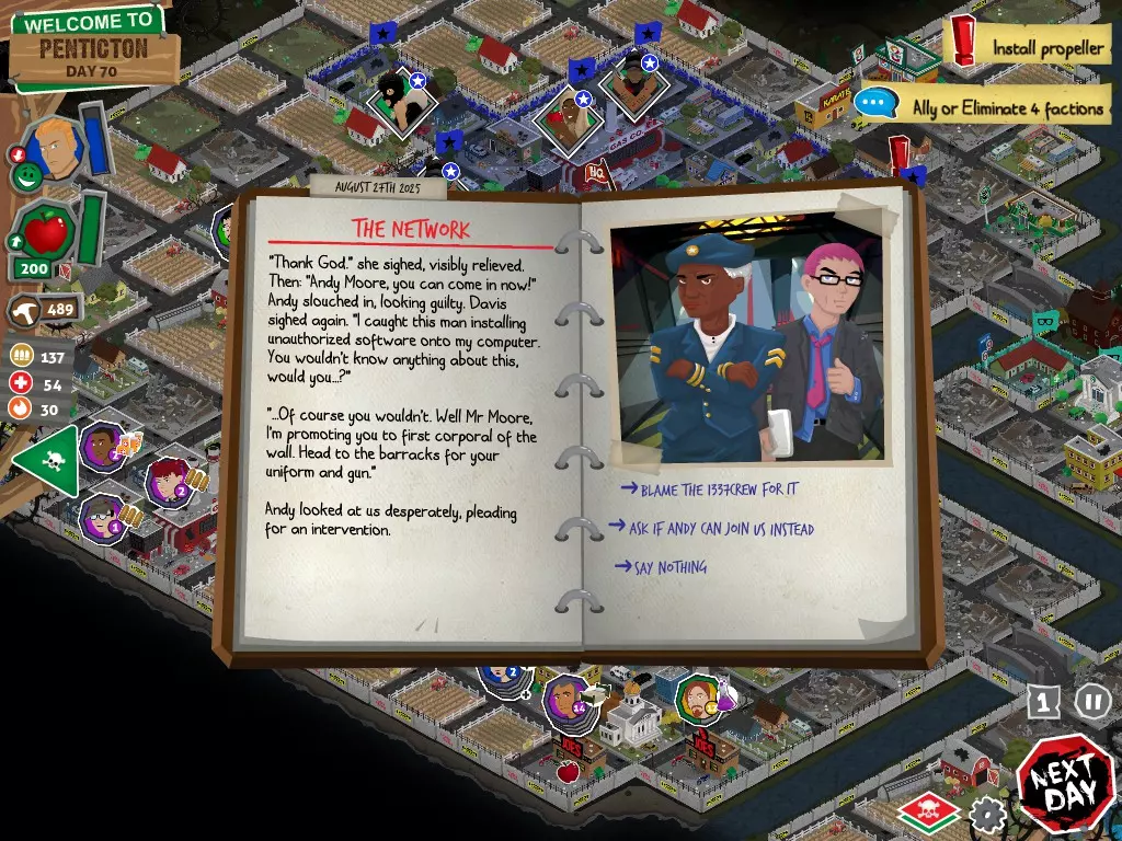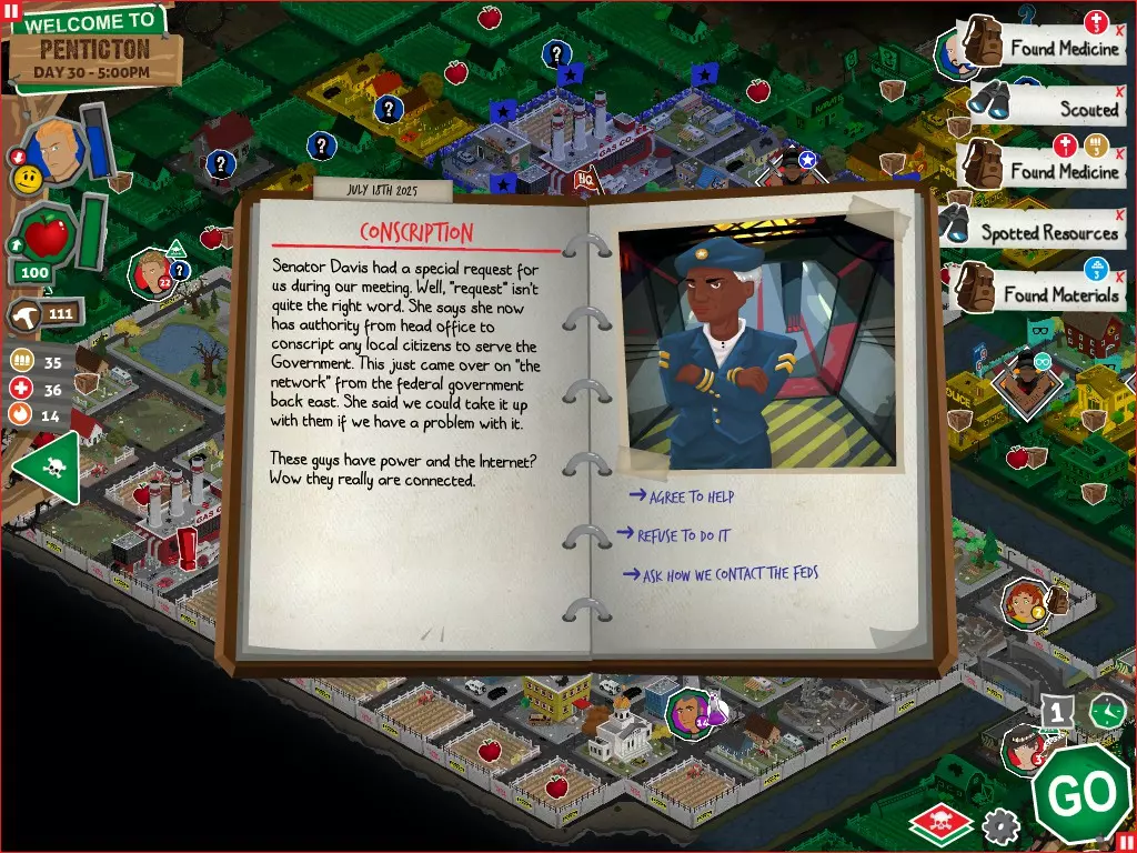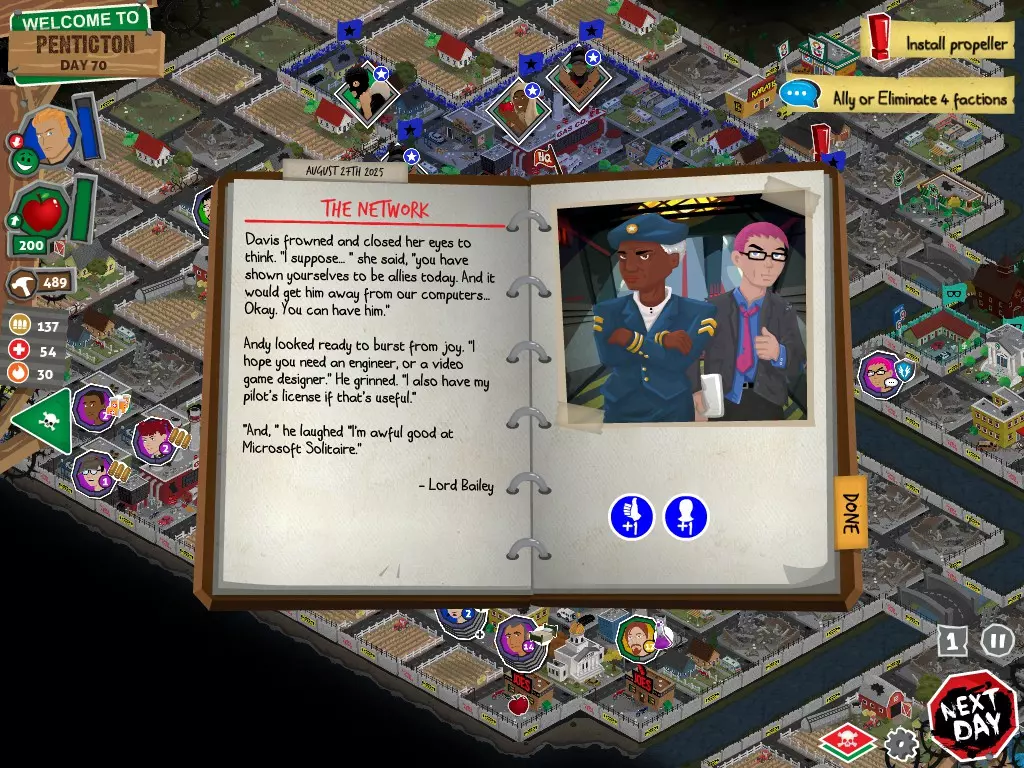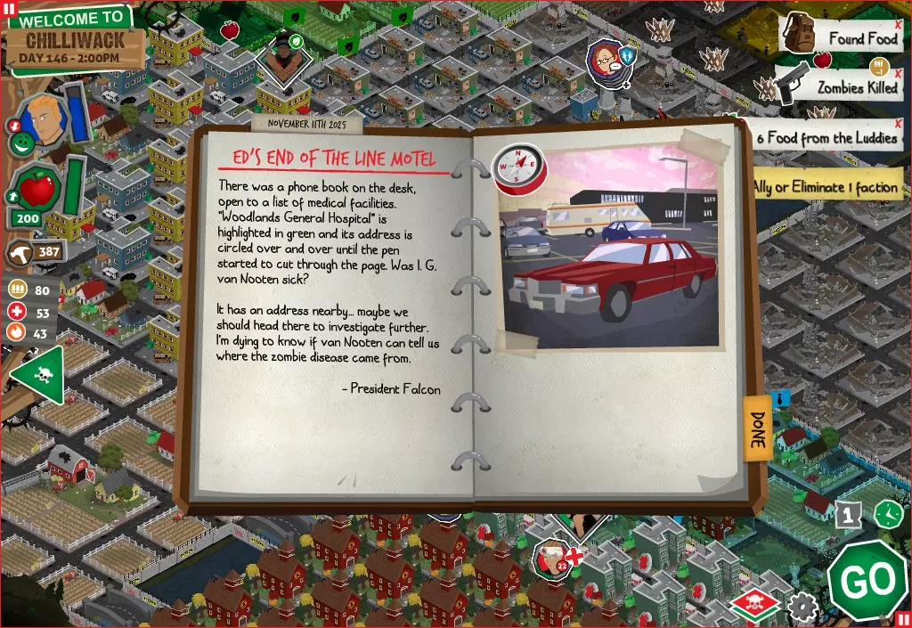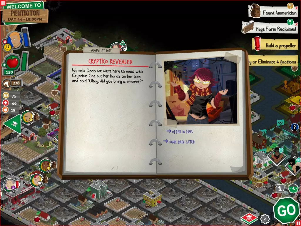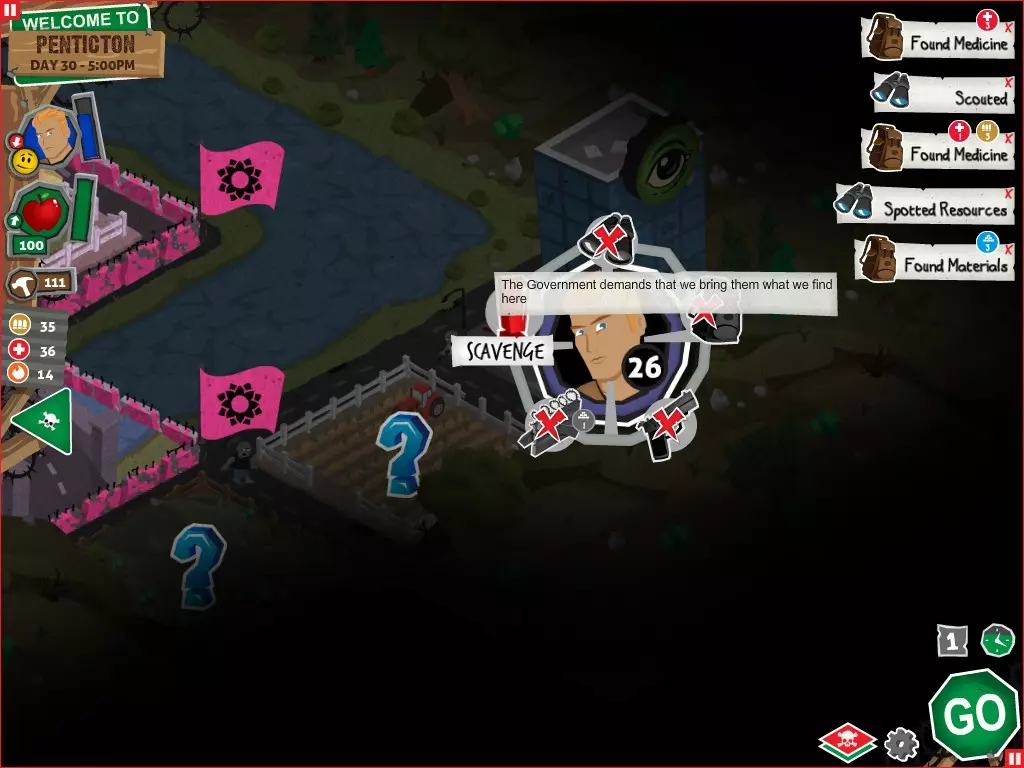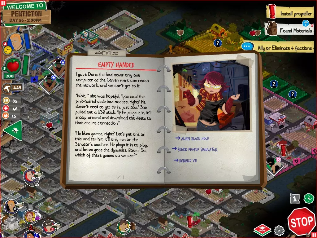 行动 事件名称 对话选项 与戴维斯交谈 网络(需完成“未检测到网络连接”事件) 【为她保守秘密】 【询问能否让安迪加入我们】 猴血 现在事情开始变得有点棘手了 要求 城镇不是阿博茨堡或温哥华 未搜寻且未回收的汽车旅馆 未搜寻且未回收的购物中心 已回收8/12超市与幸运商店或板球棒 可牺牲的幸存者 已研究“路标” 有一名幸存者的空间