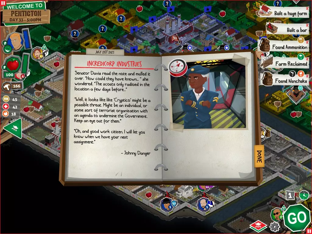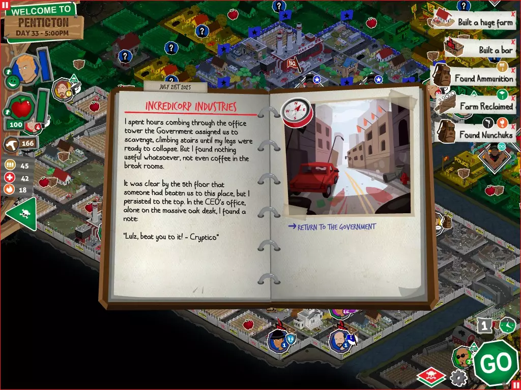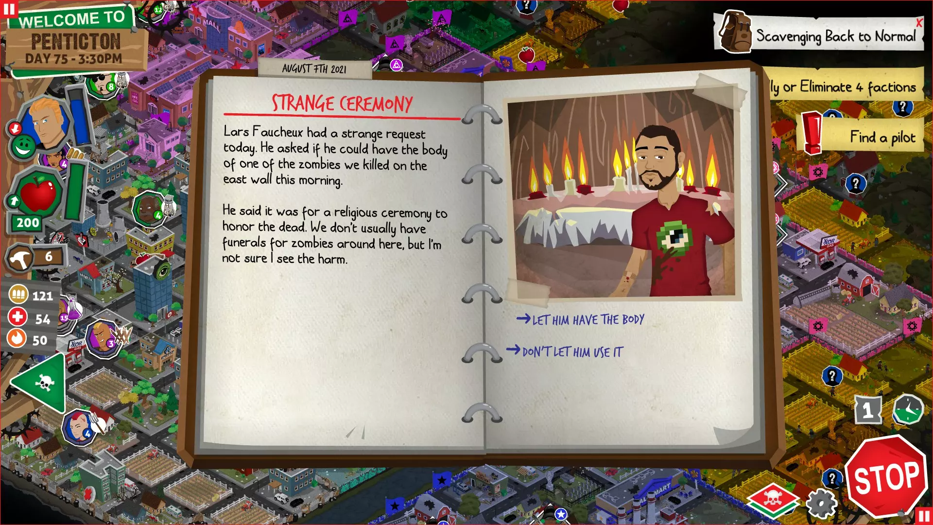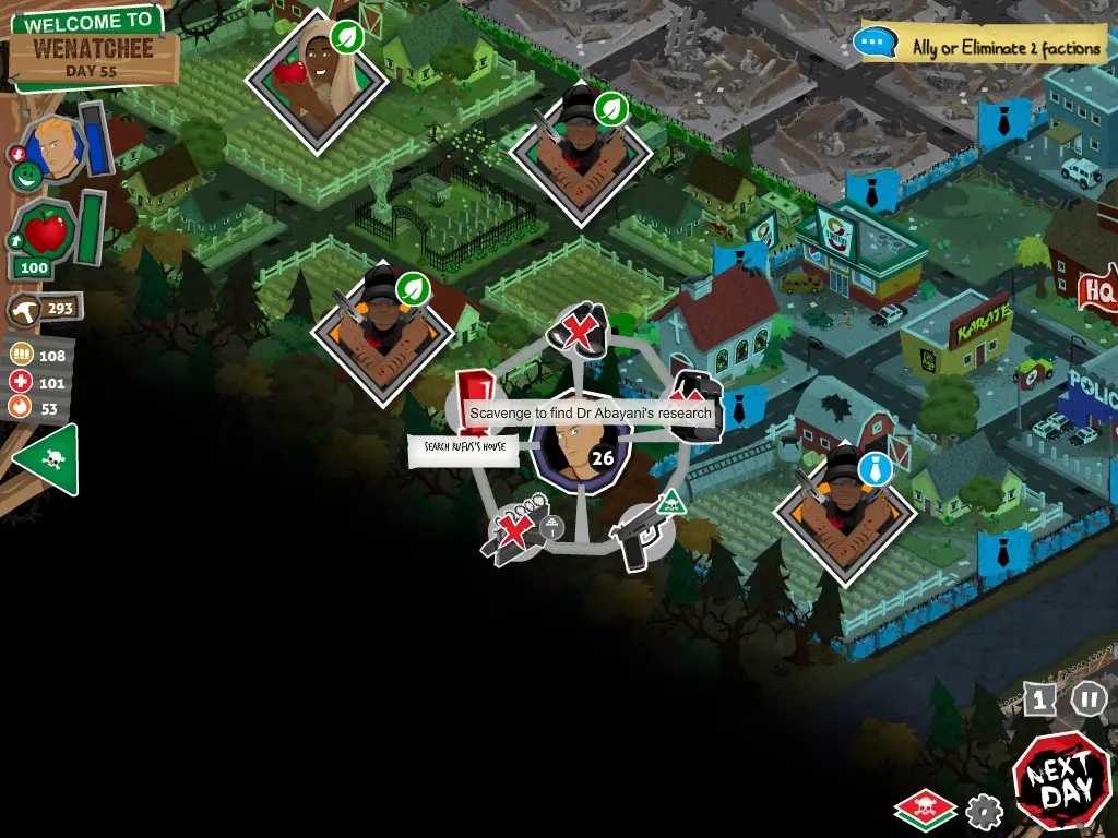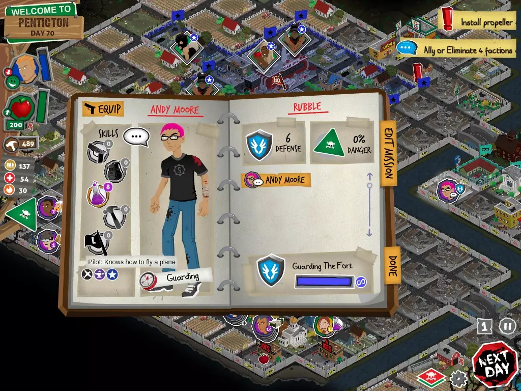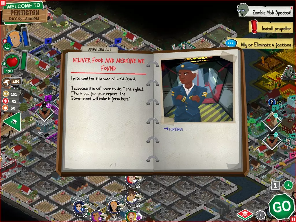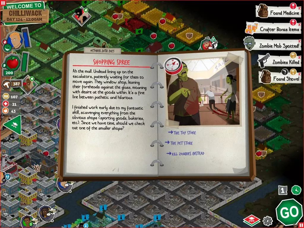 行动 事件名称 对话选项 与戴维斯交谈 网络(需完成“未检测到网络连接”事件) 【为她保守秘密】 【询问能否让安迪加入我们】 猴血 现在事情开始变得有点棘手了 要求 城镇不是阿博茨堡或温哥华 未搜寻且未回收的汽车旅馆 未搜寻且未回收的购物中心 已回收8/12超市与幸运商店或板球棒 可牺牲的幸存者 已研究“路标” 有一名幸存者的空间