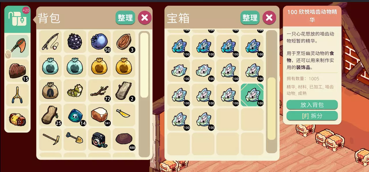 虽然兔兔很可爱,但是这一千多个最高等级的精华让我陷入了沉思。 DLC解锁之前要慎重。首先,如果你想要全成就的话,DLC是必须的。但是DLC是以替换原本的熊的方式来加入新的熊的。 以下是被替换的四只熊: 退休熊,长得像山羊。因为老年痴呆而让你给它四处找照片。 警惕熊,长得像棕熊。被阴谋论洗脑,觉得自己被间谍监视、被脑机心灵控制的那个。 狼熊,长得像狼。穿西装的推销员一样的熊。 向日葵熊,长得像向日葵。好像是个离异妇女,有一个种着向日葵的花田。建议体验完上面四只熊的剧情再入手DLC。可以在打折时先入手游戏,之后在Steam该游戏的设置中暂不安装DLC。 商店里推荐购买物资来赚钱的方法不再细说,水果烤制后最终做成水果酊剂再卖掉即可。 由于养动物时,动物每天有一半的概率需要吃你做的菜,所以在有闲钱的情况下,多囤积些原材料是有好处的。 蘑菇做菜时消耗很大。且不说那些需要消耗50个烤蘑菇的菜肴,在比较常规的菜品里,蘑菇沙拉、豆腐(作为其他菜的中间产物)等都需要一次消耗10个烤蘑菇。原材料的转换比例根本无法满足养动物的消耗,因此在商店里看到有蘑菇记得购买。 根类蔬菜,比如土豆、萝卜之类的也需要留意。同样是做菜时消耗比较大,不过原材料的转换比例还算可以,闲钱多的话还是看见就买吧。 矿石。商店卖的矿挺便宜的,特别是有时会卖中型矿石,中型铁30铜币、中型银120铜币。常规流程用不上这么多矿,但要是想每周三换金箱子,还是要囤点的。反正也不贵。