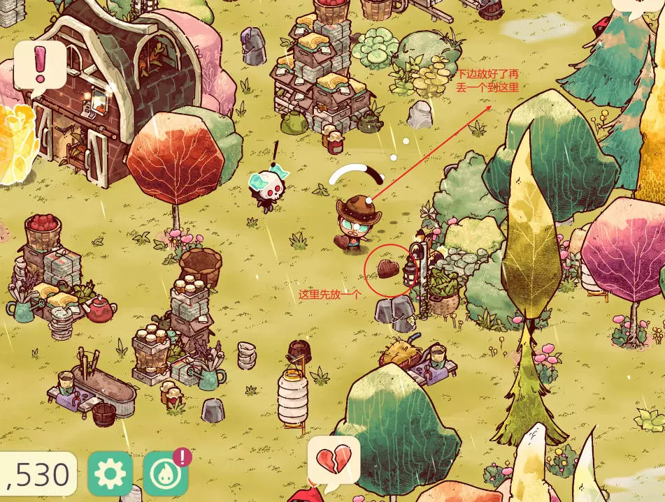 先提前在屏幕中间放一个软糖(从背包里丢弃,不是捏在手里抛出),放完之后再丢一个触发淘气鬼行动起来: