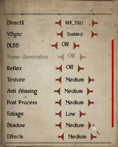 两部分终极性能提升指南。 警告!此方法可能并非对所有人都有效,根据我的测试,它能使我的帧率提升约50%。 第二部分鸣谢:michaelmichaelimmichael 第一部分:简单提升帧率 信息:如果存在中等/低等这类不同选项,加粗表示推荐,斜体表示不推荐。 为简洁起见,我会提供我的设置截图和各项设置列表。滚动至底部查看。 分辨率:640x480 注意:在我的测试中,这一项对我个人而言没有任何变化。 帧率:60 显示模式:无边框 DirectX:RHI_DX12 垂直同步:开启 DLSS:关闭 注意:可能会提升帧率,但会导致画面模糊。 帧生成:? 注意:如果可以启用,不妨尝试一下!看看是否能显著提升帧率。 反射:关闭 纹理:中等 抗锯齿:中等 注:这有助于使边缘更平滑,可能会对植被造成影响。 后期处理:中/低 植被:低 阴影:中/低 特效:中/低