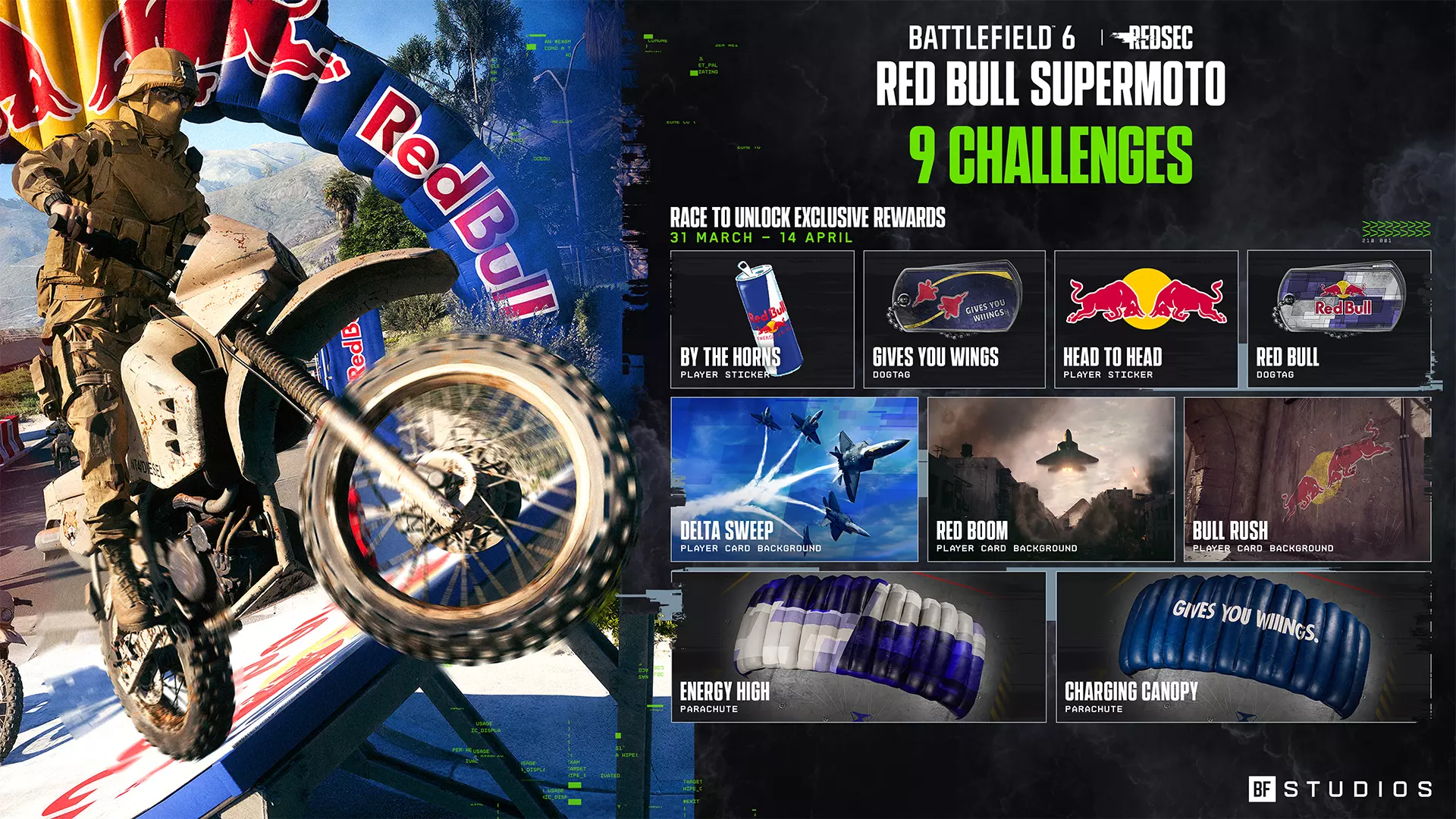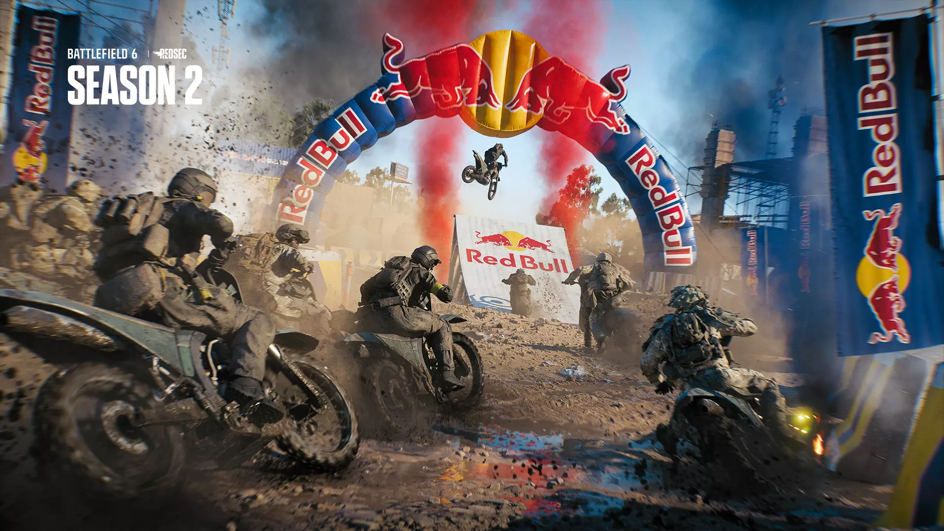 《战地风云》REDSEC与Red Bull合作推出限时活动,以庆祝第二赛季。活动包含一项源自Red Bull极限运动历史的全新载具核心: dirt bike( dirt bike)。在三轮扣人心弦的对决中加速前进,穿梭于各条赛道,同时淘汰敌方车手。