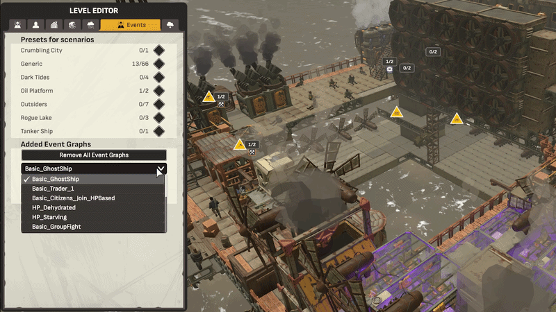 查看列表后,你可以通过主菜单中的【自定义剧本】选项上传并游玩。如果你通过创意工坊选择了喜欢的地图/剧本,可以进入本地模组并设置自己的规则进行游玩。如果不喜欢现有设置或规则,可以通过更改为预设规则来打造更个性化的体验。 接下来谈谈【事件图谱】 事件图谱是控制游戏玩法的高级脚本。例如,在破损油轮地图中,你可以混合搭配事件图谱并创建自己的规则。管理游戏的进行方式,更改不同的剧本模式以及游戏过程中出现的事件,你可以启用或禁用它们。还可以调整天气库来增加游戏难度。