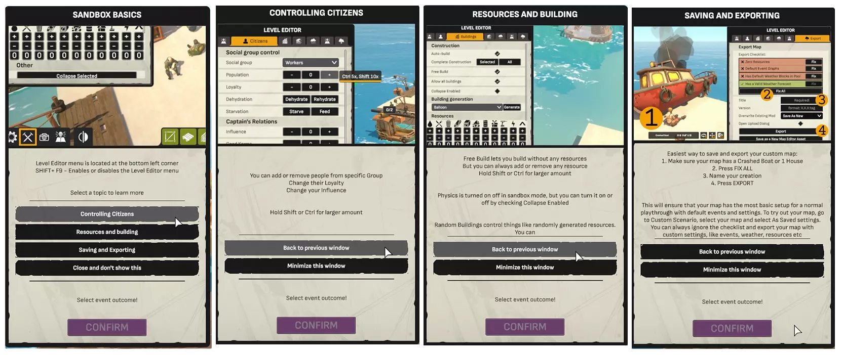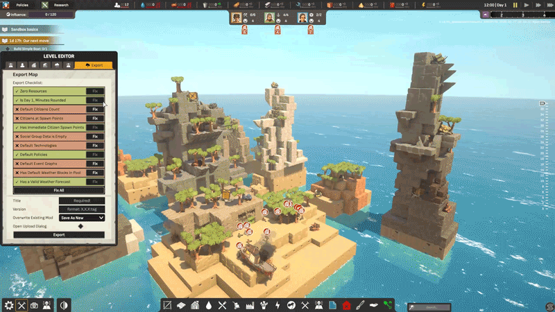 沙盒关卡将是一个独立的快速游玩模式,你可以从主菜单进入。如果你不想玩生存模式或普通模式,可以选择这个模式。 创建地图和场景: 1. 我们制定了一份清单,帮助你在创建正式场景时确保地图达到【开发者认可】标准;这份清单并非强制要求,只要场景能正常运行,创作者可以自由忽略。 2. 确保地图中有资源和足够数量的市民;无论添加什么内容,场景都应运行流畅,其他要求并非严格必要。 3. 我们开放了社区实验功能。你可以上传任何内容,这完全由你决定。