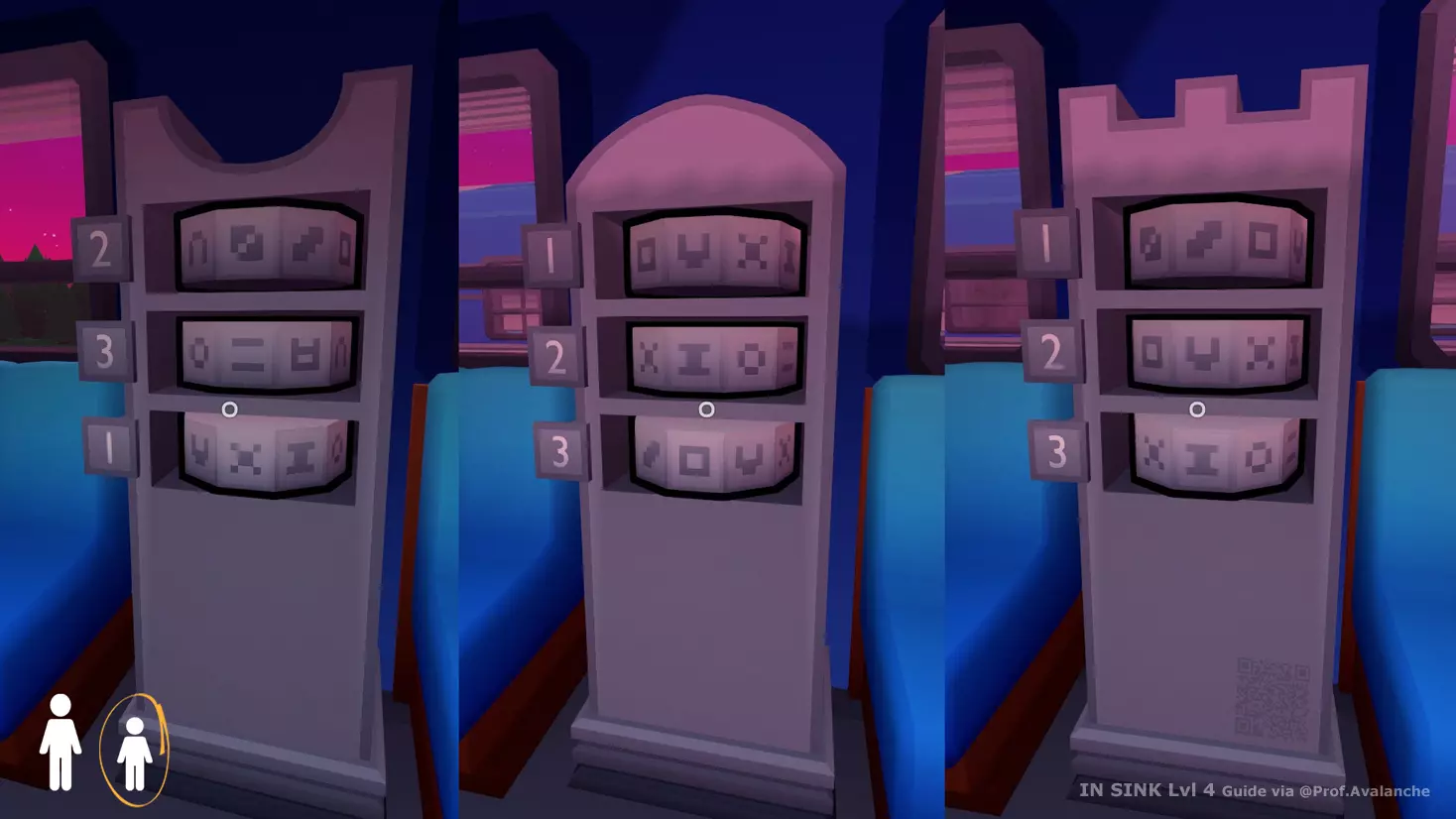 总之,感谢阅读。哈哈,再见。 引用自 Prof. Avalanche:无编辑。 房间9(船只) 该房间包含3个谜题。 成功完成第一个谜题后,第二个谜题会出现,接着是第三个。 谜题1 前往船只并踏上平台。你看到了什么? 提示:这是数学问题。数字缺失了。颜色很重要。 仔细查看船只内外。你能找到一些数字吗?它们有颜色吗? 船只外部有两个位置。一个有带有数字和颜色的板子,另一个是需要选择数字的刻度盘。刻度盘稍后会用到。我们先专注于板子。 查看板子,注意带有红色图案的数字。这个图案有什么特别之处?观察面板上带有颜色的其他数字。其排列是否遵循某种规律? 无论是在脑海中记忆,还是写在纸上或使用Steam覆盖层的笔记功能,都请记录下所有数字。 回想一下船上的公式。进行计算吧。使用面板上的数字,横向读取。 提示:蓝色 5 2 x 8 红色 3 7 1 6 黄色 4 x 2 7 计算式:蓝色 + 红色 - 黄色 等式的结果可在刻度盘处设置,缺失的数字可以猜测。 刻度盘答案:4 6 2 7 谜题2 在船上: 儿童角色爬过狭小空间进入新房间。 成人角色通过打开的门向下进入新房间。 成人角色的任务:告诉你的同伴你在屏幕上看到的符号。详细描述。你的队友可能会看到极为相似的符号,所以请保持耐心并积极沟通。 儿童角色的任务:选择队友屏幕上出现的符号。他们需要向你描述该符号的样子。 如果选错符号,你将不得不重新开始。 连续正确输入6个符号后,下一个谜题将会出现。 谜题3 你们两人都会看到一张地图。你们控制着同一艘船。 一人只能控制船上下移动,另一人只能控制船左右移动。 目标是让船避开所有岩石,安全抵达目的地。 请记住,你们两人看到的地图信息不同。 你们看到的岩石位置各不相同,但都是真实存在的。 通过沟通来避开彼此看到的岩石。像这样提问:我能向上移动多少格?好的,现在你最多还能向左移动3格。根据你的地图,我最多能向下移动多少格?哦,那太多了,我的地图上有块石头,我会提前停下。你最多能向……移动2格。 完成最后一个谜题并按下红色按钮后,成就将会解锁。 恭喜你!