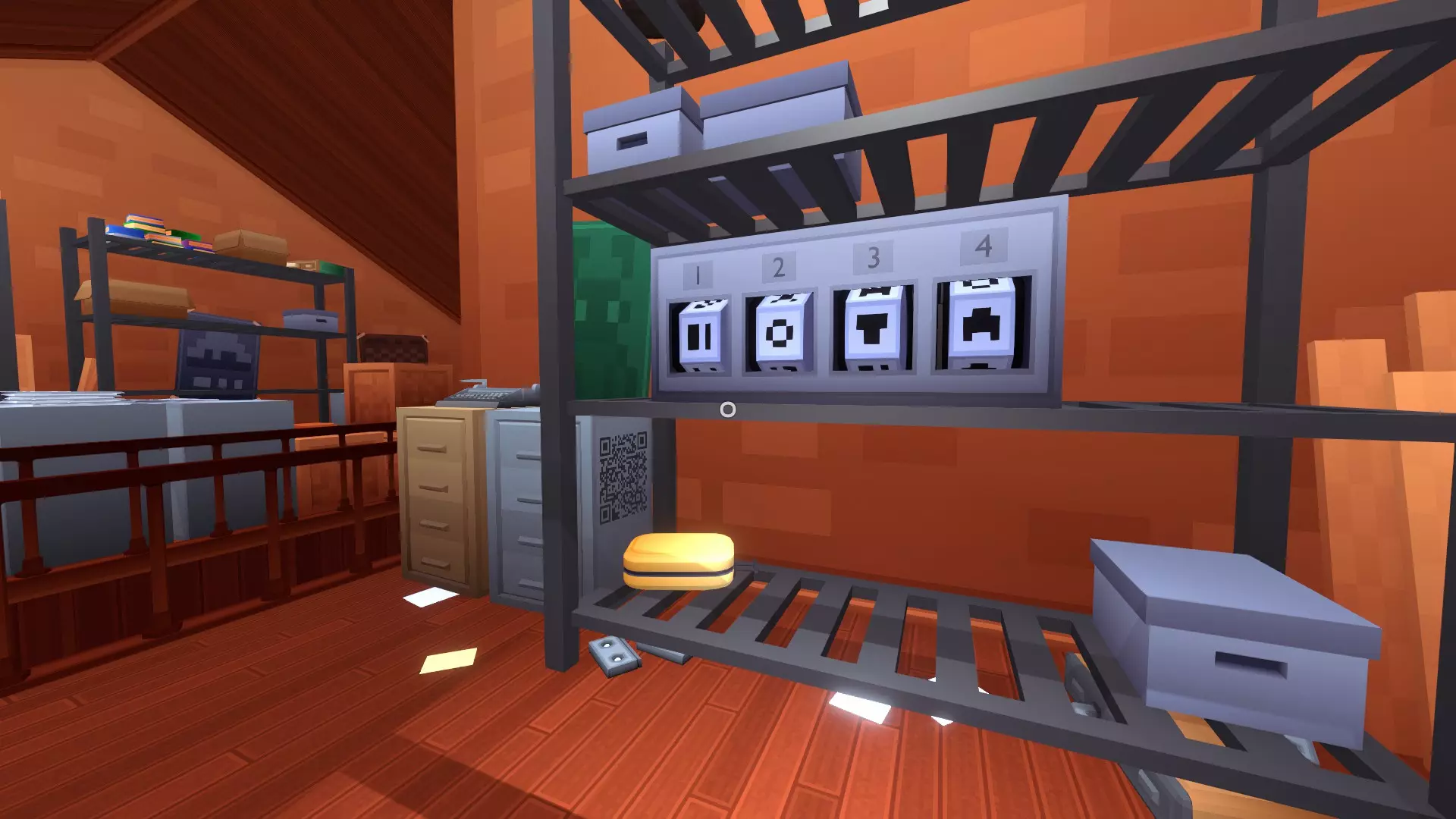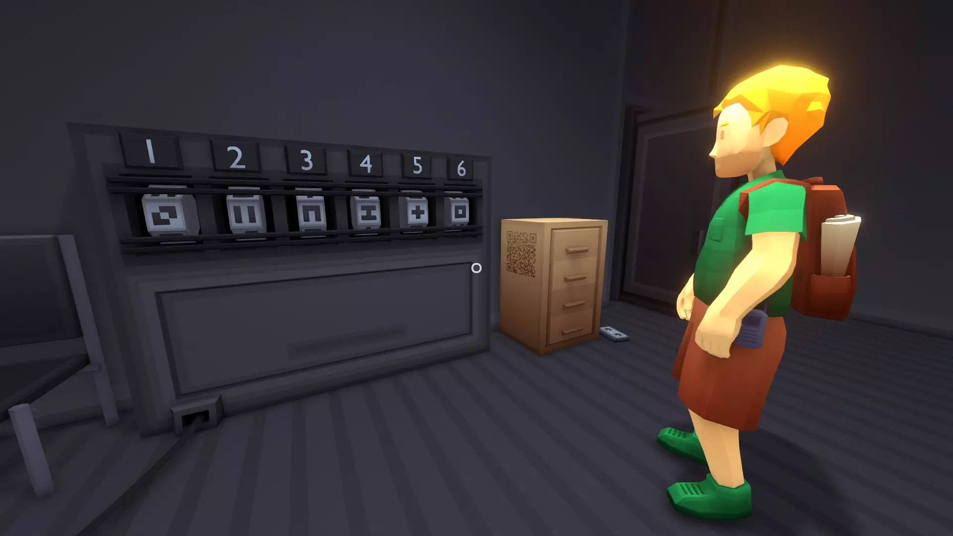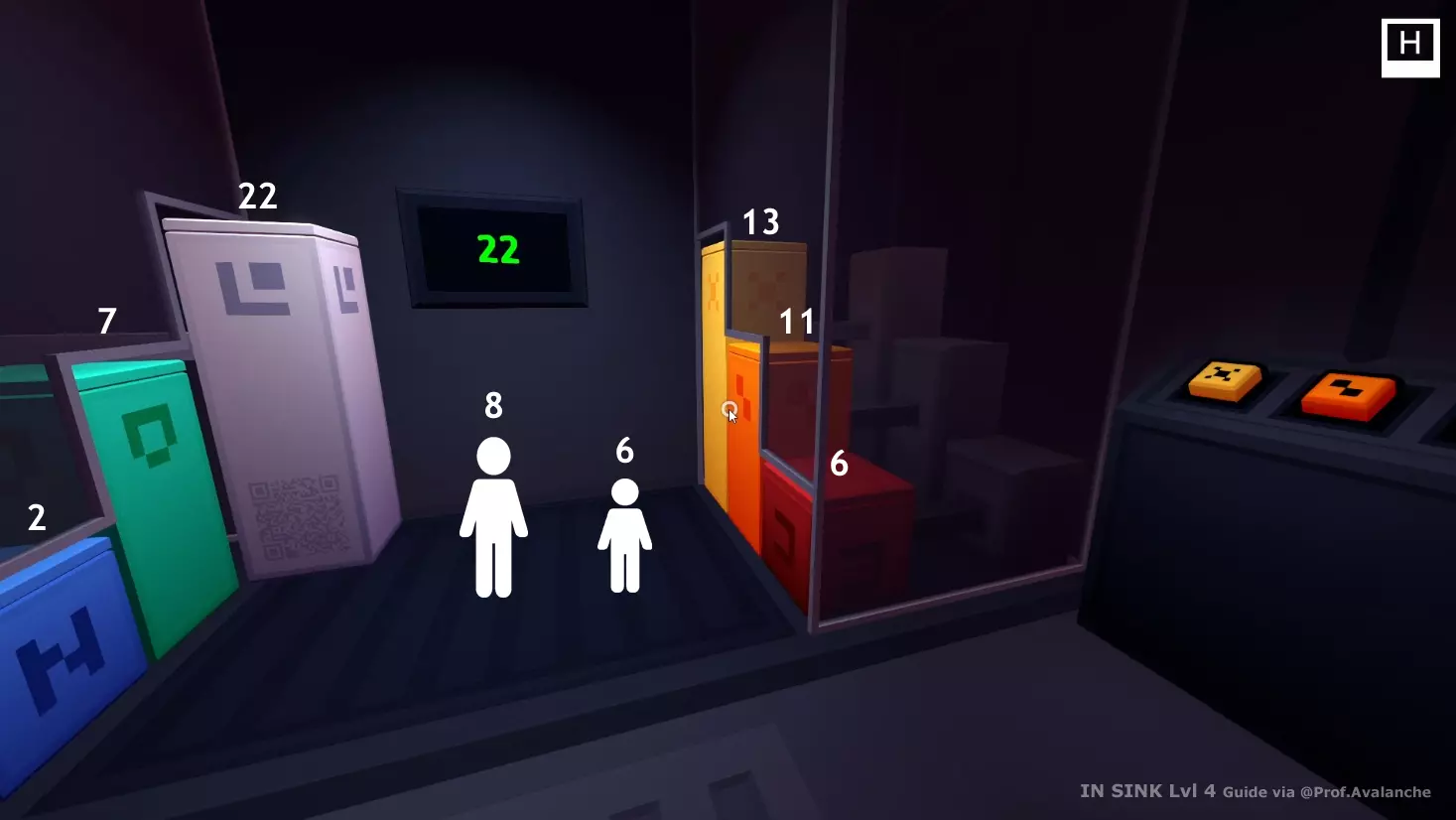 行李间 看看你和搭档按下按钮后会发生什么。 你的担心是对的,这确实是一道数学谜题。 环顾房间——能找到数字吗?是34。 目标是让这个数字出现在体重秤上。但这并非唯一要求。 提示1:称量每个方块。你的角色体重是多少? 我们必须记下所有重量来进行数学计算,给你: (剧透内容占位文本,显示后可见)成人8 儿童6 白色22 黄色13 绿色7 橙色11 蓝色2 红色6