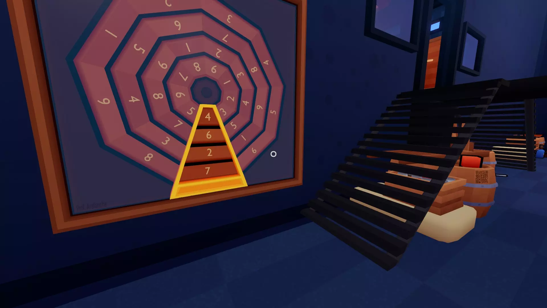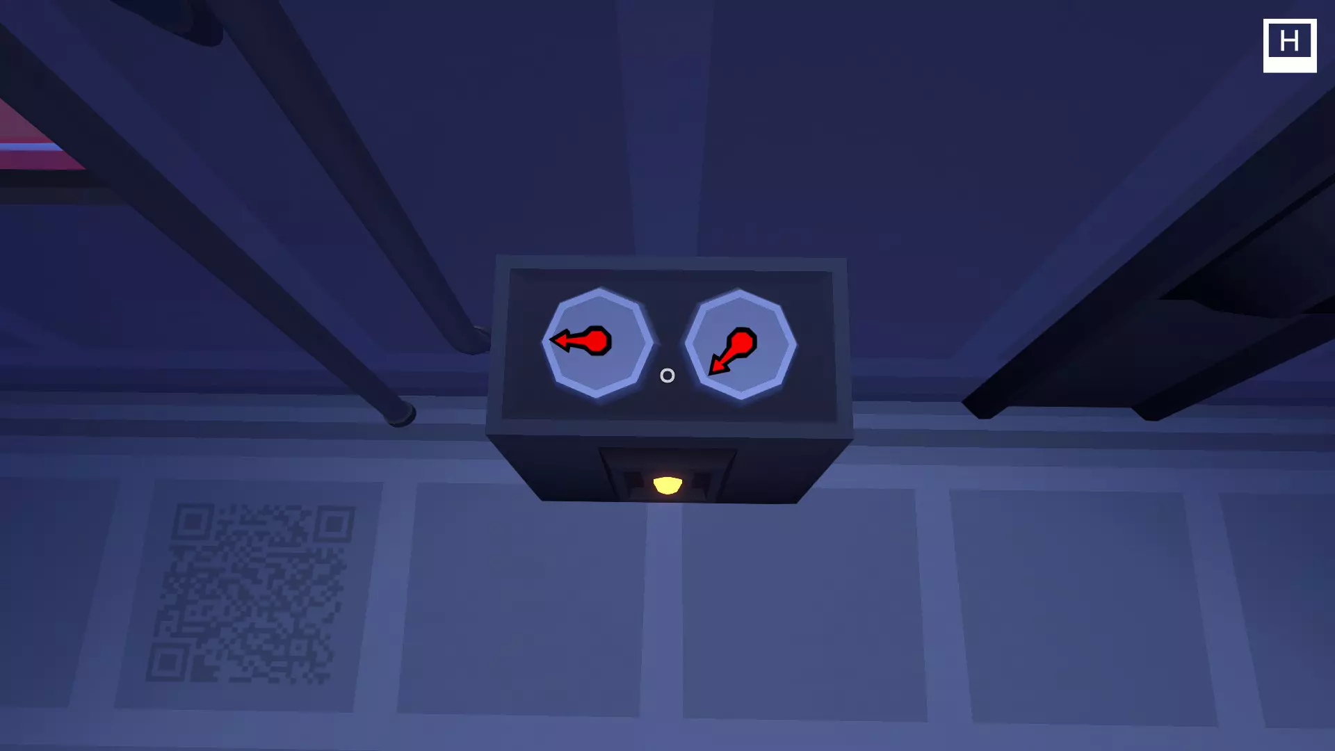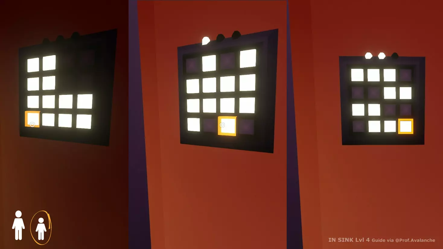 你的犯罪搭档应该会在你旁边的另一个小房间里看到一个红色按钮(你站在压力板上后就能打开那个房间)。他们需要在那个小方块移动到示意图的矩形区域时点击按钮。如果时机正确,你们俩都会听到“叮”的一声。如果时机不对,那你就得和搭档【In Sink ©】配合,重新再来一次。你需要再重复两次这个操作。叮。叮。就是这样,这就是那个谜题。好了,教授,接下来就交给你了。在一楼,会出现一个有4个设置的滑动面板。正确的设置会显示在电视上,但显示的是横向的。注意箭头的方向来确定哪一面是朝上的,然后将这些设置输入到滑动面板中。完成本关卡的所有谜题后,成就将解锁。恭喜!