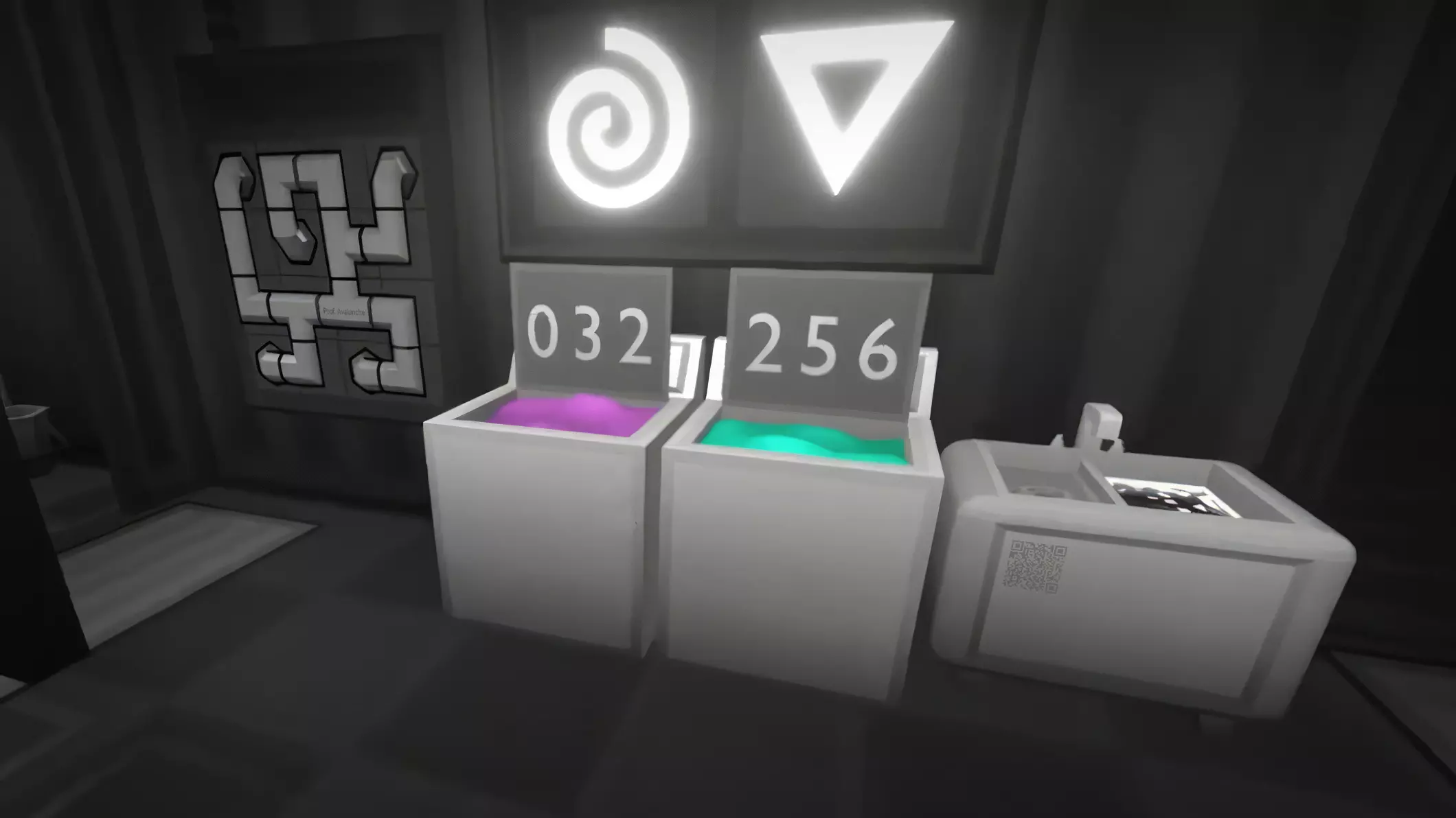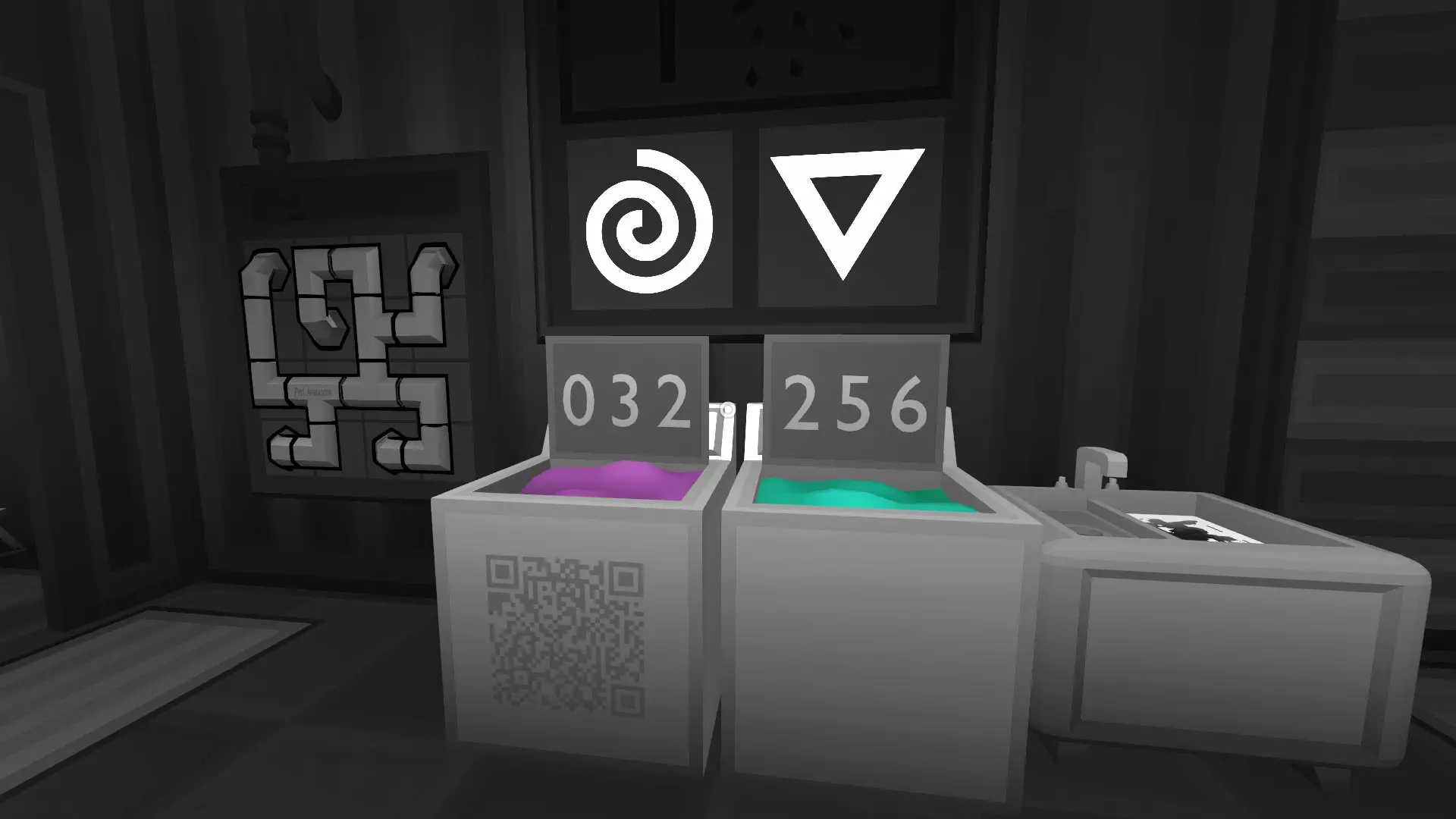 引用自Prof. Avalanche:我将简要提及一些可能引起困惑的缺失信息; 要让代码出现,每个玩家都应在附近的房间洗个澡。 而要让淋浴正常工作,需要修理管道。管道的解决方法已在图片中展示。 如果你在房间里四处走动一下,就会发现…… (第一面板)
