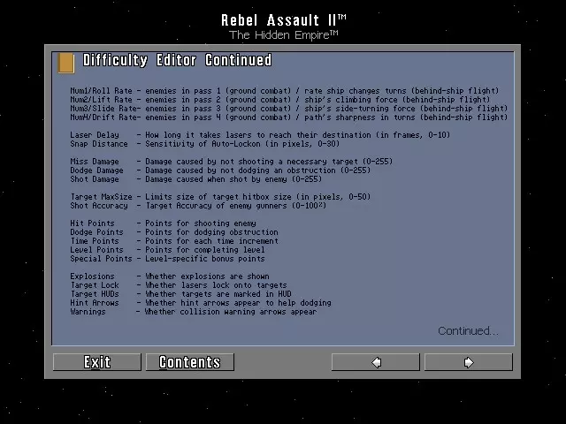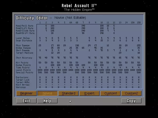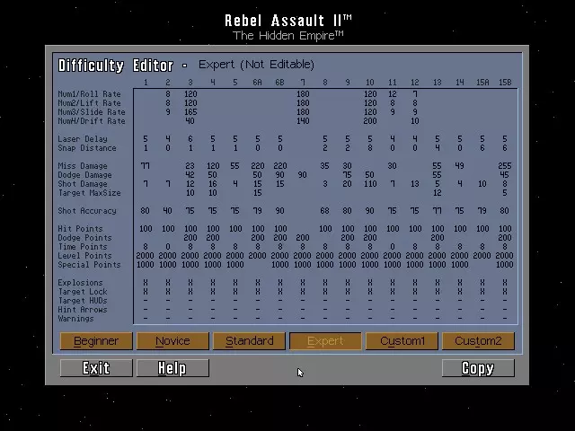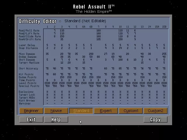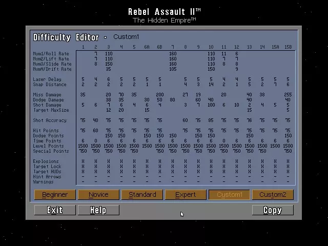 本指南提供《星球大战:叛军突袭2:隐藏帝国》的作弊码及秘密内容。 1. 作弊码 要使用以下作弊模式,请按住ALT键并按下V键。此时会出现提示“Enter Access Code:”(输入访问码): - 原力模式:输入LETGO + 键减少所受伤害 - 键恢复所受伤害 - 尤达力量模式:输入ISNOTRY 注意:必须先激活原力模式才能使用尤达力量模式 - ESC键:跳至下一个过场动画 - ALT + J,然后输入对应数字以跳至指定关卡:关卡1-9使用数字1-9,关卡10-15分别使用A、B、C、D、E、F - Alt + P:开启游戏自动演示模式 - Alt + M:进入电影模式,连续播放《星球大战:叛军突袭2》中的所有过场动画感受黑暗面:输入JOINME ***你必须已激活原力模式和尤达力量模组*** Alt + S = 在游戏开始后使用一次,将你当前的飞行员转换为【超级飞行员】,即有资格进入所有章节的飞行员。 Alt + C = 捕获当前画面并将其保存为一个带有唯一编号的.LBM图像文件到你的存档目录中。 Alt + F = 捕获15帧画面,保存为带有唯一编号的.LBM图像文件。在捕获15帧画面之前,可以重复按此组合键来捕获无限数量的帧画面。初级难度密码 DOMINUS = 最终关卡 JABBA = 第02关 ENDOR = 第03关 LACHTON = 第04关 BORSK = 第05关 FERRIER = 第09关 GALIA = 第10关 DENARII = 第11关 SADOW = 第12关 ONDERON = 第13关 ALEEMA = 第14关 CATHAR = 第15关 新手难度密码 MIRALUKA = 最终关卡 EWOKS = 第02关 CHEWIE = 第03关 DANKIN = 第04关 NOGHRI = 第05关 CHAMMA = 第06关 Incom = 第07关 Kothlis = 第08关 KOTHLIS = 第09关 KRATH = 第10关 SIOSK = 第11关 ADEGAN = 第12关 AMANDA = 第13关 AMBRIA = 第14关 SYLVAR = 第15关标准难度密码 CARRACK = 最终关卡 BANTHA = 第02关 KATANA = 第03关 DENGAR = 第04关 PELLAEON = 第05关 ITHULL = 第06关 CHURBA = 第09关 ARTOO = 第10关 SATAL = 第11关 LOBUE = 第12关 DNABA = 第13关 STURM = 第14关 CRADO = 第15关 专家难度密码 PESTAGE = 最终关卡 ANAKIN = 第02关 KENOBI = 第03关 FORTUNA = 第04关 MODON = 第05关 OMMIN = 第06关 KIIRIUM = 第09关 GUNDAR = 第10关 DIANOGA = 第11关 ATUARRE = 第12关 ESSADA = 第13关 PAPLOO = 第14关 NASHTAH = 第15关 自定义1-2难度密码 第2章 = WOOKIE 第3章 = DROID 第4章 = RODIAN 第5章 = BPFASSH 第6章 = KSHYY 第7章 = TORVE 第8章 = SLUISSI 第9章 = PALANHI 第10章 = DROKKO 第11章 = NATTH 第12章 = SABACC 第13章 = ANDUR 第14章 = ARKANIA15 = 迪亚斯 终章 = 德里博 你可以自定义“自定义1”和“自定义2”的整体难度数值,通过调整这些数值,你可以将生命值上限设为99,分数上限设为9999999,还可以通过将敌人、墙壁、危险物等造成的伤害设为0来启用无敌模式。 7. 备用卢卡斯影业标志 备用开场1:在主游戏菜单中,选择“继续开场”时,同时按住B、O和T键,将播放一段备用视频序列。 备用开场2:在主游戏菜单中,选择“继续开场”时,同时按住F、O和X键,开场视频将会播放,但开头会有一段简短而滑稽的序列。 8. 歪心狼冲锋队员 游玩或跳转到第11章【星际驱逐舰】的第三次遭遇战(可使用上方的尤达力量模式)。在仍有冲锋队员剩余时,射击上方舰桥上的三个支撑塔。视频片段将播放一名队员被坠落的舰桥砸中、另一名队员跳下悬崖的画面。若要观看秘密动画,请在视频片段结束前按住【W】和【B】键,并保持按住直到秘密片段开始。 字幕:呀哈! 9. 游戏手册