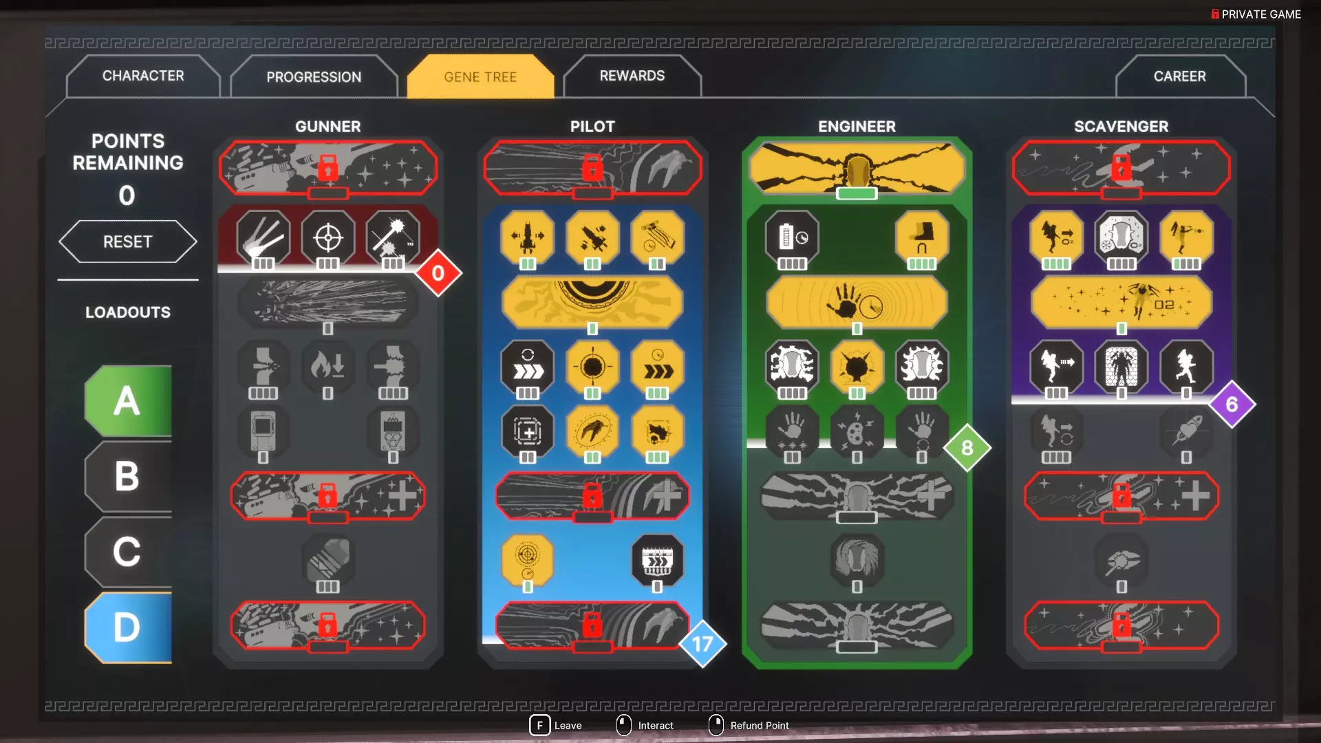 有一点我想说明的是,在单人游玩时,无论是哪个职业,【孤独哨兵号】都是唯一的选择。我希望能推出更多适合单人游玩的舰船。 至于我的技能树,我是这样搭配的。其优缺点都很明显,但还是可控的。 优点: 1) 我使用工程师的技能,并将【磁力靴】升到满级。这在需要快速撤离时同步充能虚空引擎非常方便,而且在进出虚空时进行内部维修也很实用。最后,【强化延长】对于过度充能你的【B.R.A.I.N炮】至关重要。相信我,这绝对是个优势。 2) 由于我们在大部分航行时间都要待在舵手位,所以将大部分点数投入到飞行员技能上是合理的,主要用于方向控制、进攻控制和防御控制。3) 在最新更新中,每个职业新增了1-2个新专长。如果寻路者/驾驶舱算作系统模块,那么所有枪械将获得25%的伤害加成和10%的精准度提升。这些加成会在强化和遗物效果之前生效。 4) 最后,拾荒者技能树会分配剩余的点数。氧气容量翻倍,氧气消耗降低的同时提升推进距离。投掷技能在突袭或亵渎等任务中也非常实用。 缺点: 1) 无法进行虚空行走。这是最大的缺点,尤其是在即将被拦截时。你很可能会陷入措手不及的境地。 2) 没有充氧医疗包或喷气背包冲刺。这两个技能缺失虽然可以应对,但如果因未知原因导致飞船上没有生物质,你可能会陷入困境。