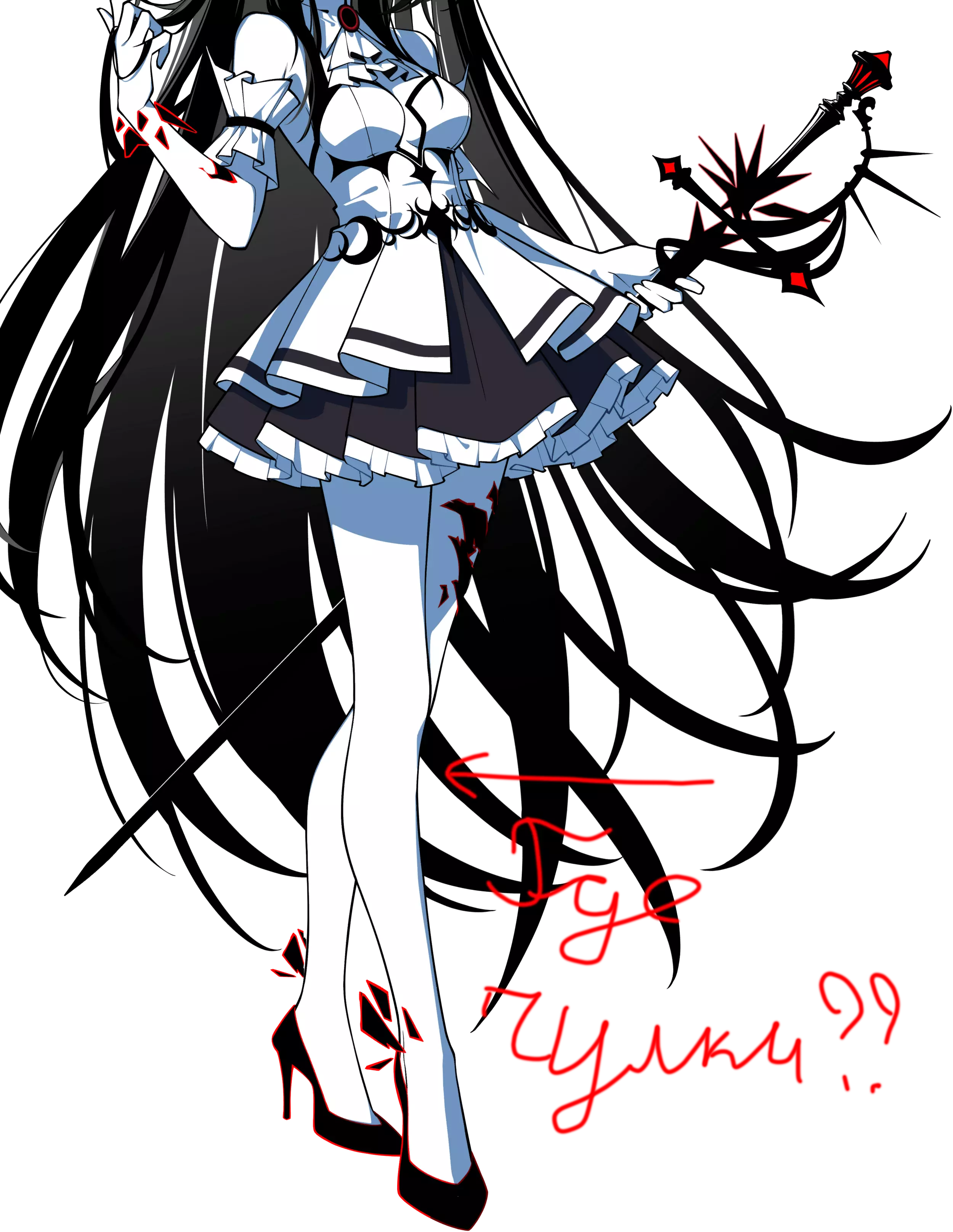 我们可以注意到,除了失踪之外,还出现了一个未知的皮带。袜子的松紧带可能就藏在它下面。除此之外,她还有一双相当奇怪的鞋子。到目前为止,那个长长的鞋跟到底是不是鞋跟,还是说那其实是袜子的一部分,这仍然是个问题。我会把它当作袜子的一部分,因为对于这样长的鞋子来说是不自然的。此外,另一个鞋跟有着相同的花纹,所以这很可能真的是袜子的一部分。但现在我们看到的是黑暗莉莉丝: