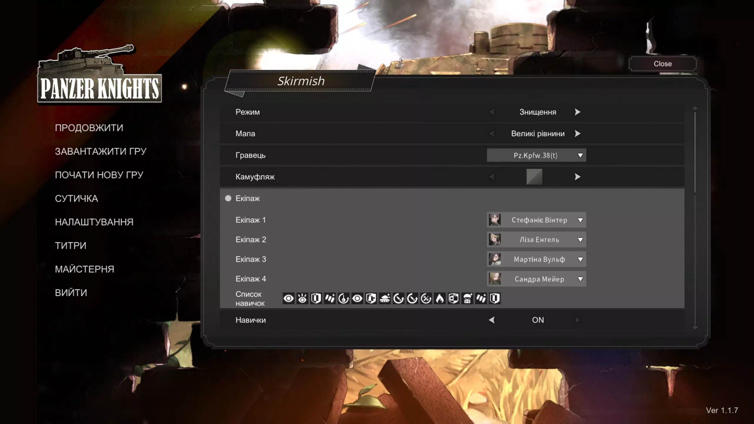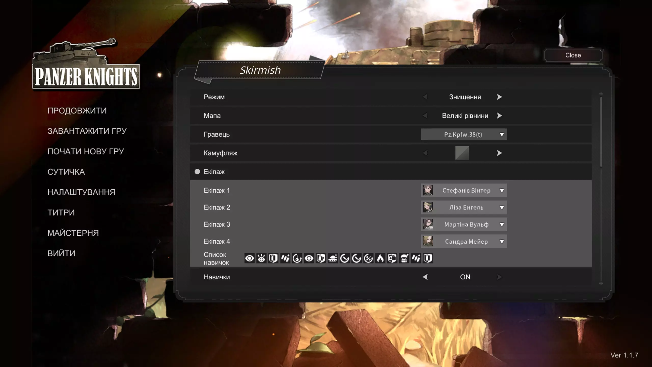 游戏翻译(从英语到乌克兰语) 创建原因 如何安装翻译? 游戏下载文件。(已更新于2024年9月25日)我决定请其他人帮忙翻译,您看到的链接是可供下载的最新翻译版本。 要安装翻译,请下载文件,按照以下路径进入游戏文件: 【您安装Steam/游戏的磁盘】Steam steamapps common Panzer Knights Panzer Knights_Data StreamingAssets table 将文件放入并替换原有文件。文件尚未翻译完成,但每次更新后,文件都会上传到此处,指南也会随之更新并提供新的文件链接。已翻译行数:未知。游戏的完整翻译将在完成后发布,也会发布在该游戏的Steam创意工坊。截图