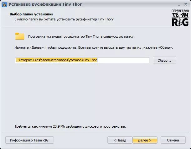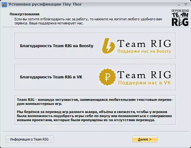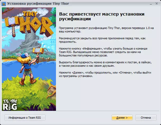 RIG团队制作的文本俄化补丁,保持原汁原味。为追求美感,安装程序界面采用了《Tiny Thor》的游戏配色风格。 说明: 俄化补丁完全免费分发。禁止将本俄化补丁用于任何商业用途。 游戏俄化补丁按“原样”提供,即不附带任何形式的担保。使用本模组的风险由您自行承担。翻译团队不对因使用或不当使用本模组而导致的任何数据丢失或损坏、任何收益损失负责。安装俄语化补丁后,游戏设置中英语选项将替换为俄语选项。使用俄语化补丁不会导致账号封禁。翻译兼容Steam并已适配游戏最新版本。 安装汉化后,不建议运行缓存完整性验证。 所有未在此明确授予的权利均归版权所有者所有。 更新历史: 1.0 版本 12月16日2023年正式发布 参与翻译人员: 负责人 - Владимир KitchenThinker 技术部分: Владимир KitchenThinker Евгений Попов Decoder 文本: Владимир KitchenThinker 设计: Владимир KitchenThinker 测试: Владимир KitchenThinker 截图及删除顺序: