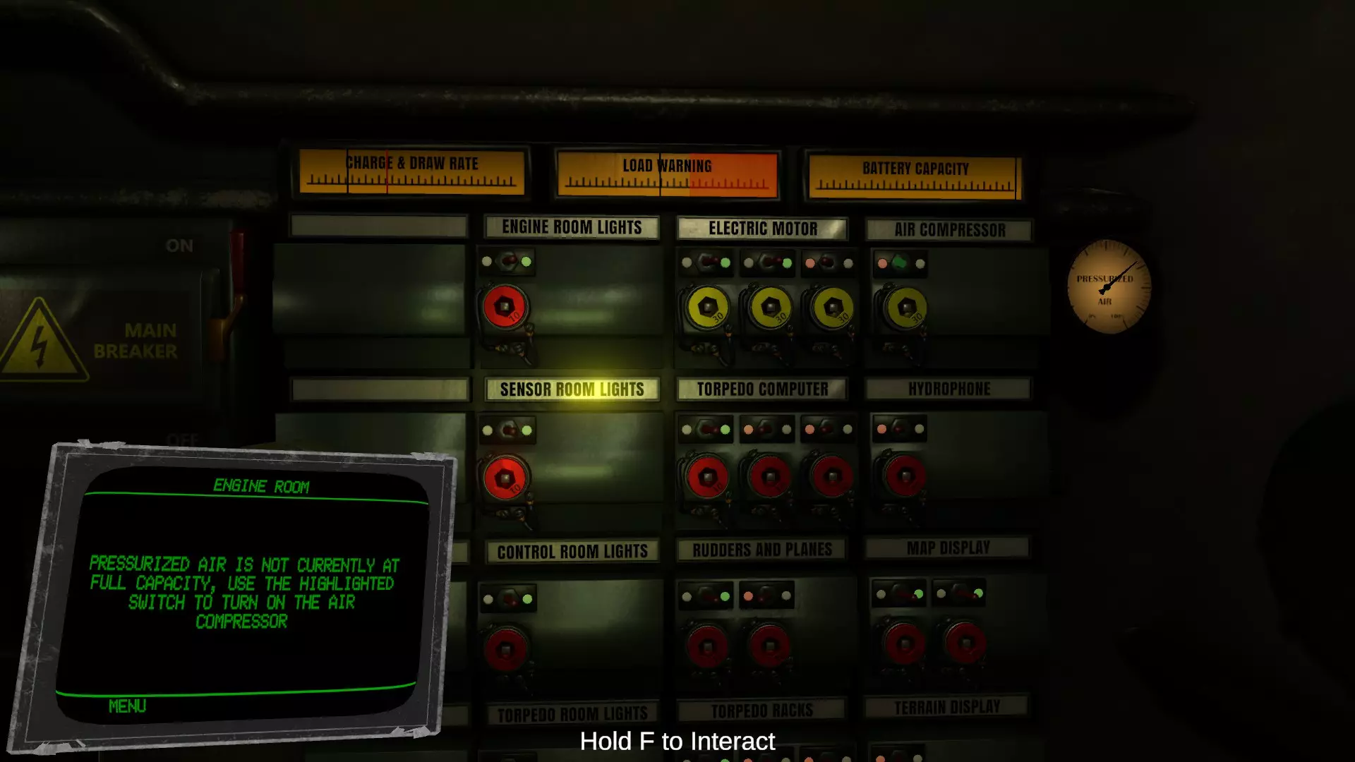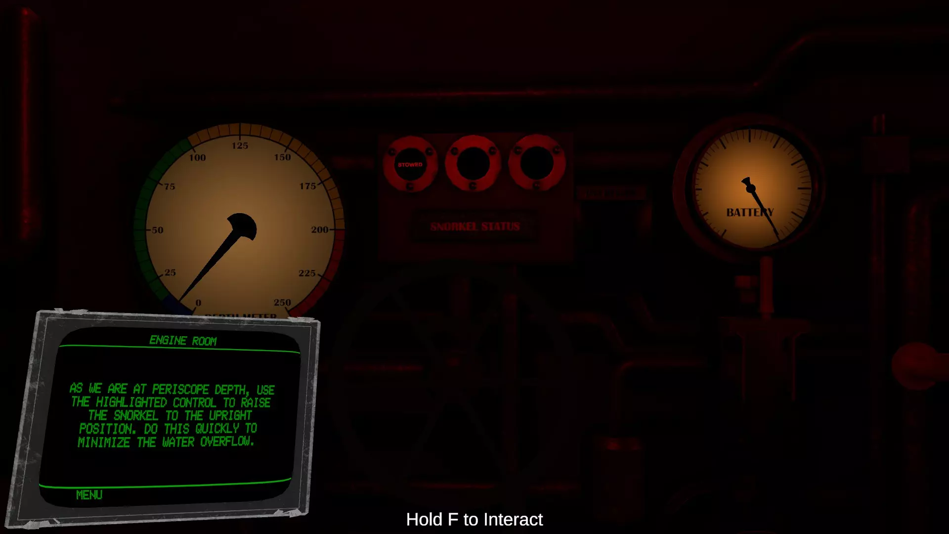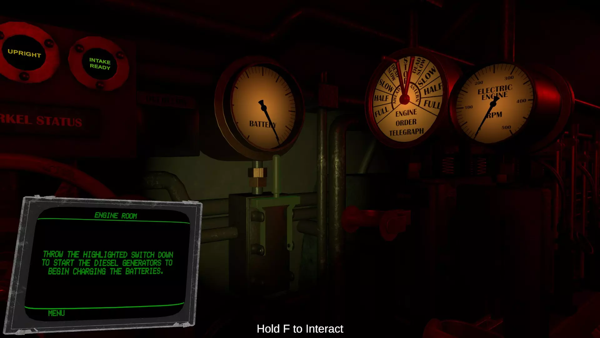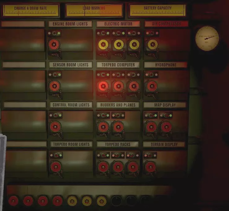 上部有标有【Battery】的仪表,中间是开关,下部有标有【Diesel】的仪表。这些与驾驶室的仪表相同。使用开关可切换柴油驱动(发电、充电)和电池驱动。当潜航深度超过潜望镜深度导致无法吸入空气时,会自动切换到电池驱动。 【Engine order telegraph】也是与驾驶室相同的仪表。当驾驶室发出指令时,会伴随钟声切换显示。上下移动下部的杠杆可切换前进和后退。【Electric engine RPM】显示推进用电动机的转速,通过下部的杠杆可提高输出功率。只有完成这些操作后,潜水艇才能启航。 在潜望镜深度以下的海中会持续消耗电池。当电池电量下降时,手腕上的设备会发出警告音并显示消息。电池耗尽后,整艘潜艇会断电,除压载系统外的所有功能都将停止。