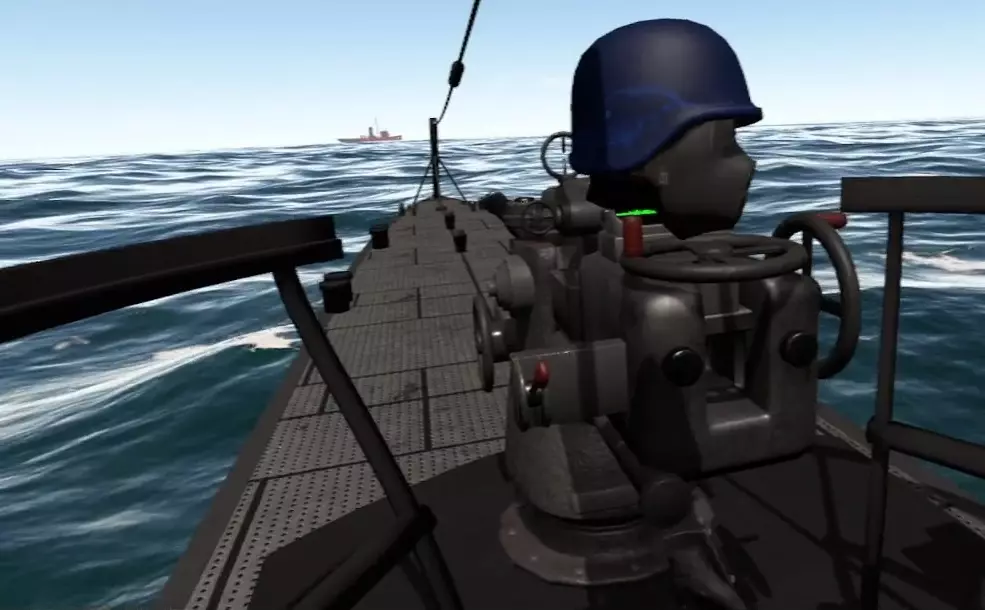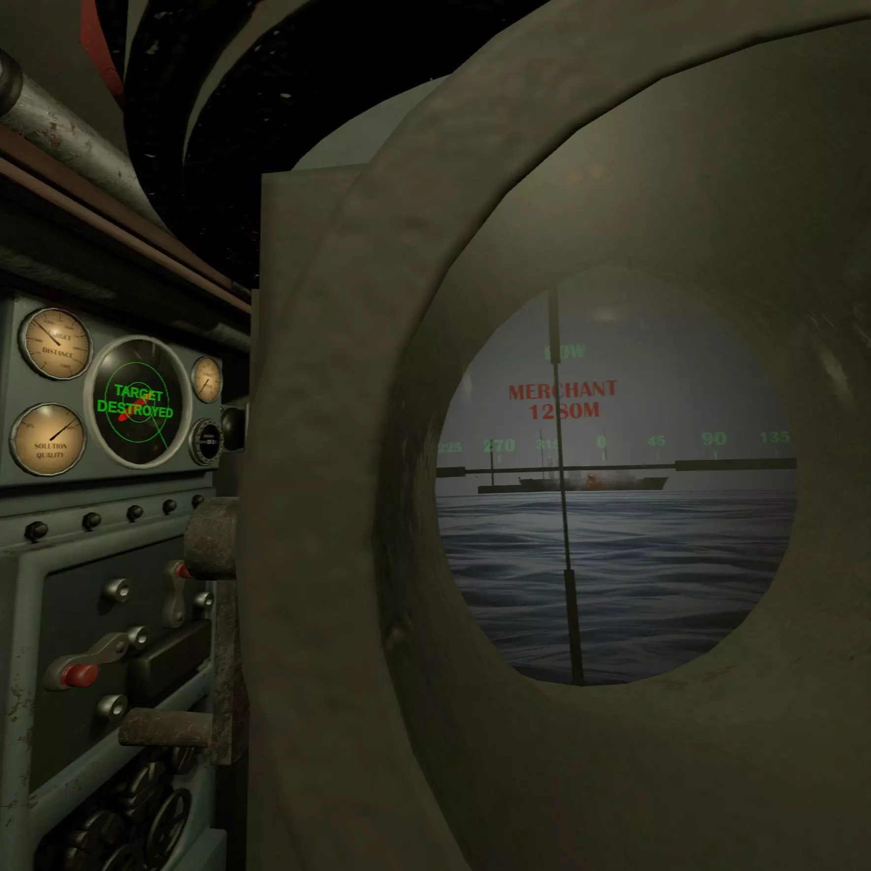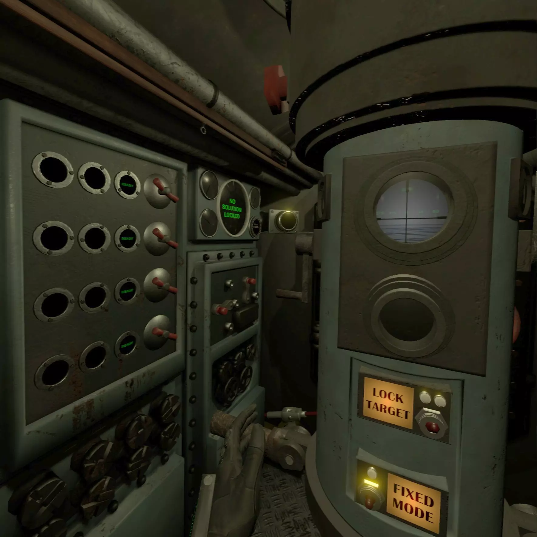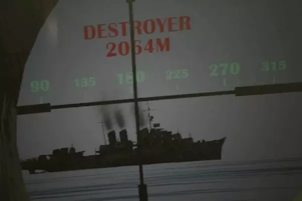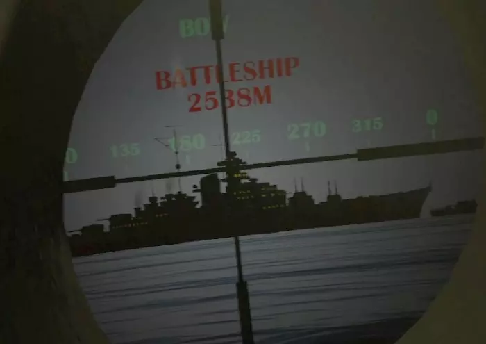 房间的天花板上收纳着潜望镜,抓住红色把手将其降下。使用该把手可调整高度。 左侧的小杠杆向上转动时,船体外的潜望镜会向上伸出;向下转动时则会收起。当潜艇以潜望镜深度潜航时,将潜望镜伸出即可从海中观察外部情况。右侧的杠杆用于切换缩放功能。若在选项中开启了潜望镜标签功能,当准星对准目标时,会以红色文字显示目标名称和距离。 由于船外潜望镜的高度会增加被敌舰发现的概率,因此在完成探索或攻击后,建议将其收起并恢复原位。(未验证) 使用潜望镜下方的【锁定目标】开关进行鱼雷锁定。距离大约1500米左右时可以锁定。只要在按下开关的瞬间捕捉到目标即可,无需一直追踪。之后使用后文所述的鱼雷操作面板。 下方的另一个【固定模式】开关用于固定潜望镜本体的方向。开启后,玩家无需移动身体,只需操作左右手柄即可改变船外潜望镜的朝向。