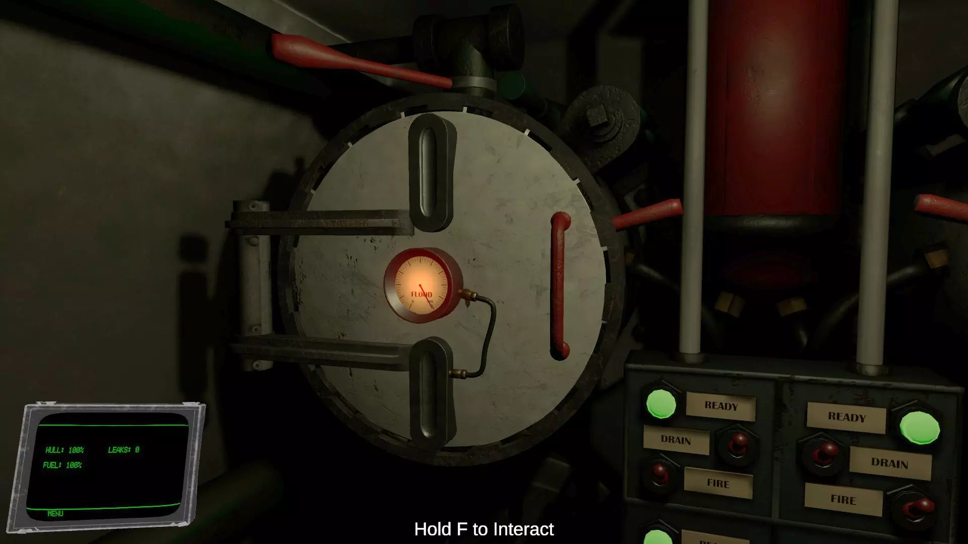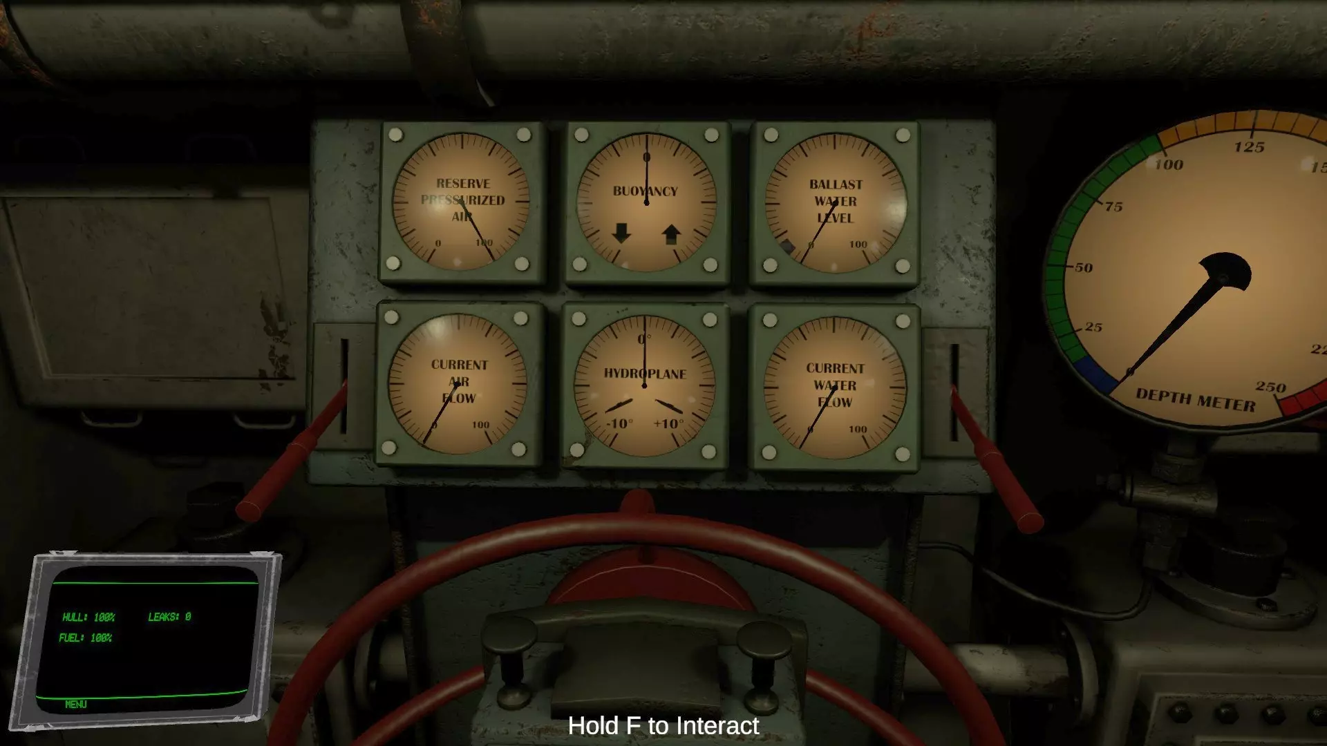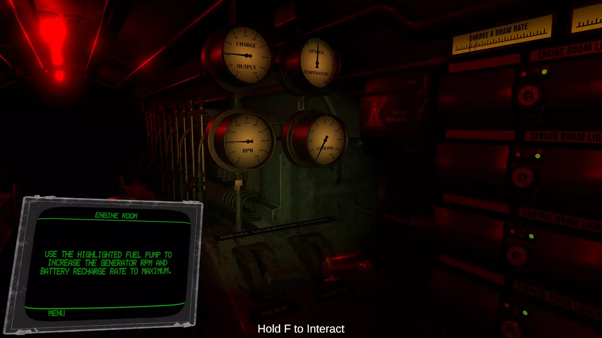 手腕显示器上以百分比显示的【船体】(HULL)项目代表潜水艇的装甲耐久值。当受到飞机机枪扫射、敌舰大炮、深水炸弹等攻击造成伤害时,该数值会减少。 受到攻击后,有一定概率会发生漏水,导致艇内逐渐浸水。手腕显示器上的【漏水】(LEAKS)项目显示的是当前漏水的数量。若浸水持续加剧,潜水艇将会自行下沉。 在驾驶舱和潜望镜室之间的通道门两侧,各设有两个用于修理漏水的焊枪和氧气瓶。漏水只会发生在玩家所在的舱室。当鱼雷室或引擎室发生漏水时,请直接手持火炬或将其放入物品栏的槽位中使用。 房间内的积水需通过持续操作各房间地面的水泵进行排出。若房间完全被水淹没,则需要使用氧气瓶进行修理。 即使装甲耐久值降至0%,也勉强算是安全,尚未游戏结束。但在此状态下受到攻击,将100%引发浸水(似乎还会导致配电盘短路?)。(未验证) 当房间完全被水淹没,导致玩家无法呼吸时,游戏将结束。 引擎室教程中文翻译 当引擎室辅助功能关闭时,此房间用于为潜艇系统、电动引擎以及柴油发电机供电。 潜艇使用消耗电池的电动引擎来推进。柴油发电机可在海面上用于给电池重新充电。