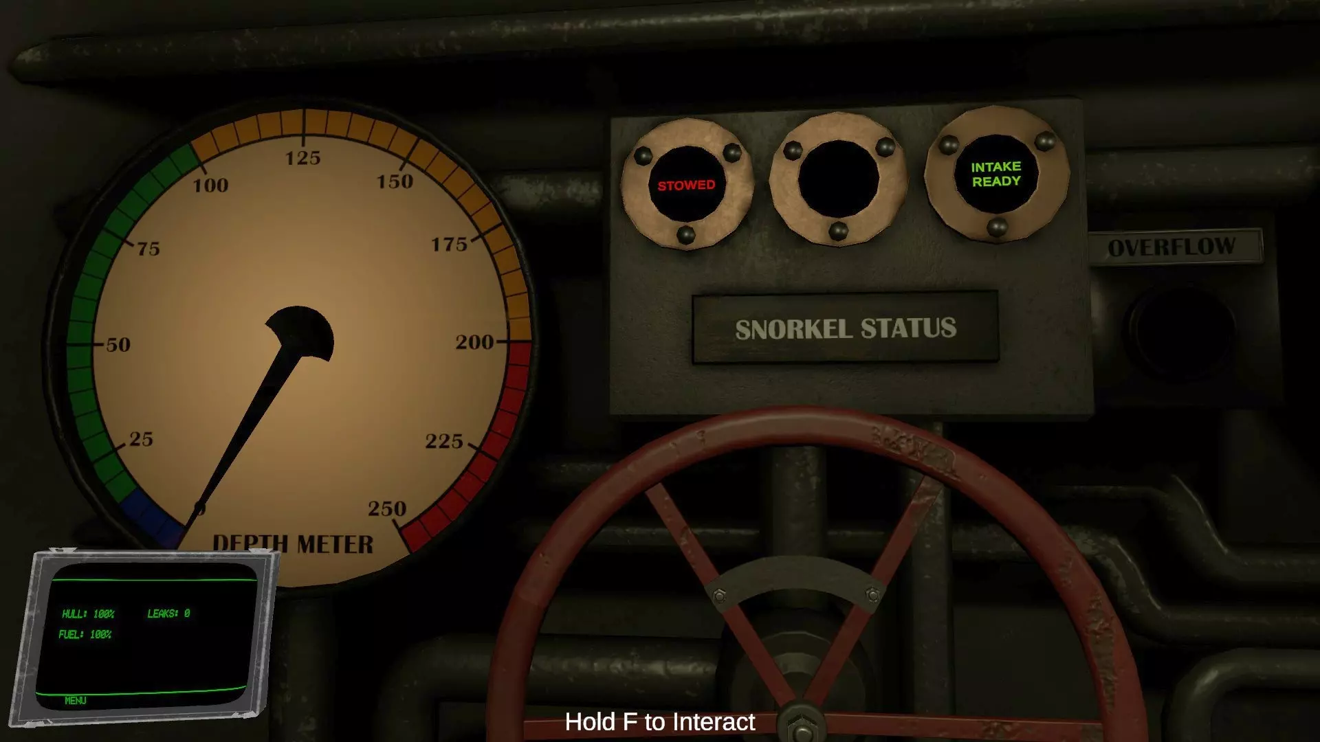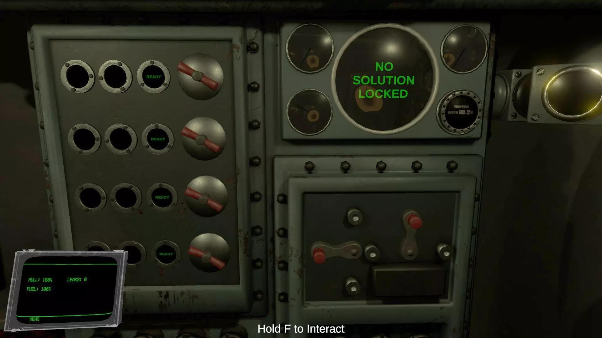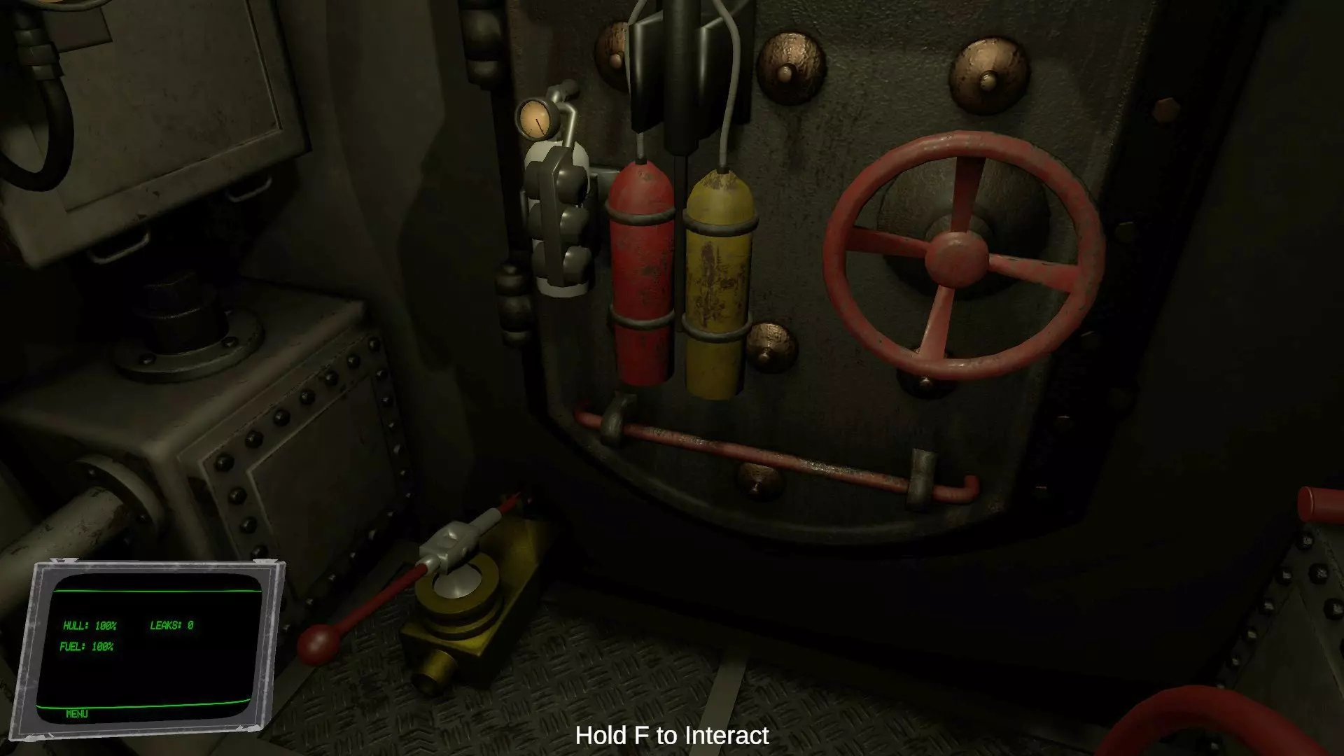 手腕显示器上以百分比显示的【船体】(HULL)项目代表潜水艇的装甲耐久值。当受到飞机机枪扫射、敌舰大炮、深水炸弹等攻击造成伤害时,该数值会减少。 受到攻击后,有一定概率会发生漏水,导致艇内逐渐浸水。手腕显示器上的【漏水】(LEAKS)项目显示的是当前漏水的数量。若浸水持续加剧,潜水艇将会自行下沉。 在驾驶舱和潜望镜室之间的通道门两侧,各设有两个用于修理漏水的焊枪和氧气瓶。漏水只会发生在玩家所在的舱室。当鱼雷室或引擎室发生漏水时,请直接手持火炬或将其放入物品栏的槽位中使用。 房间内的积水需通过持续操作各房间地面的水泵进行排出。若房间完全被水淹没,则需要使用氧气瓶进行修理。 即使装甲耐久值降至0%,也勉强算是安全,尚未游戏结束。但在此状态下受到攻击,将100%引发浸水(似乎还会导致配电盘短路?)。(未验证) 当房间完全被水淹没,导致玩家无法呼吸时,游戏将结束。 引擎室教程中文翻译 当引擎室辅助功能关闭时,此房间用于为潜艇系统、电动引擎以及柴油发电机供电。 潜艇使用消耗电池的电动引擎来推进。柴油发电机可在海面上用于给电池重新充电。