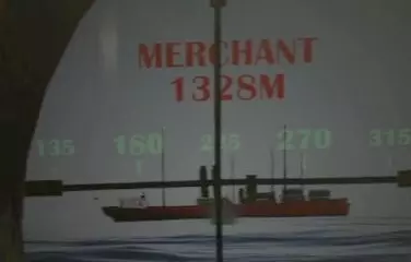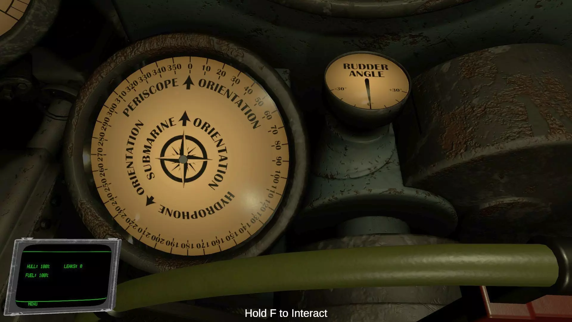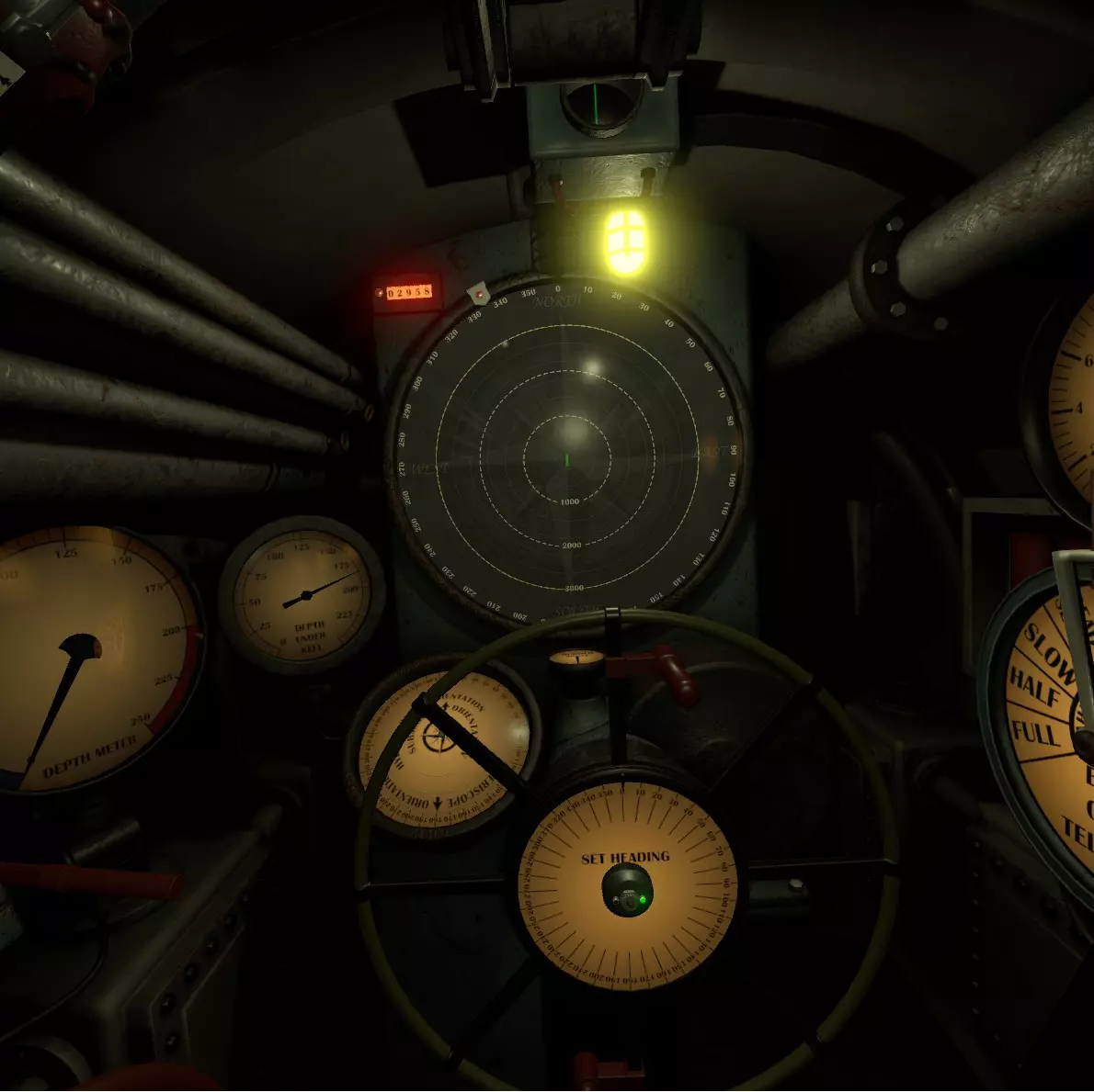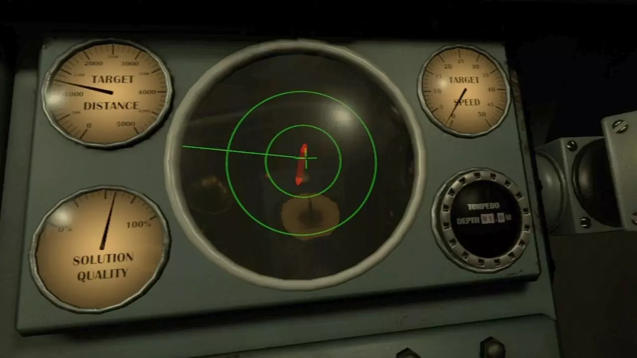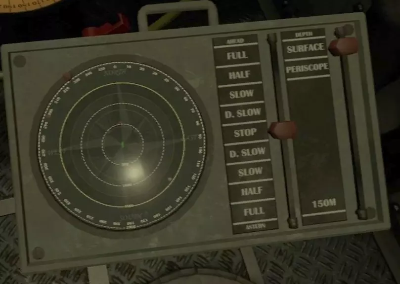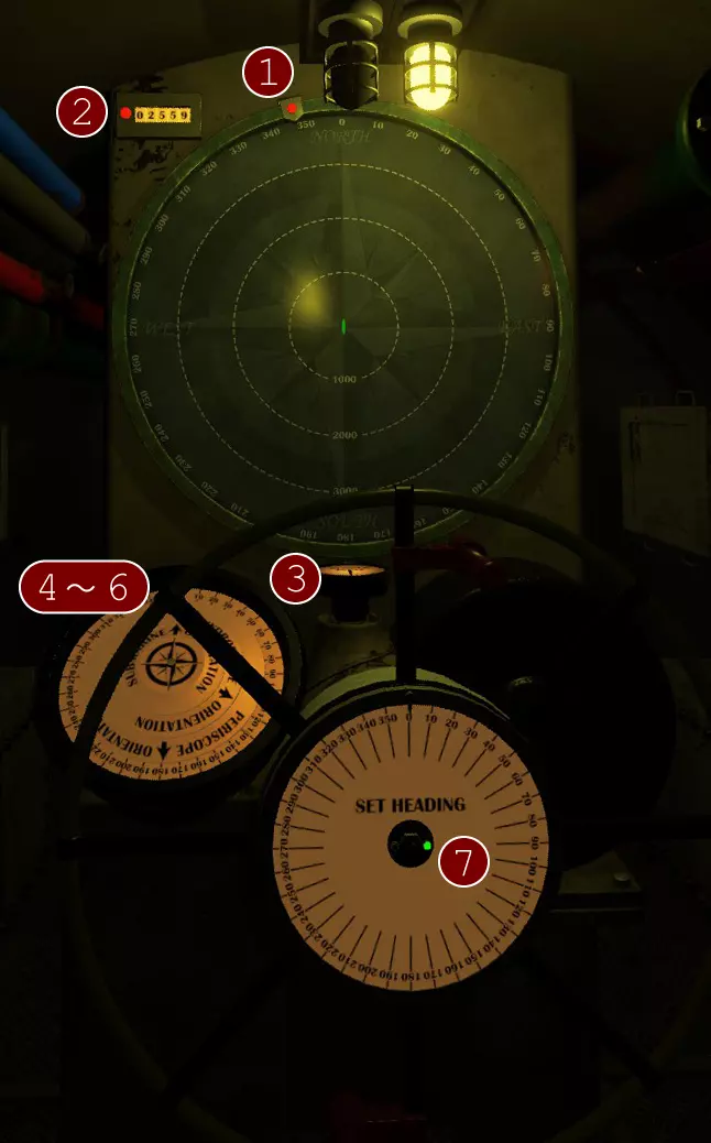 正面圆形的画面是地图。中央的绿色潜水艇图标代表自己的潜水艇。敌方船只和要塞以白色大点显示,海中布设的水雷则以×符号表示。此外,自己发射的鱼雷轨迹用白色线条显示,敌方船只的声呐范围以绿色显示。 潜水艇周围有波纹动画和实线显示的圆圈,代表被敌人探测到的范围。在海上被投掷照明弹的状态→海上航行→下潜航行、转向…按此顺序,探测范围会逐渐缩小,下潜状态下关闭引擎时范围最小。 飞机不会显示在雷达上,请前往外部甲板用肉眼确认。显示敌船的白点由位于潜望镜室的水听器(Hydrophone)进行显示和更新。当辅助功能关闭并切换为手动模式时,如果不持续用水听器捕捉目标,地图上的显示将不会更新。若目的地(Waypoint)辅助功能开启,地图外周会显示指示目标方向的绿色指示灯,左上角则会显示距离。 将地图上部的把手降下,可以看到用于显示海底地图的小型监视器。在海底时将无法移动。 正面前方是用于操控方向的总舵轮(Rudder)。初始状态下,位于中间的【航向设定(自动化)】开关处于开启(绿色)状态。在自动模式下,将刻度盘外周的指针对准数值,船只就会自动转向该数值对应的方向并固定航向。 关闭【航向设定】开关后将切换为手动操作,操作方式与汽车方向盘类似。手动操作相比自动模式能让船只更快地转向。前往远处目的地时建议使用自动模式,而在躲避雷区或与敌船交战时,切换为手动模式会更好。