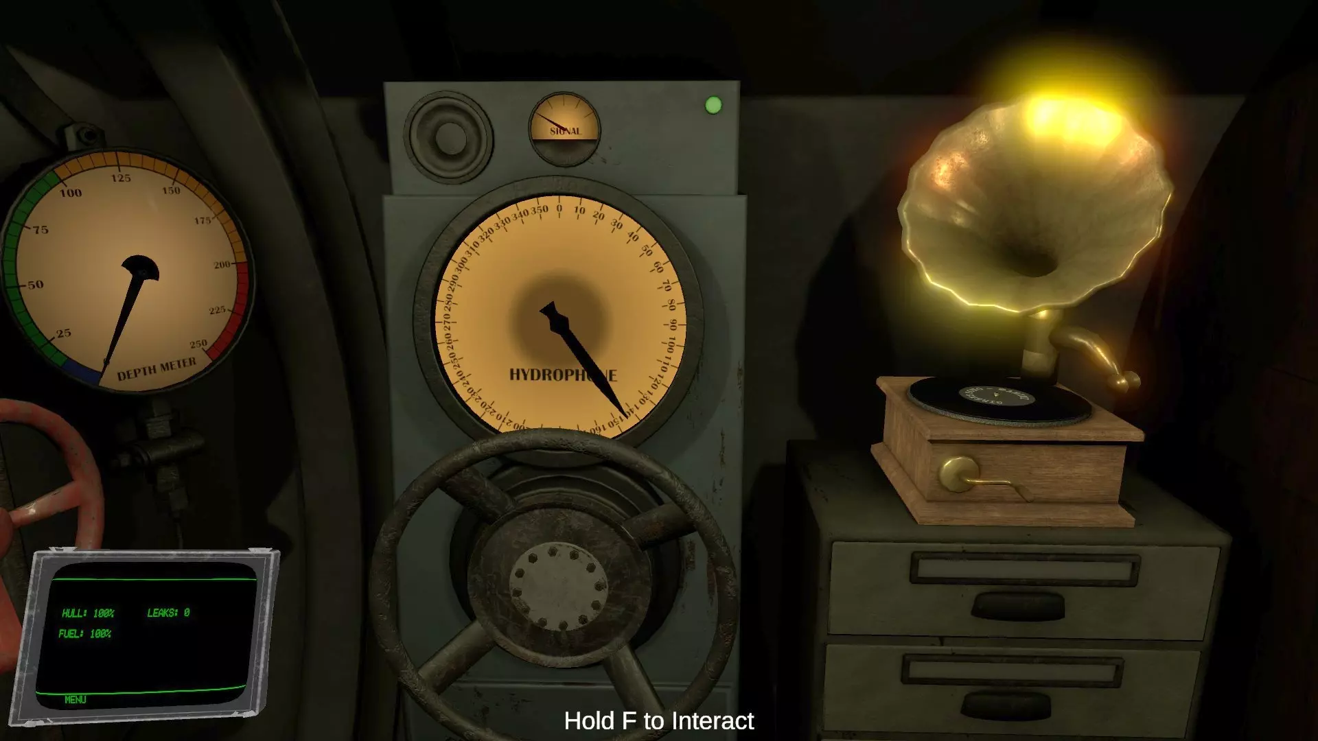 右手边有与操舵室相同的深度计和水下听音器(Hydrophone)。水下听音器用于捕捉水中声音以确定敌船方向,并在操舵室的地图画面上显示和更新敌船位置。 当水下听音器辅助功能关闭、处于手动操作状态时,请使用水下听音器将敌船位置信息发送至操舵室。操舵室的地图显示由水下听音器进行更新。操作仪表前方的手柄可改变指针方向。上部标有“Signal”的小型仪表显示声音强度。捕捉到敌船螺旋桨声音时,整艘潜艇都会响起该声音。不同种类的敌船螺旋桨声音不同,商船发出缓慢的重低音,驱逐舰和战列舰则是轻快的声音。 辅助功能开启时,会像雷达一样自动持续旋转。转动右侧留声机的手柄,音乐就会在整艘船上播放。