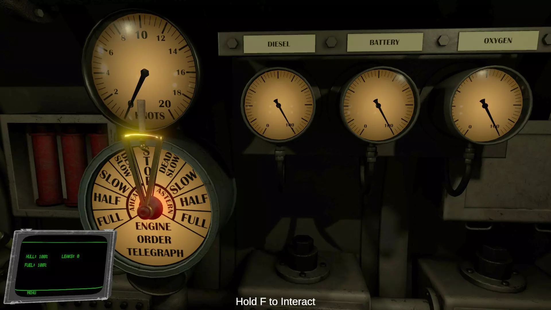 正面右手、画像左手处是显示船只当前速度(节)的仪表。海上最大航速为18节,海中最大航速为6节。进行各种转向操作时速度会下降。此外,发动机输出功率和配电盘的电力管理也会影响速度。 速度计下方是车钟(Engine order telegraph)的操纵杆,可用于控制潜水艇前进或后退。Ahead为前进,Astern为后退。若发动机室辅助功能开启,可直接在此处操作;若为无辅助的手动操作模式,则需向发动机室的仪表发送指令。 右手边并排的三个仪表分别显示柴油(Diesel)、电池(Battery)和氧气(Oxygen)的剩余量。柴油和氧气几乎不会减少(玩一个小时的关卡大概会消耗一半?)。需要关注的只有电池余量。当潜航深度超过潜望镜深度时,发动机发电会停止,转为由电池驱动。 电池耗尽后会发生停电,除压载舱外的所有功能都会停止。开放世界模式下燃料消耗较多。
