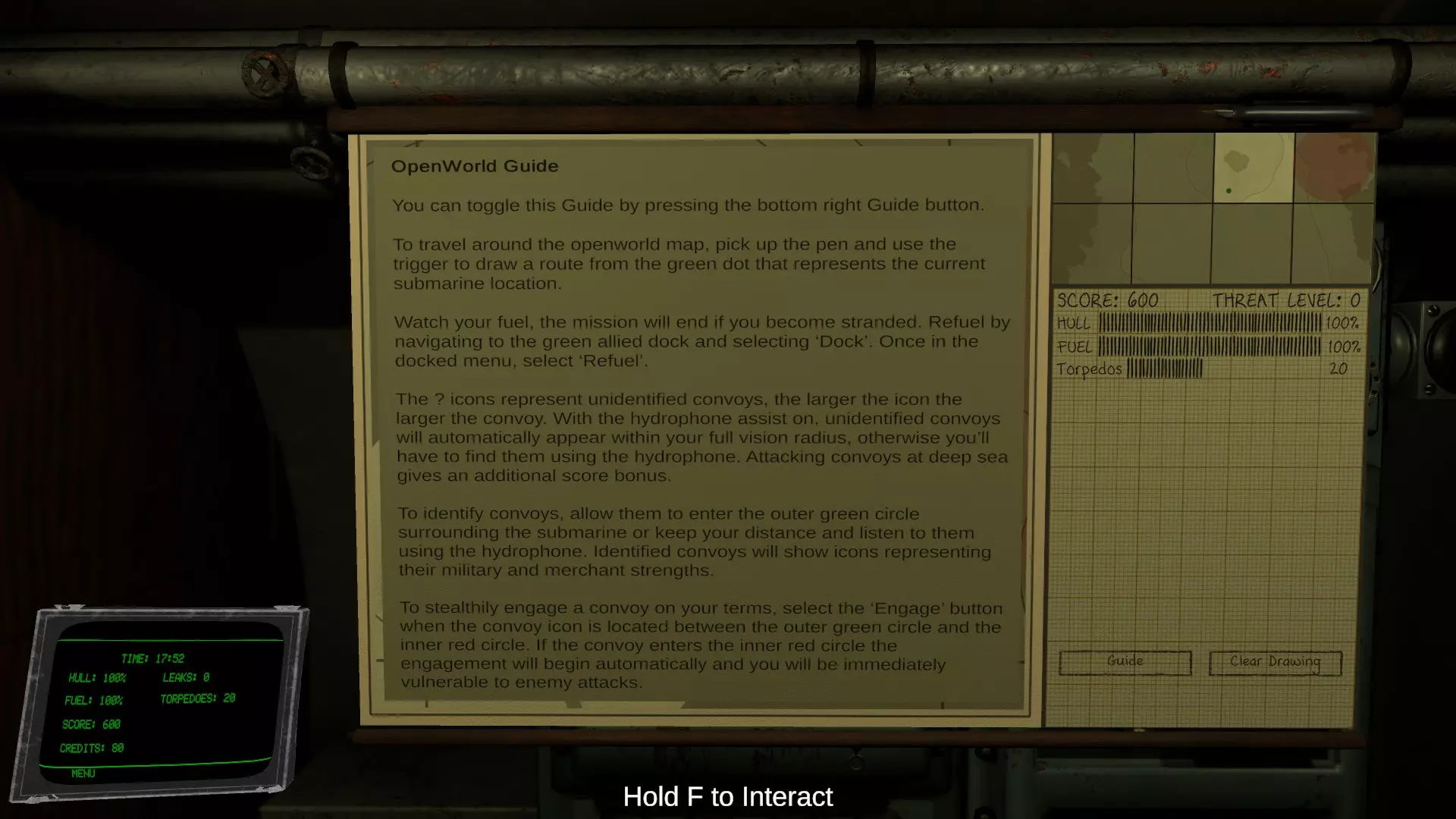 按下右侧的指南按钮,可以切换此指南。 在开放世界地图中移动时,拿起笔并使用扳机键,从代表当前潜水艇位置的绿色点开始绘制路线。 请注意你的燃料。如果燃料耗尽导致搁浅,任务将结束。前往绿色的同盟船坞,选择【船渠(Dock)】进行加油。当船坞菜单出现时,选择【给油(Refuel)】。