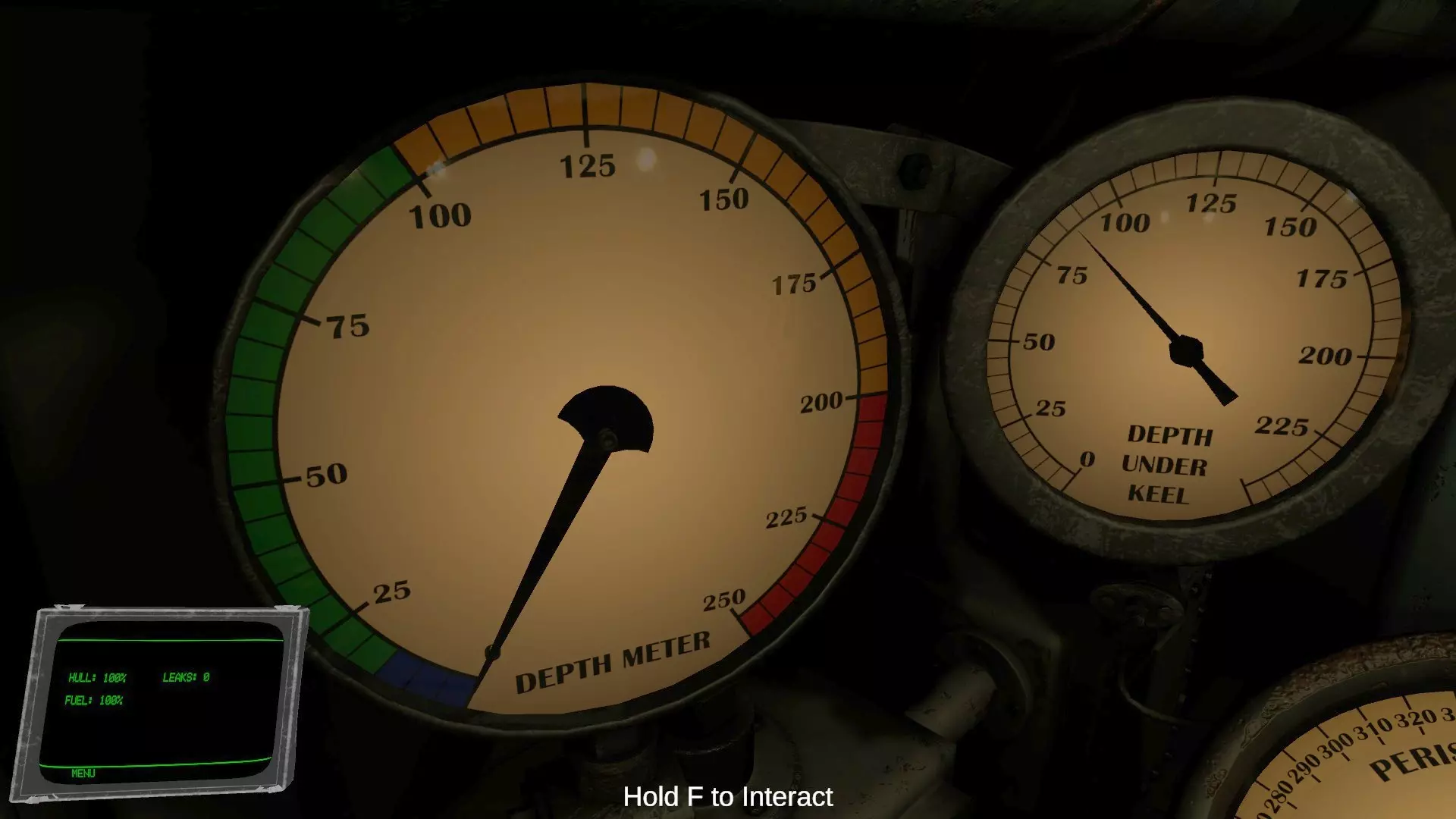 仪表盘右侧的是深度计。刻度的蓝色部分为潜望镜深度,绿色部分为更深的海中,黄色及以后为深海区域。从黄色区域开始,水压会对船体造成伤害,越接近红色区域,伤害量越大。在与驱逐舰战斗需要躲避声呐时,需要潜航至黄色及以后的深度。 进行潜水或浮上操作后,到船只实际开始移动(深度计显示变化)之间会有相当长的时间差。基本上需要一边观察潜水浮上用的6个仪表数值一边进行操作。如果只盯着深度计操作,可能会导致过度潜水,或者不必要地消耗大量空气。深度计为右手的仪表,龙骨下水深(Depth under keel)表示船体与海底的距离。
