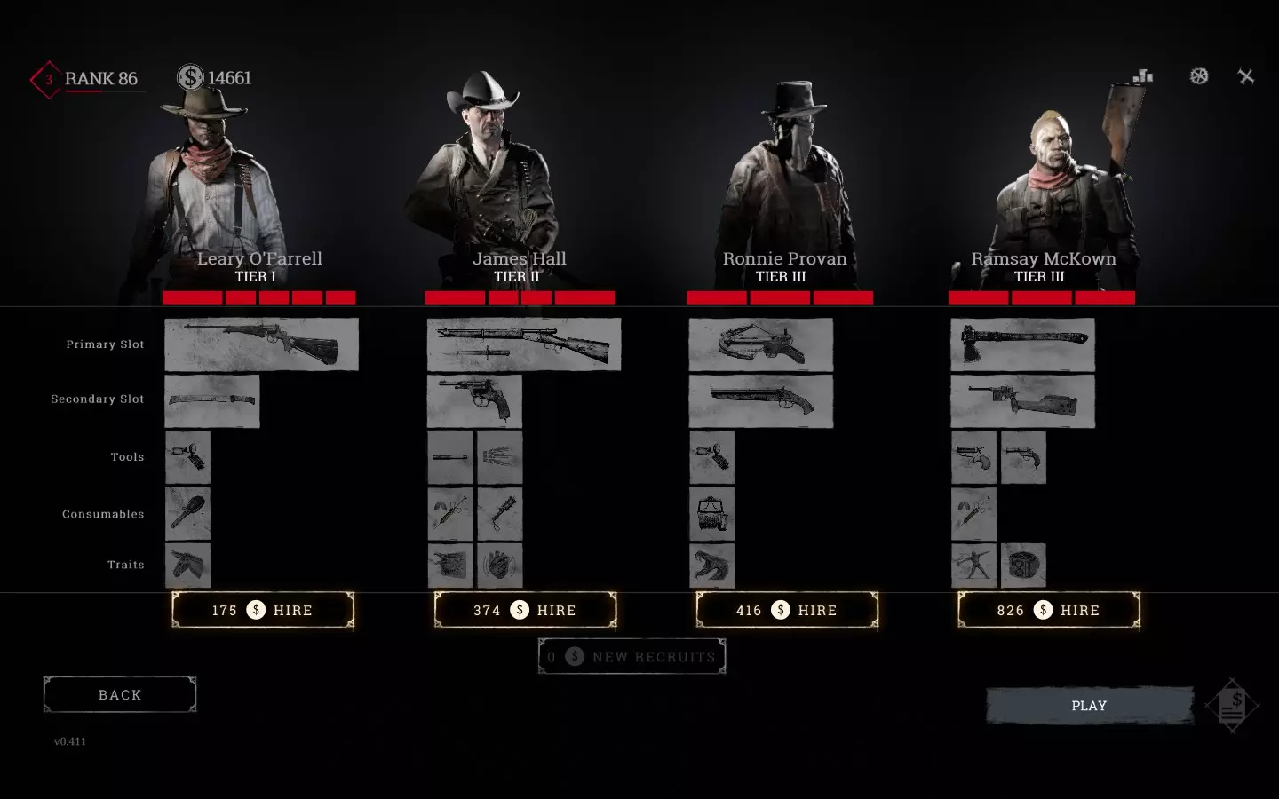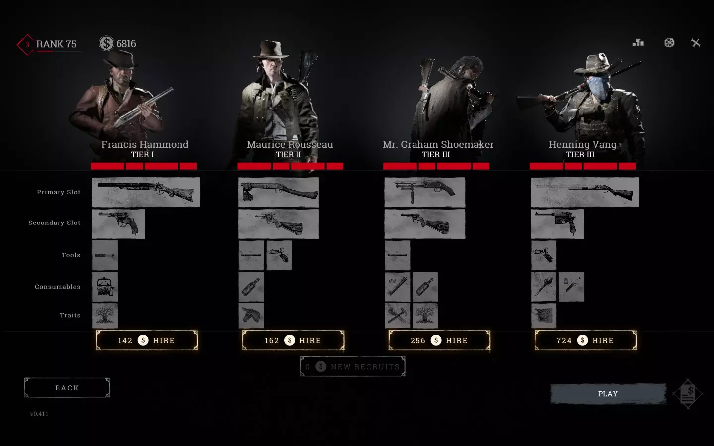 点击雇佣猎人按钮后,你会进入相应界面,系统会提供1到4名猎人供你购买,这些猎人的特定参数是随机生成的,具体如下: 猎人分为3个等级。等级决定了角色的外观以及购买时所拥有的装备和技能。初始状态下,你只能获得1级猎人。当您达到33级【传承】等级时,将解锁2阶猎人。达到66级时,将解锁3阶猎人。 姓名:猎人会获得随机生成的名和姓,有时还会带有昵称。 外观:面部随机生成,服装同样随机生成,但会与猎人的阶位相匹配。例如,T1猎人主要穿着白色衬衫,这对他们的伪装产生负面影响,而T3猎人则穿着深色西装,搭配马甲等类似服饰。 生命值条样式。关于这一点将在“2.2 生命值”部分详细说明。我只想指出,这是我选择猎人时最重要的参数。 装备。猎人购买后携带的物品。当然(而且在高等级时通常就是这样),你可以出售部分或全部物品,然后根据自己的喜好为猎人配备装备。有关这方面的详细信息,请参见“3. 装备”部分。 特长。有些猎人在购买时就可能拥有某些特长,这无疑是件好事。有关这方面的详细信息,请参见“4. 特长”部分。 1.3 商店
