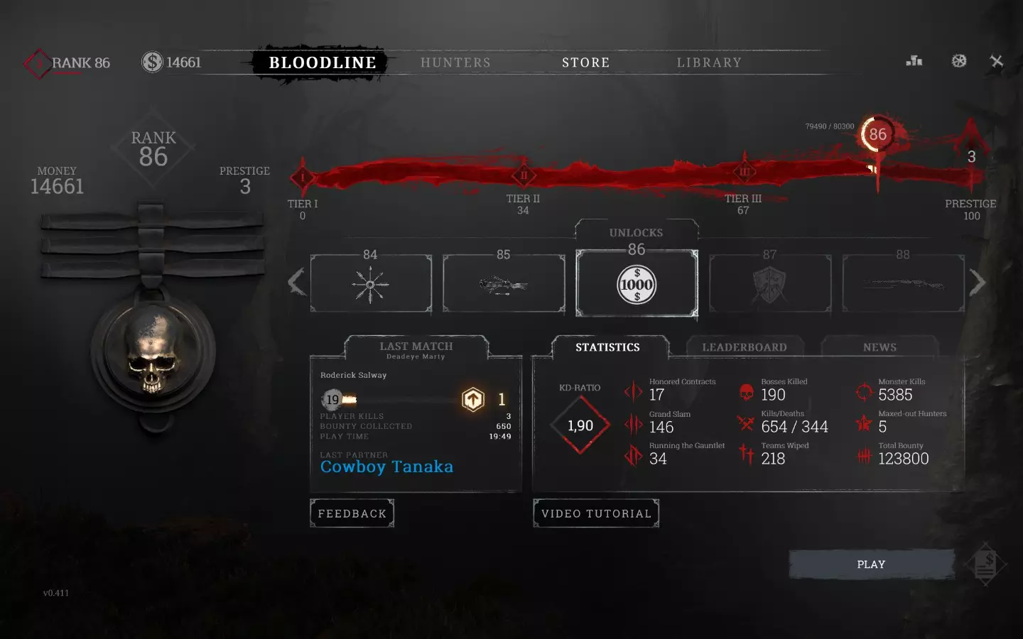 此标签页负责您的账户进度(传承)。您的账户有等级,提升等级需要您的猎人在比赛中获得经验值(XP)。每升一级,您将解锁新的武器/工具/消耗品/ perk或获得金钱。此外,每获得4000 XP,您将获得666美元。传承的最高等级为100级。达到100级后,声望按钮将被激活。与其他游戏类似,晋升【声望】会使你回到1级,并失去所有金钱、装备和猎人。不过,你的【声望】计数器会被保留。开发者计划添加声望奖励(很可能是猎人外观),目前每个声望会略微加快猎人等级的升级速度(非传承),并稍微改变该标签页屏幕左侧的声望徽章。 在下方你可以查看你的账户统计数据或你的猎人统计数据。 1.2 猎人