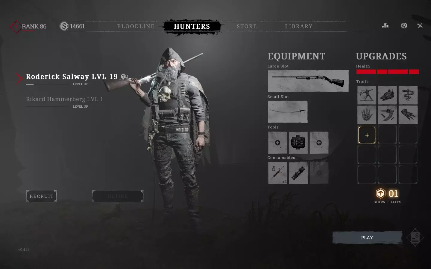 1. 在这里你可以购买武器、工具和消耗品,还能管理自己的仓库,用于存放从猎人身上获取的物品或提前储备的物资等。 2. 猎人 2.1 经验 每个猎人都有独立的等级。新购买的猎人初始等级为1级,最高等级为50级。您的猎人在对局中几乎所有行为都能获得经验值提升等级,每升一级可获得一个等级点数,这些点数可用于为该猎人购买技能,或者在万不得已时用于恢复“生命条”(详情见下文)。此外,当您的猎人获得一定量的经验值时,也会为您的传承增加经验。当您的猎人达到25级时,您可以将其退役。退役后,您将失去该猎人,其所有装备会被送往仓库,而您的【传承】将获得该猎人每级100点经验值(例如:退役30级猎人将为您提供30×100=3000点经验值)。 达到50级后,您的猎人获得的所有经验值将直接计入您的【传承】。2 生命值 初始状态下,所有猎人拥有150点生命值(HP)。猎人的生命值条由大格(每格50HP)和小格(每格25HP)组成。查看猎人界面的截图可以发现,选中的猎人生命值模板由大格-小格-大格-小格的顺序排列,即50-25-50-25,总和为150HP。为何这一点如此重要?生命值机制为:若受到的伤害未使整条血条耗尽,则该血条会在一段时间后开始恢复。生命值从右向左扣除,即我的猎人首先会消耗最右侧的25点生命值血条。例如,若该猎人受到12点伤害,这条血条会损失一半,猎人剩余生命值为138点。但几秒钟后,这格生命值会恢复,猎人将再次拥有150点生命值。如果猎人受到的伤害不是12点,而是例如30点,那么右侧的25点生命值格会完全清空,而它旁边的50点生命值格会承受剩余的5点伤害。此时猎人将拥有120点生命值。几秒钟后,承受5点伤害的生命值格会恢复,但完全受损的25点生命值格将保持为空。最终猎人将剩余125点生命值。要恢复空血条需要进行治疗,例如使用绷带。但这还不是全部。你的猎人不仅可能因不慎中弹而导致空血条,甚至可能直接失去它。如果被点燃,你的生命值条会从右向左缓慢燃烧。及时停止燃烧,按住【F】键可以让你避免不良后果,之后只需等待已烧焦的部分木柴缓慢恢复即可。但如果你反应迟缓,让木柴完全烧尽,它就会直接消失。以我们示例中的猎人来说,第一根木柴会先损失25点生命值。一旦发生这种情况,任何药品都无法将你的生命值恢复到125点以上。此外,当你进入【昏迷】状态时会失去一截右指骨(这种情况发生在组队游玩时,你被“击杀”后,队友可以将你扶起)。 通过这种方式失去的指骨只能通过两种方法恢复: 开始在地狱中猎杀Boss。此操作会为你恢复50点生命值(最高恢复至150HP),即使此前已失去部分或全部指骨,也会一并恢复。在【猎人】界面购买缺少的树枝。树枝可以用猎人等级点数购买,这些点数通常用于获取下文提到的技能。