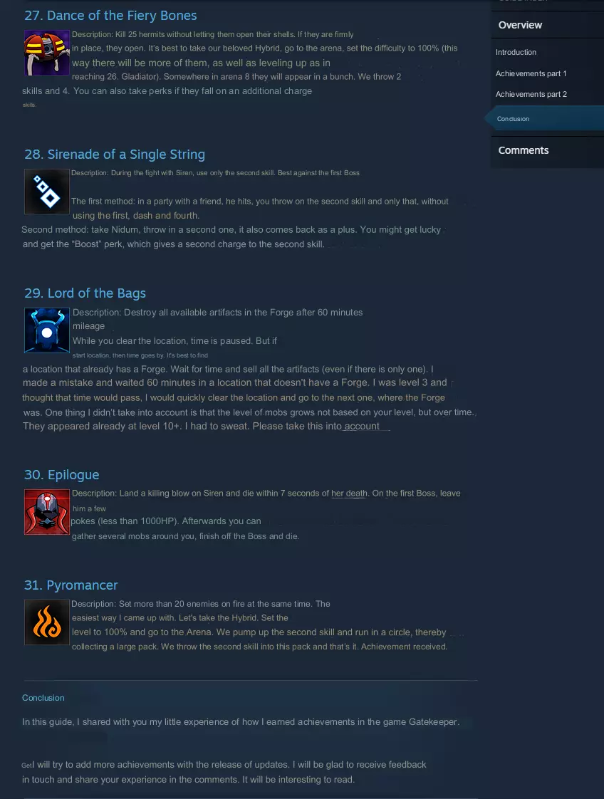 这是一篇翻译自Nuggi的《Gatekeeper》全成就获取指南,原指南详细介绍了该游戏31项成就的达成方法,包含任务要求、操作技巧等内容,不过该指南截至2024年12月已过时。