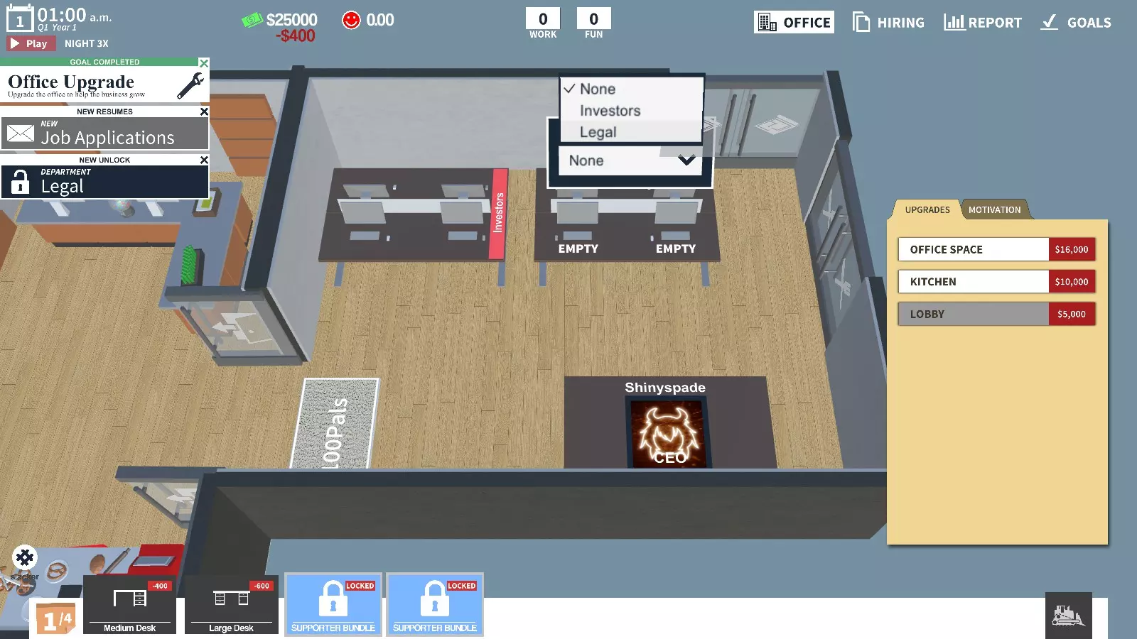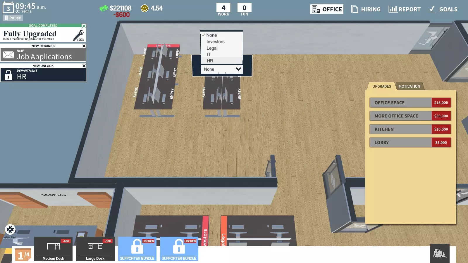 完全升级 将办公室升级到最高等级 在合适的位置放置2张大型办公桌(现在影响不大)。可以将它们都设为投资者办公桌,或者1张投资者办公桌和1张人力资源办公桌。我不确定这个选择是否真的重要。