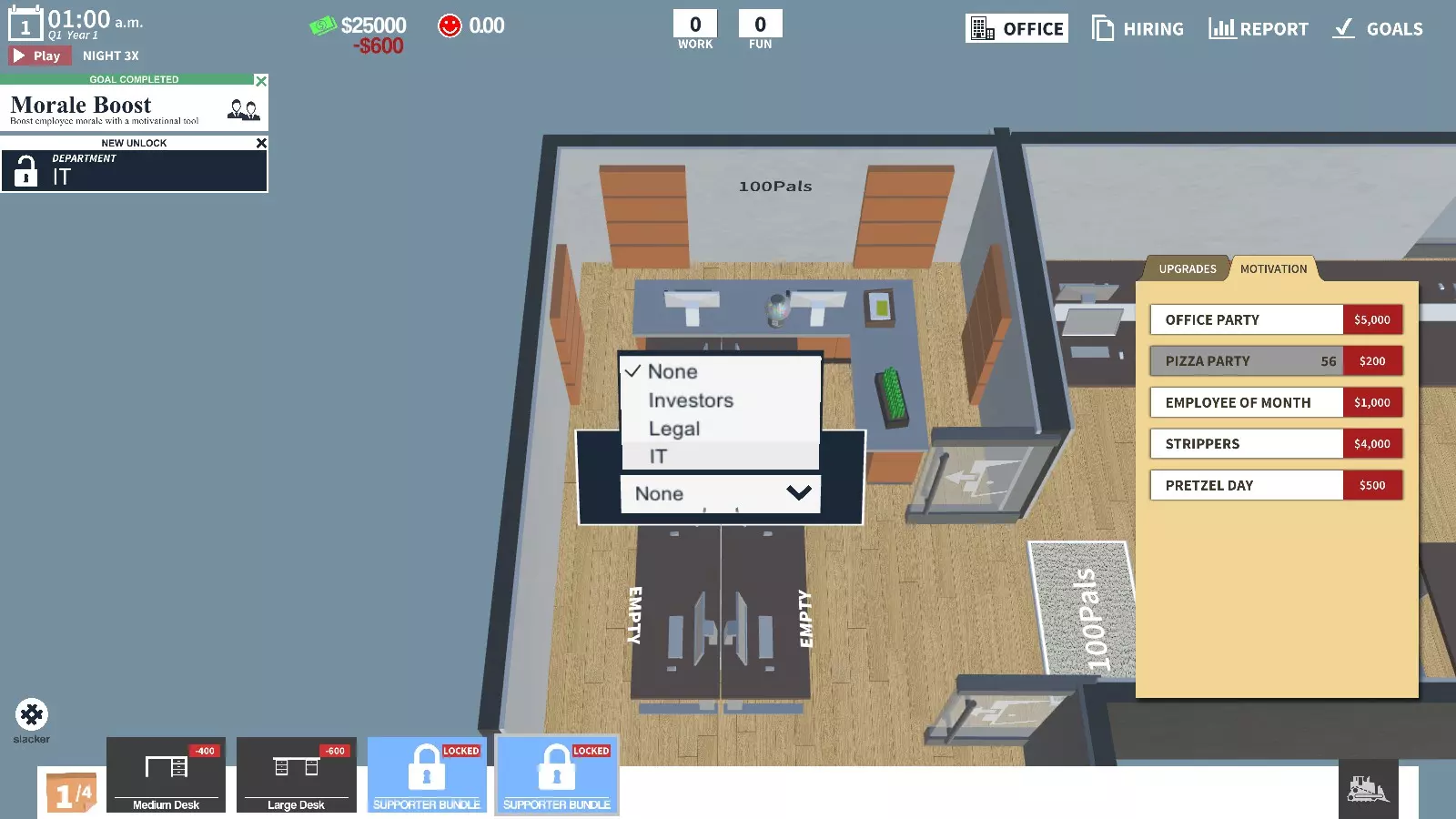 前往招聘菜单并进入法务部门,雇佣前4名人员。在上述升级菜单中,选择激励选项,然后购买披萨派对。